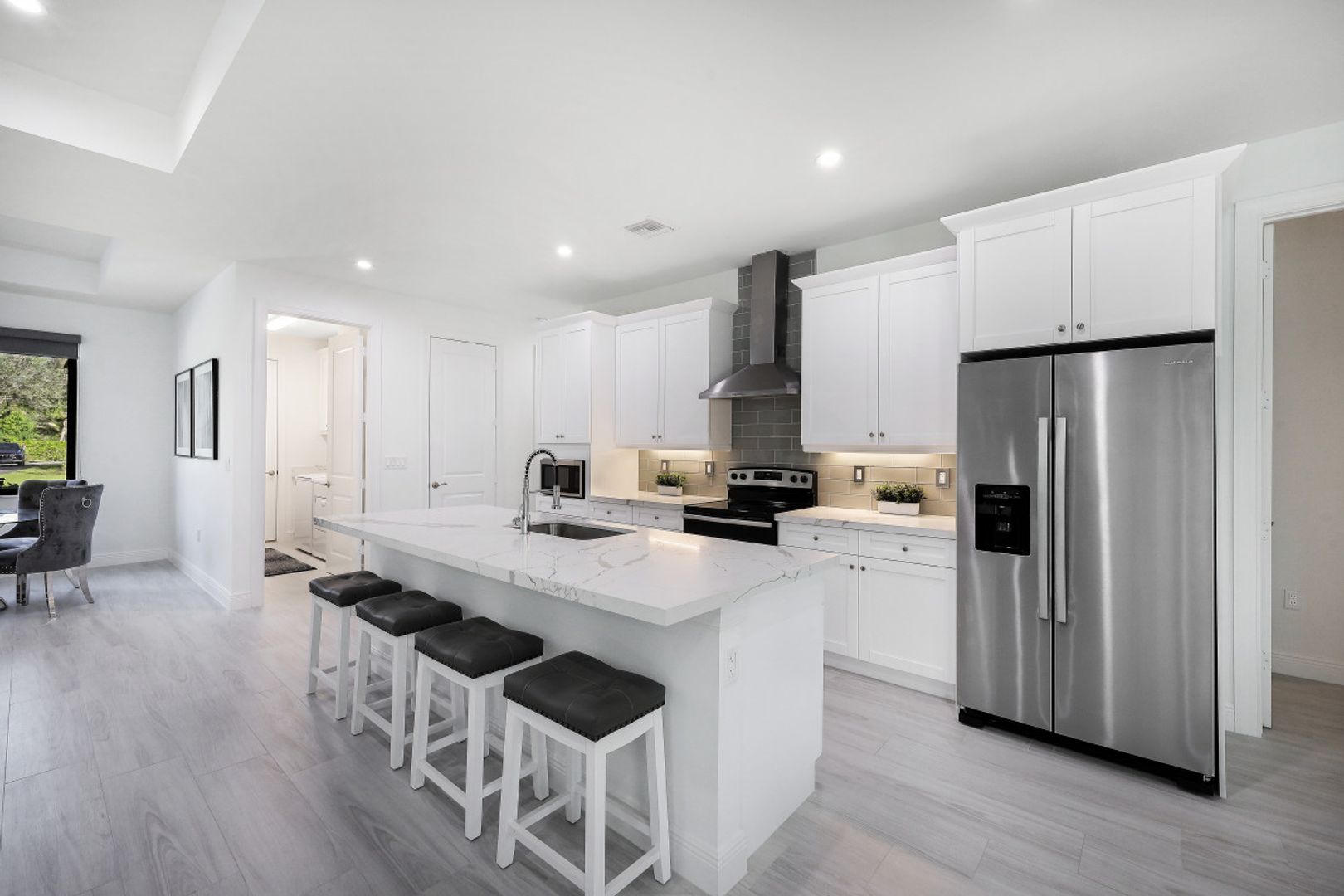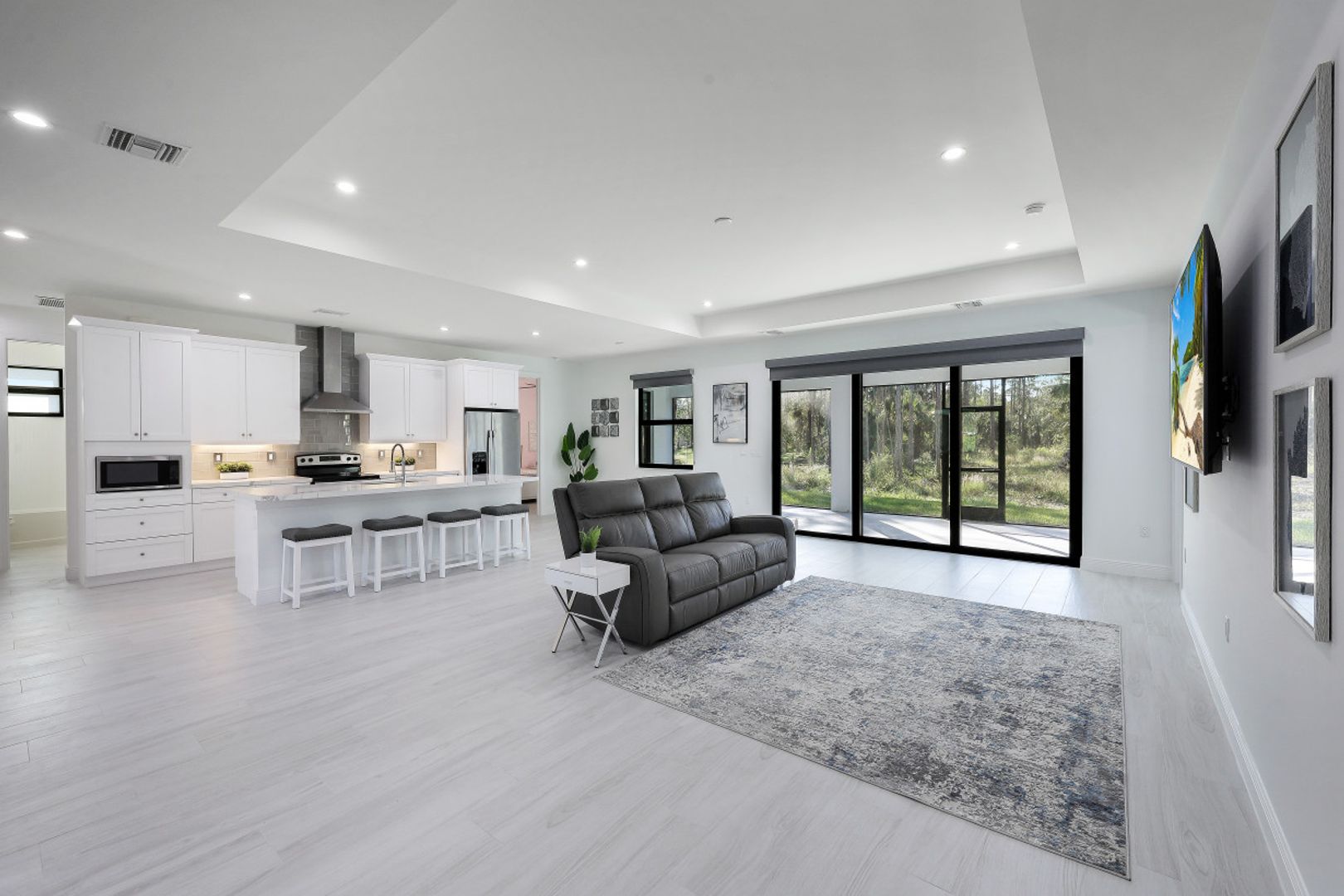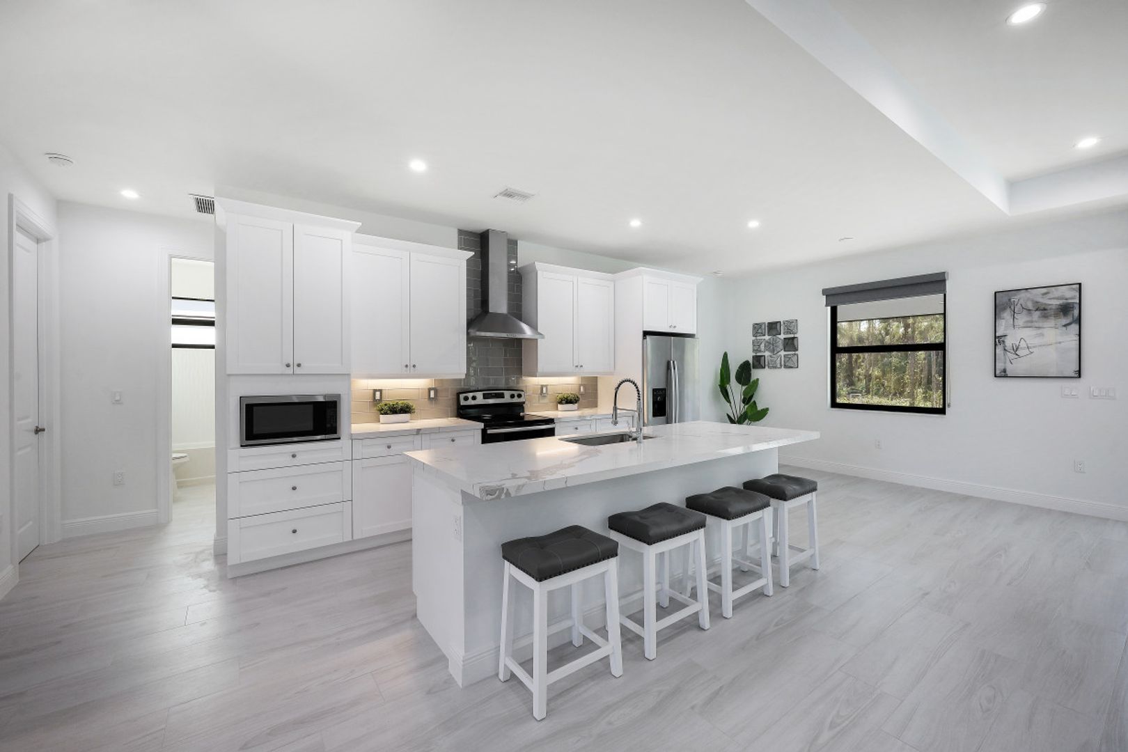 This BRAND NEW 2200 sq ft home features a light and bright great room style floorplan with 4 Bedroom, 3 Full Bath, and oversized 3 Car Garage. Wood look plank tile will be found throughout the entire home (no carpet anywhere) along with white shaker cabinets in the kitchen & baths complimented by Level V quartz countertops (double thick in kitchen). Modern solar shade window treatments cover the IMPACT WINDOWS/DOORS throughout the entire home. The expanded 31'x13' covered and screened lanai lends itself to Al Fresco dining and entertaining family & friends. Other fine appointments include: Whole House Reverse Osmosis; spray foam insulation; 42" kitchen cabinets with under cabinet lighting; SS appliances including vented range hood; and frameless shower doors. 2.27 acre lot in a desirable section of Golden Gate Estates. DEP Report available.