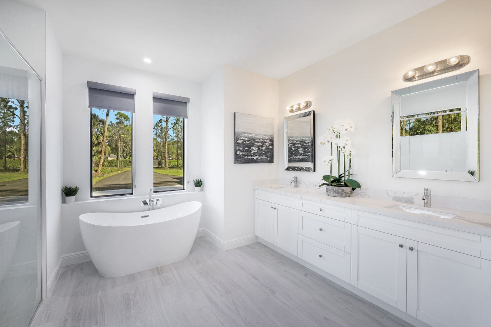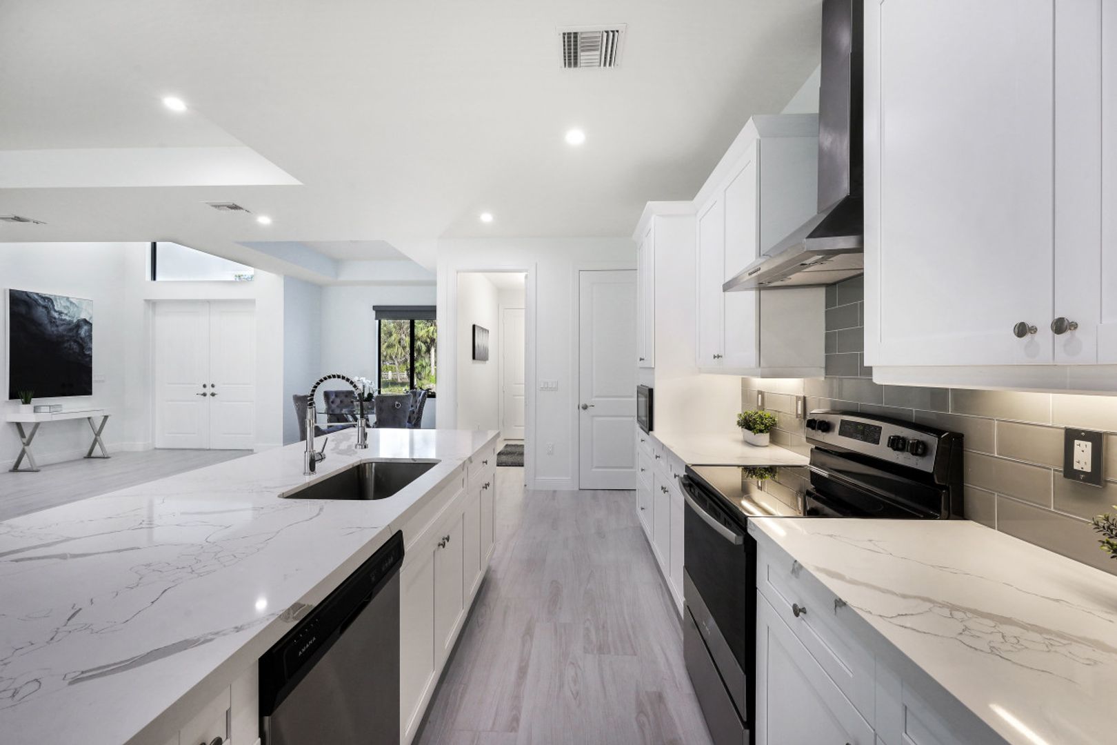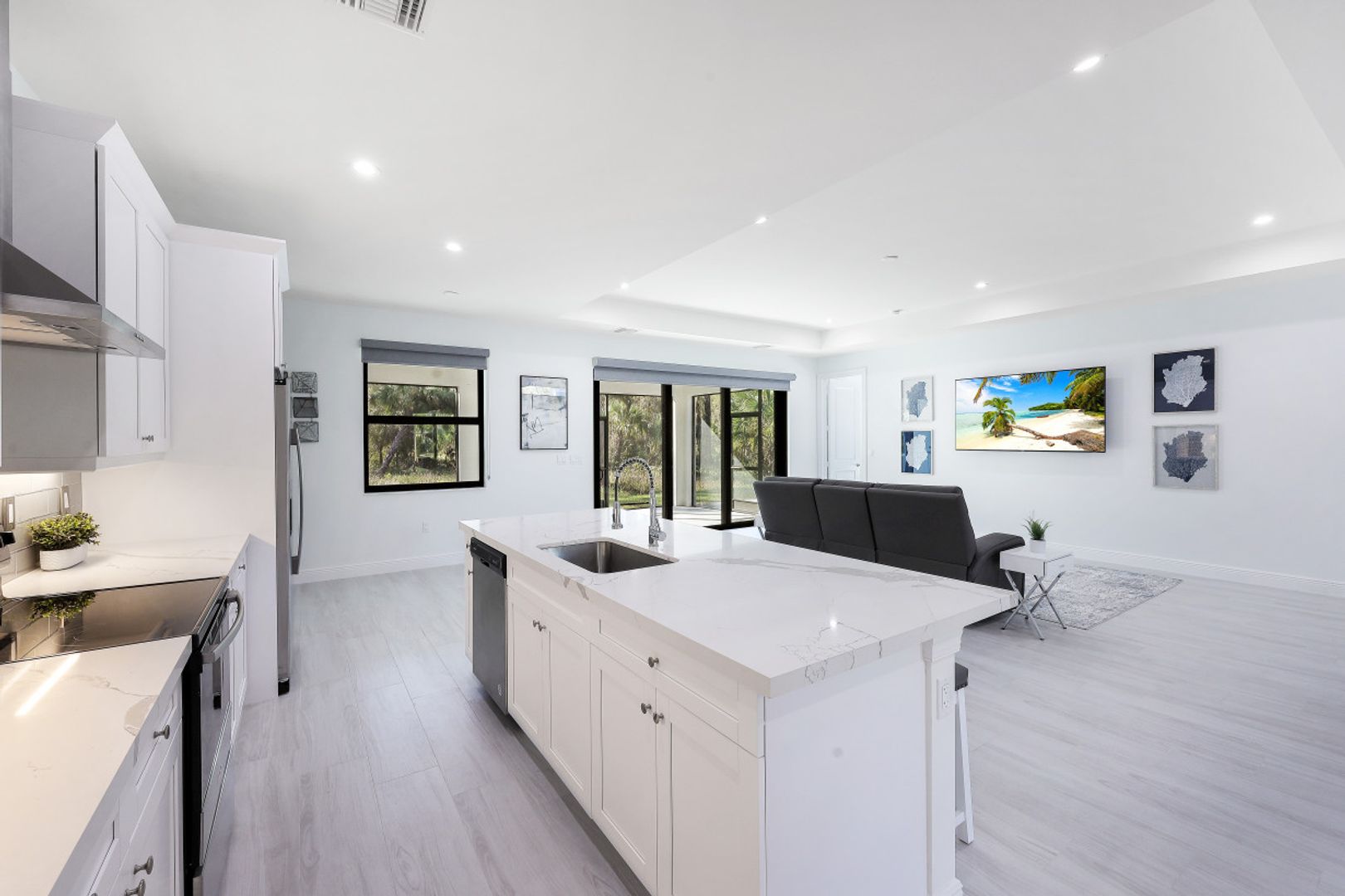 This BRAND NEW 2200 sq ft home features a light and bright great room style floorplan with 4 Bedroom, 3 Full Bath, and oversized 3 Car Garage. Wood look plank tile will be found throughout the entire home (no carpet anywhere) along with white shaker cabinets in the kitchen & baths complimented by Level V quartz countertops (double thick in kitchen). Modern solar shade window treatments cover the IMPACT WINDOWS/DOORS throughout the entire home. The expanded 31'x13' covered and screened lanai lends itself to Al Fresco dining and entertaining family & friends. Other fine appointments include: Whole House Reverse Osmosis; spray foam insulation; 42" kitchen cabinets with under cabinet lighting; SS appliances including vented range hood; and frameless shower doors. 2.27 acre lot in a desirable section of Golden Gate Estates. DEP Report available.