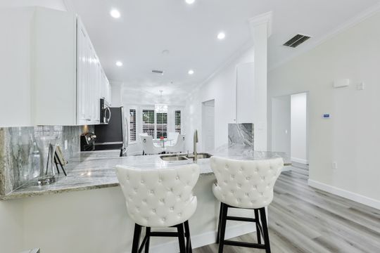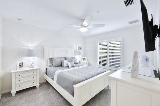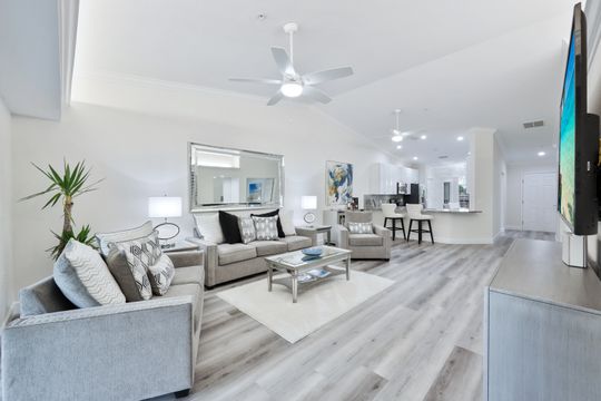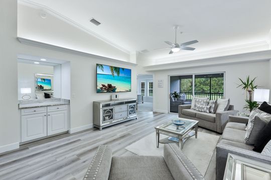 NAPLES' BEST VALUE! This immaculate SECOND FLOOR END UNIT 2 Bedroom+Den, 2 Bath, 1 car garage condo offers lake, golf course, and preserve views and is located in one North Naples' most desirable RESORT STYLE country club communities - Heritage Bay. A FULL GOLF MEMBERSHIP is included with this property with access to a 27 hole championship golf course and the recently remodeled "Club at Heritage Bay" which offers: resort pool with beach entrance; pool side bar & grille; formal & informal dining rooms; 7 tennis courts; bocce courts; pickle ball courts; 8,000 sq ft fitness center; tennis & golf pro shoppes; activities director; and social events galore! This condo has been completely remodeled over the last 2 years: new wood look flooring & new carpeted bedrooms; crisp white painted cabinetry with modern granite; fresh paint throughout; plantation shutters; updated lights & fans; crown molding; 4yo AC; and more! TWO lanais! IMPACT WINDOWS! Reasonable dues of $12,184/year which includes FULL golf & club privileges, cable TV, internet, water/sewer, building insurance, building maintenance, 24/7 manned gate, 5 satellite pools throughout the community, & all common ground maintenance.
