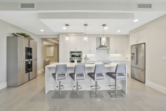 This exceptional Naples Square Penthouse offers one of the community’s finest views, with sweeping southern and eastern exposures and an expansive wraparound lanai that creates effortless indoor–outdoor living. Fully furnished and professionally designed by Robb & Stucky, this move-in-ready luxury residence features premium finishes throughout, including elegant ceiling treatments, upgraded porcelain tile, a gourmet kitchen with quartz countertops, newly installed high-end appliances, and a built-in bar with a wine fridge.