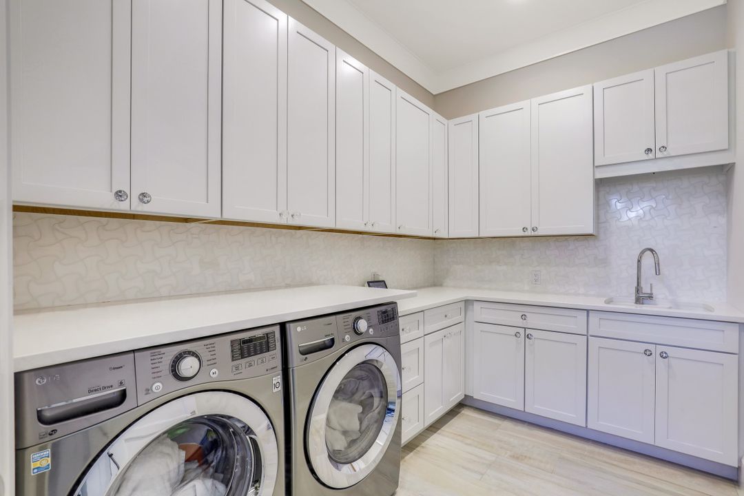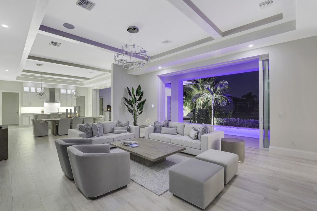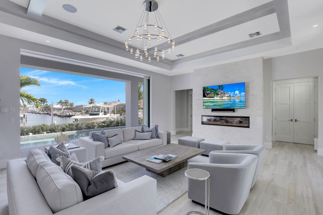BETTER THAN NEW WATERFRONT CONSTRUCTION with long water views. This exceptionally well built all concrete 5 bedroom 5 & half bath home boasts super high end finishes. It features wood look tile throughout, exotic Quartz countertops, shaker cabinetry, Thermador appliances, soaring ceilings, 10 ft tall pocketing sliders, custom closets and an elevator. A full home Sonos system and security system can all be controlled from the smart home iPad. There is a separate in-law suite on the main floor with a private entrance for longer quest stays with its own private lanai. Upstairs features 2 bedroom suites, a wet bar, and a surround sound home theater loft area that is flanked by two balconies. The custom pool is long enough for laps and the completely private in ground spa is perfect for relaxing after a long day on the boat or at the beach. A custom dock has been installed for up to a 38 foot boat with a 13+ foot beam on a 24k lift, 2 jet ski lifts, underwater lights and shore power. Quick Gulf access and super close proximity to Resident’s Beach access are sure to please boaters and beachgoers! The home is being sold fully furnished with all Restoration Hardware furniture throughout.