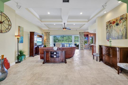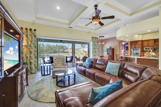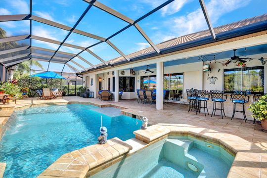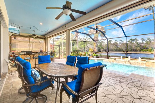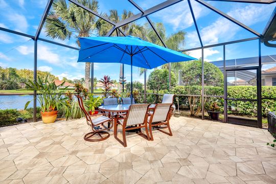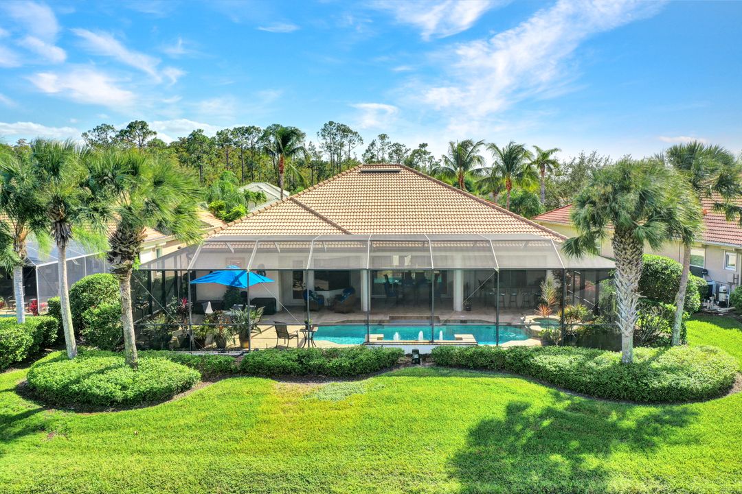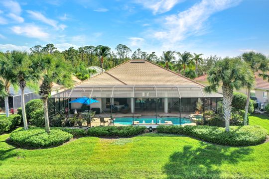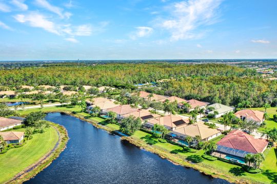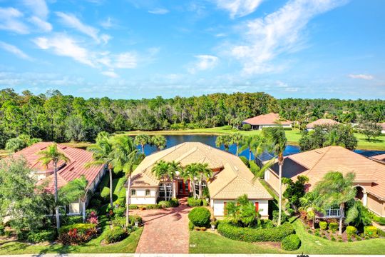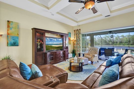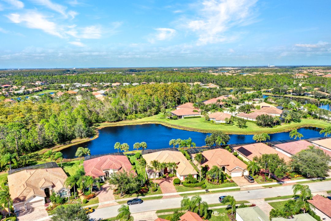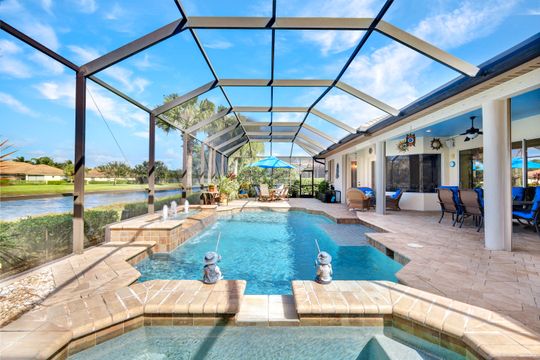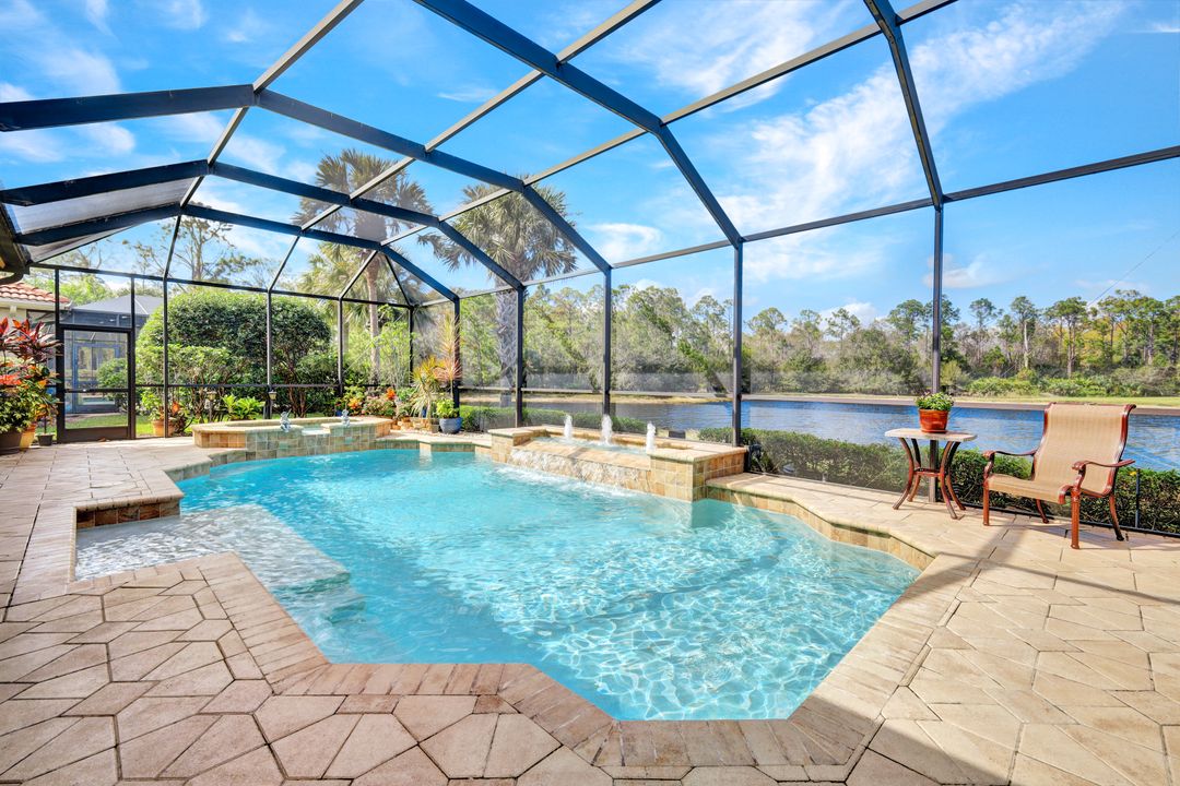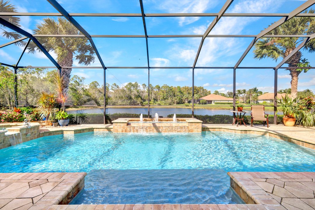 Stunning architectural details pair with the finest options and upgrades in this pool residence with a peaceful lake view. A spacious living area with coffered ceilings opens entirely to the pool and spa area with an outdoor kitchen and extended lanai, perfect for entertainment and alfresco living. The custom-designed kitchen offers 42-inch cabinets with under-cabinet lighting, plenty of storage space, island with a second sink, double oven, range hood, granite countertops and a breakfast nook with a panoramic view and easy access to the pool area. Additional home features include hardwood flooring in all bedrooms, stone flooring in the main area, reverse osmosis filtration system, Bose surround sound in the main lining area, master bedroom and outdoor speakers on the lanai, recessed ironing board in the laundry room and additional parking space in front of the home. The electric shutters on the lanai and accordion shutters on all other windows provide safety and convenience during the storm season. Great location with easy access to I-75, the airport, baseball stadium and minutes from some of the best beaches, shopping, dining and entertainment in Southwest Florida.