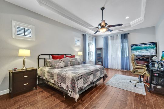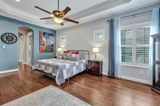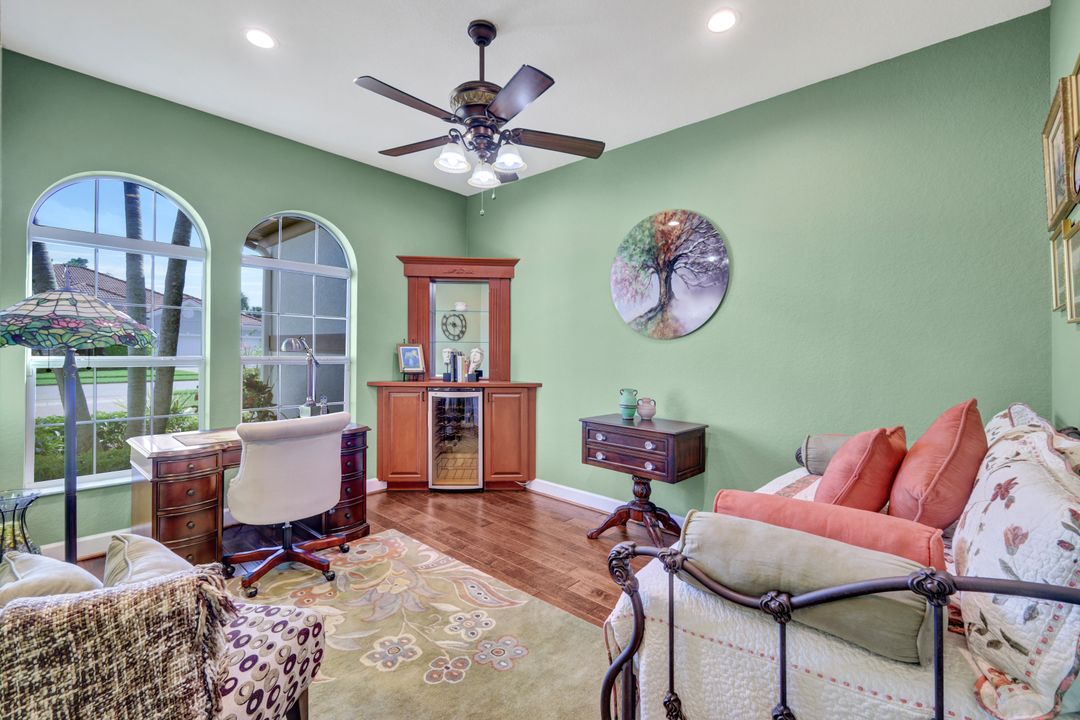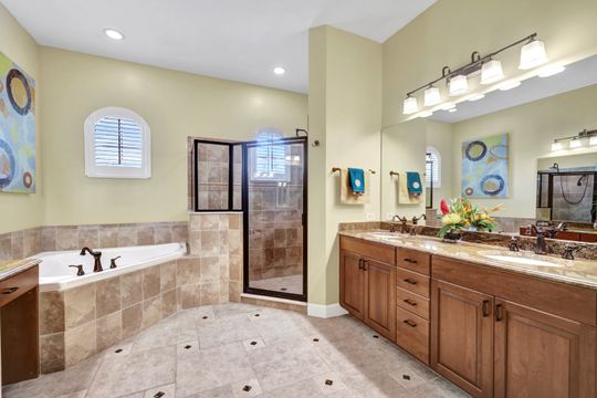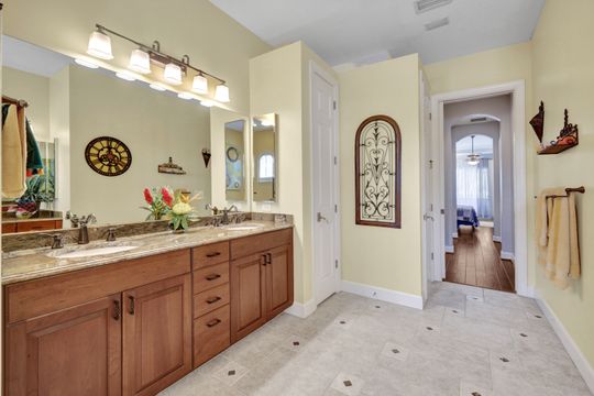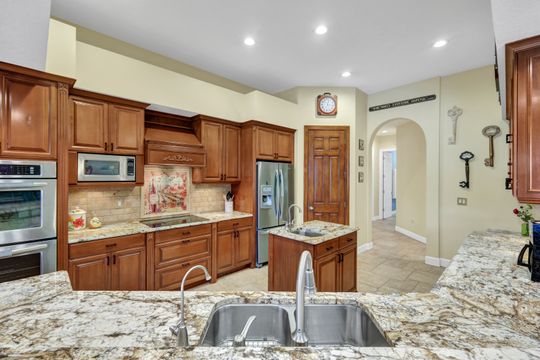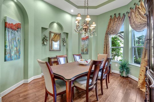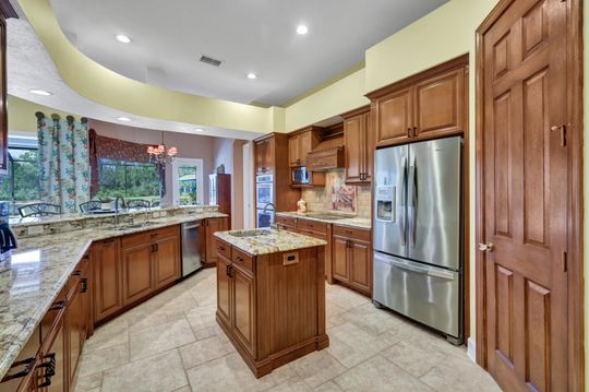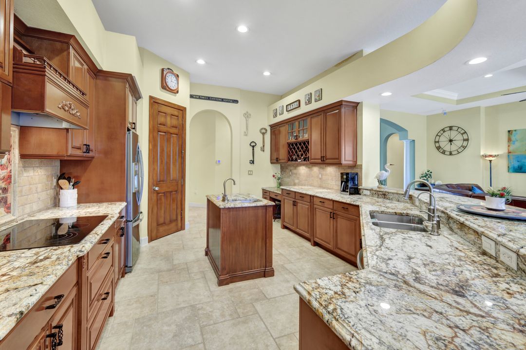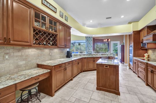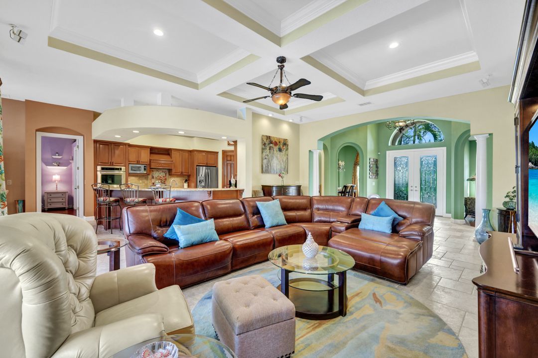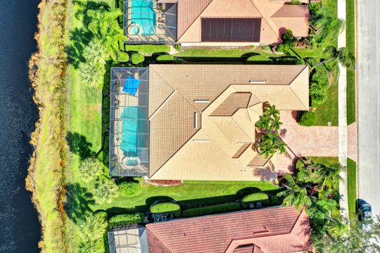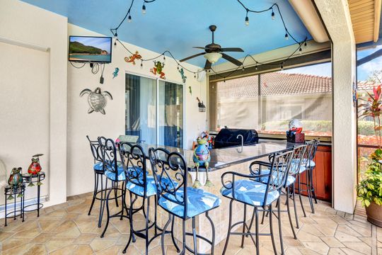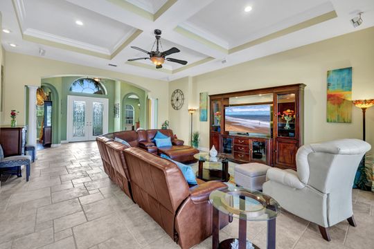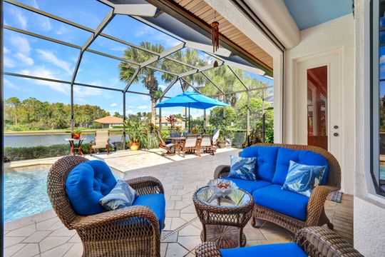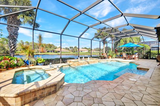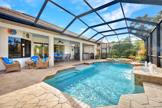Stunning architectural details pair with the finest options and upgrades in this pool residence with a peaceful lake view. A spacious living area with coffered ceilings opens entirely to the pool and spa area with an outdoor kitchen and extended lanai, perfect for entertainment and alfresco living. The custom-designed kitchen offers 42-inch cabinets with under-cabinet lighting, plenty of storage space, island with a second sink, double oven, range hood, granite countertops and a breakfast nook with a panoramic view and easy access to the pool area. Additional home features include hardwood flooring in all bedrooms, stone flooring in the main area, reverse osmosis filtration system, Bose surround sound in the main lining area, master bedroom and outdoor speakers on the lanai, recessed ironing board in the laundry room and additional parking space in front of the home. The electric shutters on the lanai and accordion shutters on all other windows provide safety and convenience during the storm season. Great location with easy access to I-75, the airport, baseball stadium and minutes from some of the best beaches, shopping, dining and entertainment in Southwest Florida.