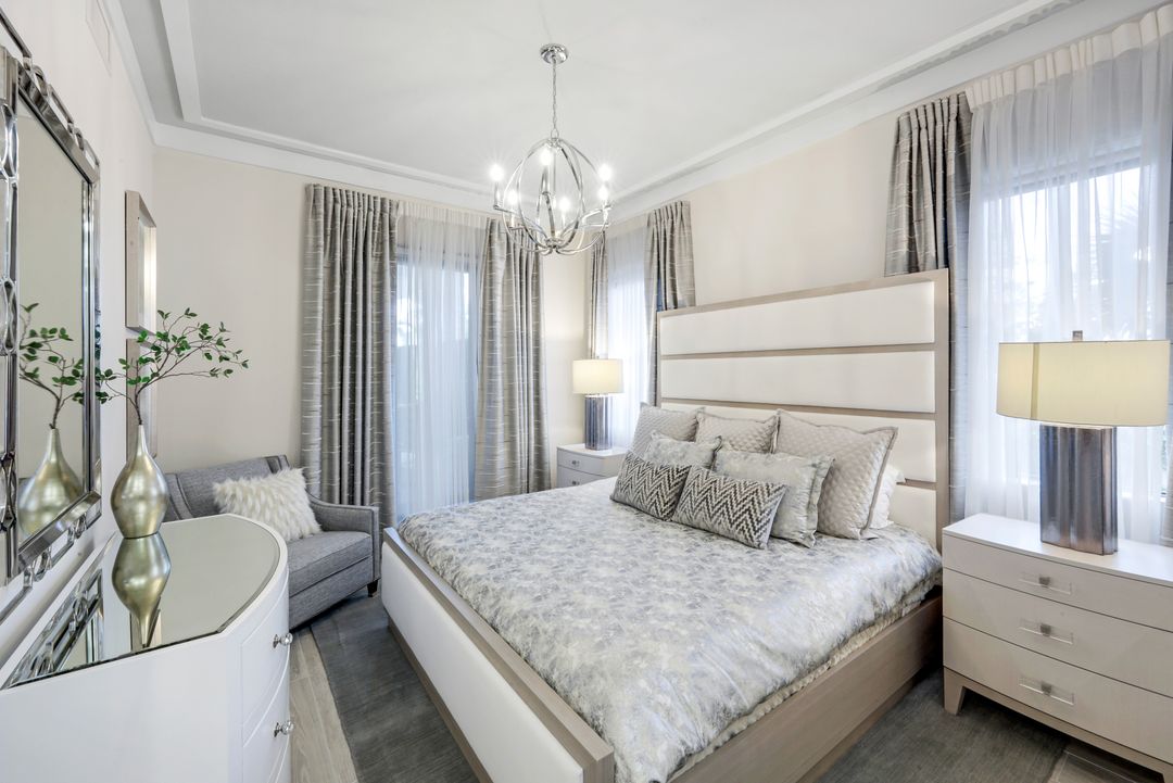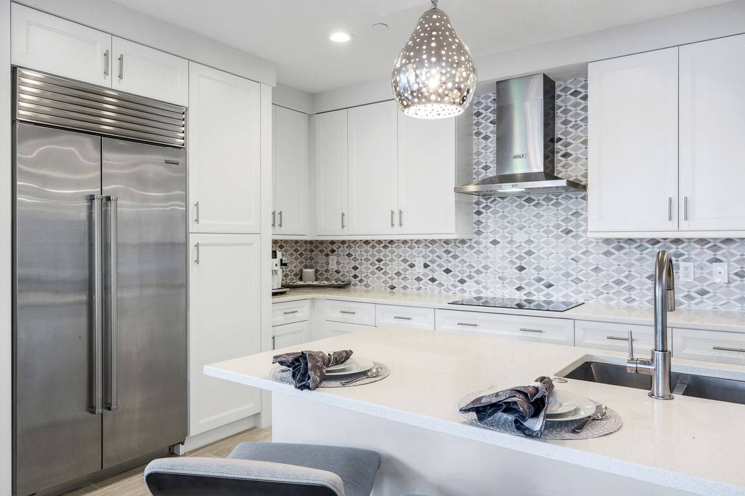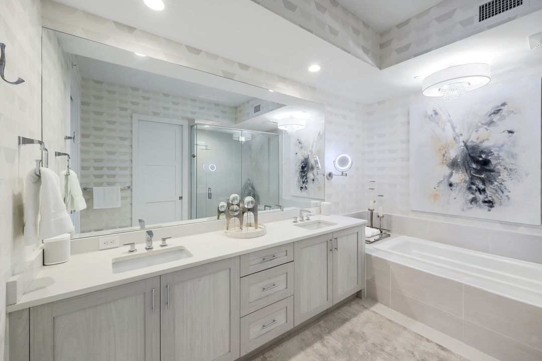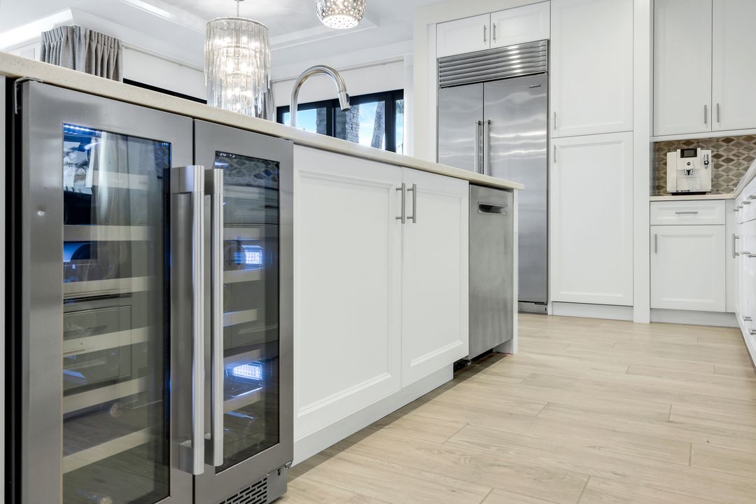 Designed for those with discerning taste, the residence features custom detailed ceilings and trim, custom designer lighting, and motorized blinds with custom drapery, creating a warm yet sophisticated ambiance. The chef’s kitchen is a true showpiece, outfitted with top-tier Sub-Zero and Wolf appliances, a spacious quartz island, wine refrigerator, and striking quartz countertops.