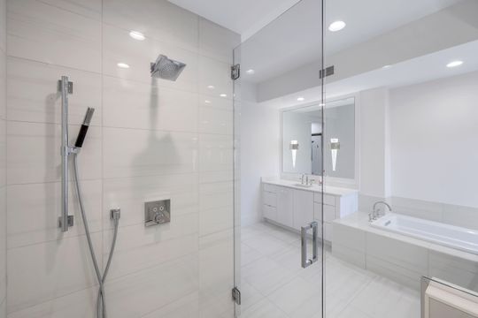 The same level of craftsmanship extends to the primary suite and two guest bedrooms, each offering a private ensuite bath and walk-in closet. A versatile den with custom frosted glass doors provides the perfect space for a home office or reading retreat.