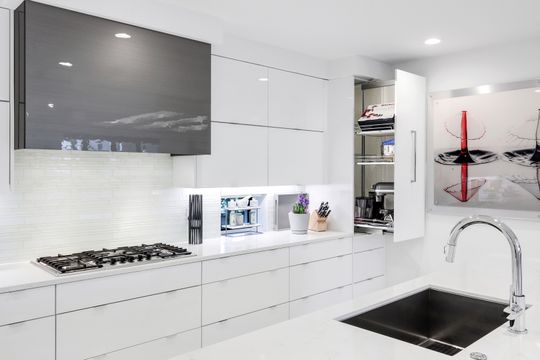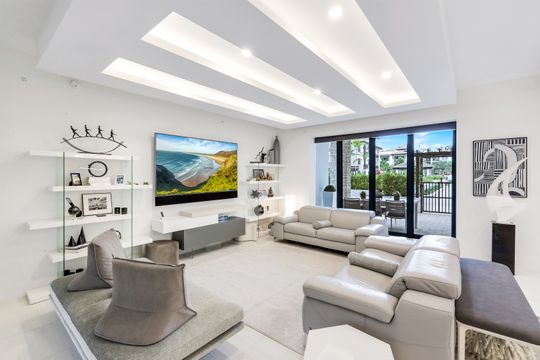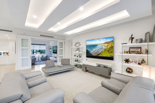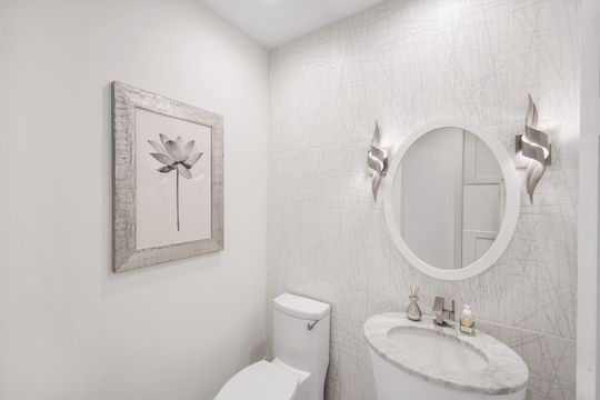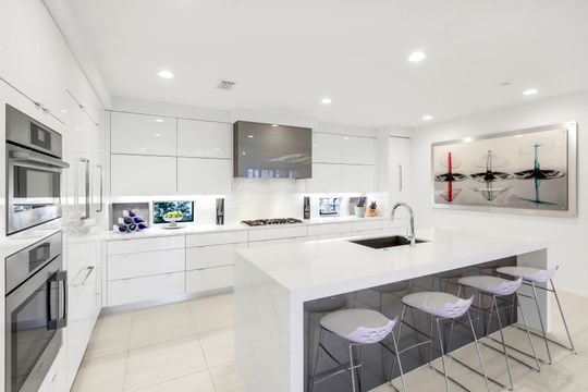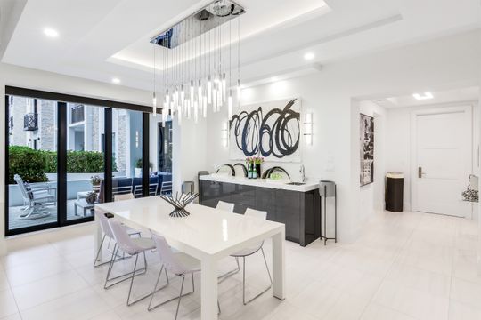 The gourmet kitchen is a chef’s dream, appointed with premium appliances, including a gas cooktop, built-in wall ovens, and a dedicated Miele coffee station. Sleek white cabinetry is beautifully complemented by stunning quartz countertops, while a built-in wet bar with sink and wine refrigerator enhances both everyday living and entertaining.