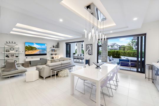 Rarely available southern-exposure, courtyard-level Emerson model featuring an extended lanai providing 3,464 square feet of refined indoor-outdoor living. Thoughtfully designed with no detail overlooked, this residence welcomes you with an elegant foyer that makes a striking first impression, showcasing luxurious tile flooring, custom ceiling treatments, architectural return vents, and designer lighting that flow beautifully throughout the entire residence.