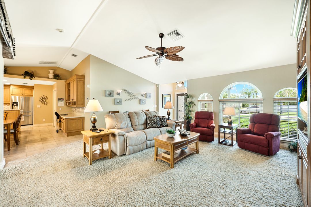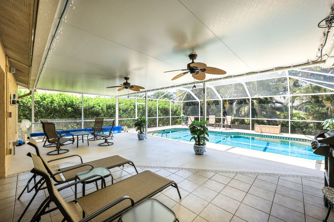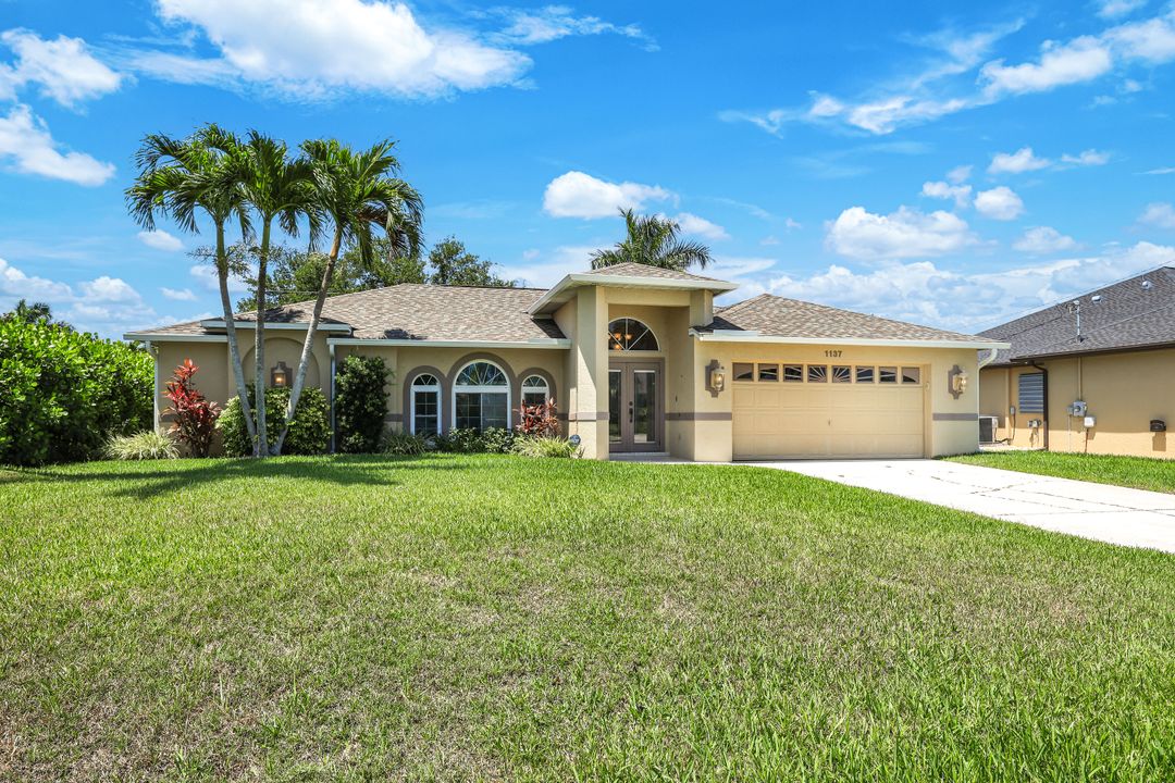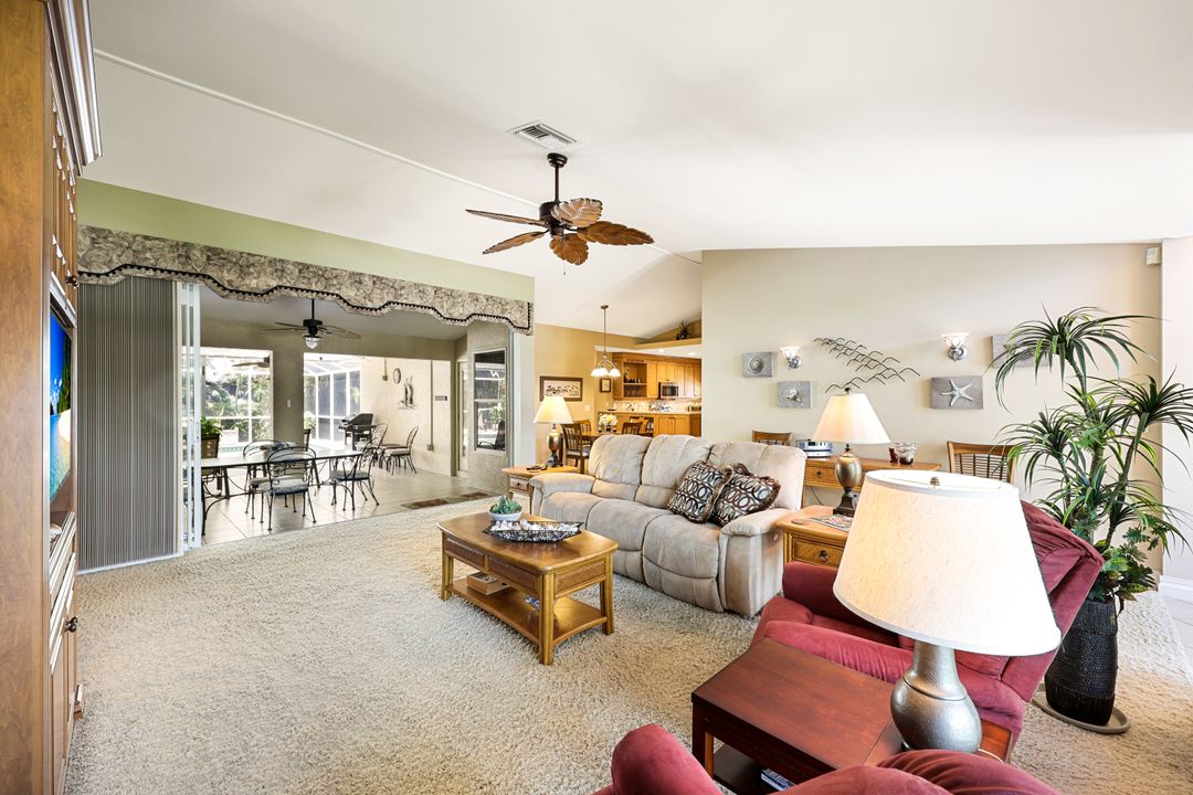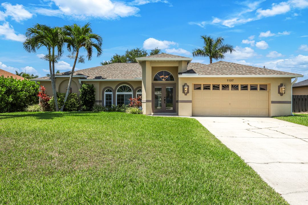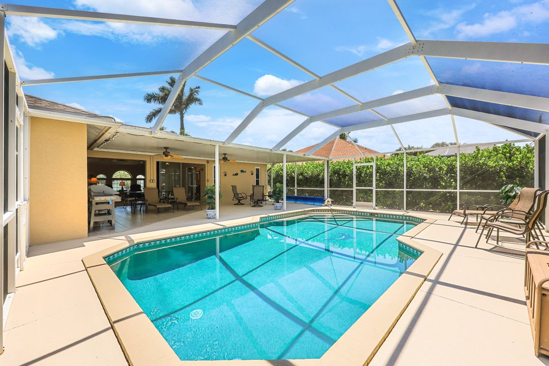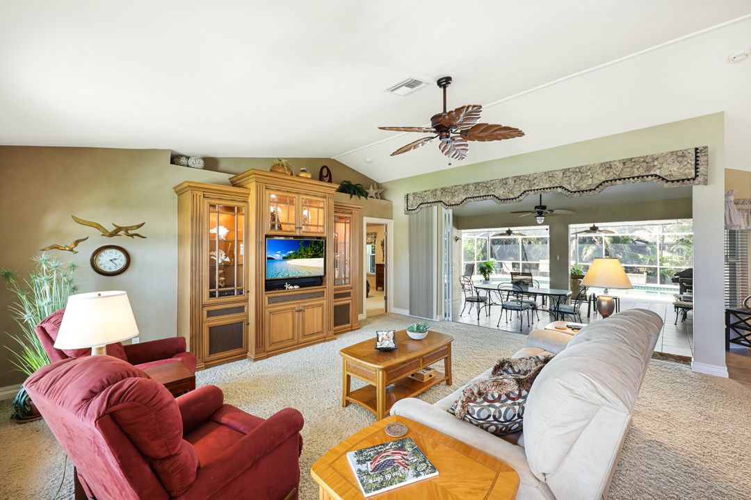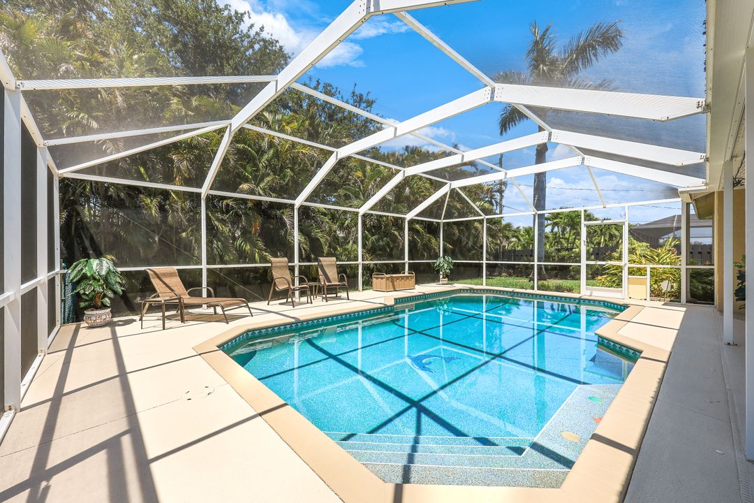 LOVINGLY MAINTAINED 3/2/2 POOL HOME! Step into your own private slice of the Florida lifestyle! From the moment you enter through the tiled front entry and elegant double doors, you'll be captivated by the soaring vaulted ceilings in the great room and the full wall of oversized pocketing sliding glass doors that open completely to the stunning lanai and pool area — ideal for seamless indoor-outdoor living. The spacious living room is anchored by a custom lighted entertainment center, and designer window treatments add an extra layer of style throughout the home. The chef-inspired kitchen features custom stain-resistant wood cabinetry, stainless steel appliances, sliding shelves, a lazy Susan, recessed lighting, and a reverse osmosis water system. The primary suite is a true retreat with private lanai access, walk-in closets, and a spa-inspired en-suite bath showcasing floating cabinets with under-cabinet lighting and a fully tiled walk-in shower. Two guest bedrooms offer built-in closets and shelving, enhanced by a custom wood feature wall and accent lighting creating a coastal and nautical theme. The home also features a versatile laundry room with upper cabinets, folding counter, and built-in pantry. Step outside to your covered entertaining area and enjoy the electric-heated, saltwater pool surrounded by privacy hedges and tropical landscaping. A dedicated pool bathroom offers extra convenience for guests. Additional highlights include a newer roof (2023), new hot water heater (2023), replaced lanai screens (2023), new pool pump and saltwater charger (2024), a two-car garage with ample cabinetry, custom blinds throughout, a fenced dog run, and water/sewer assessments paid in full. Best of all, this home is located in Flood Zone X! Perfectly positioned in the highly sought-after SW Cape, this beautifully maintained pool home is close to waterfront dining, marinas, and all the best coastal amenities Cape Coral has to offer. Whether you're hosting gatherings or enjoying quiet mornings by the pool, this home offers comfort, convenience, and timeless Florida charm.