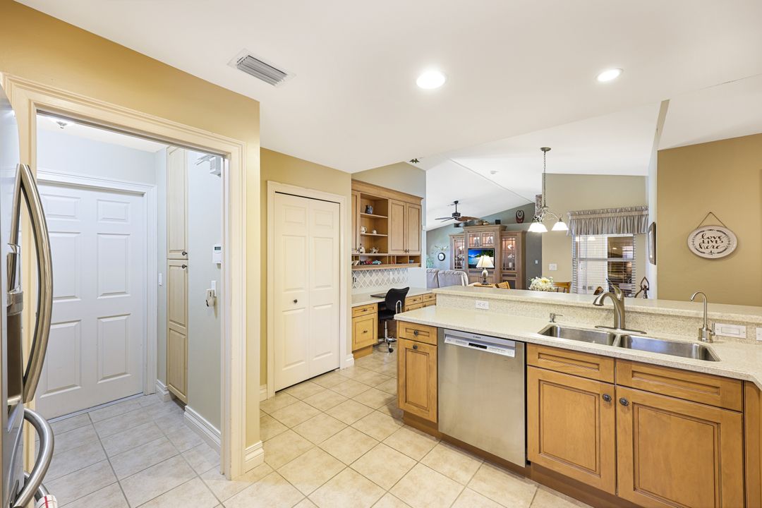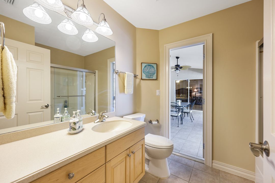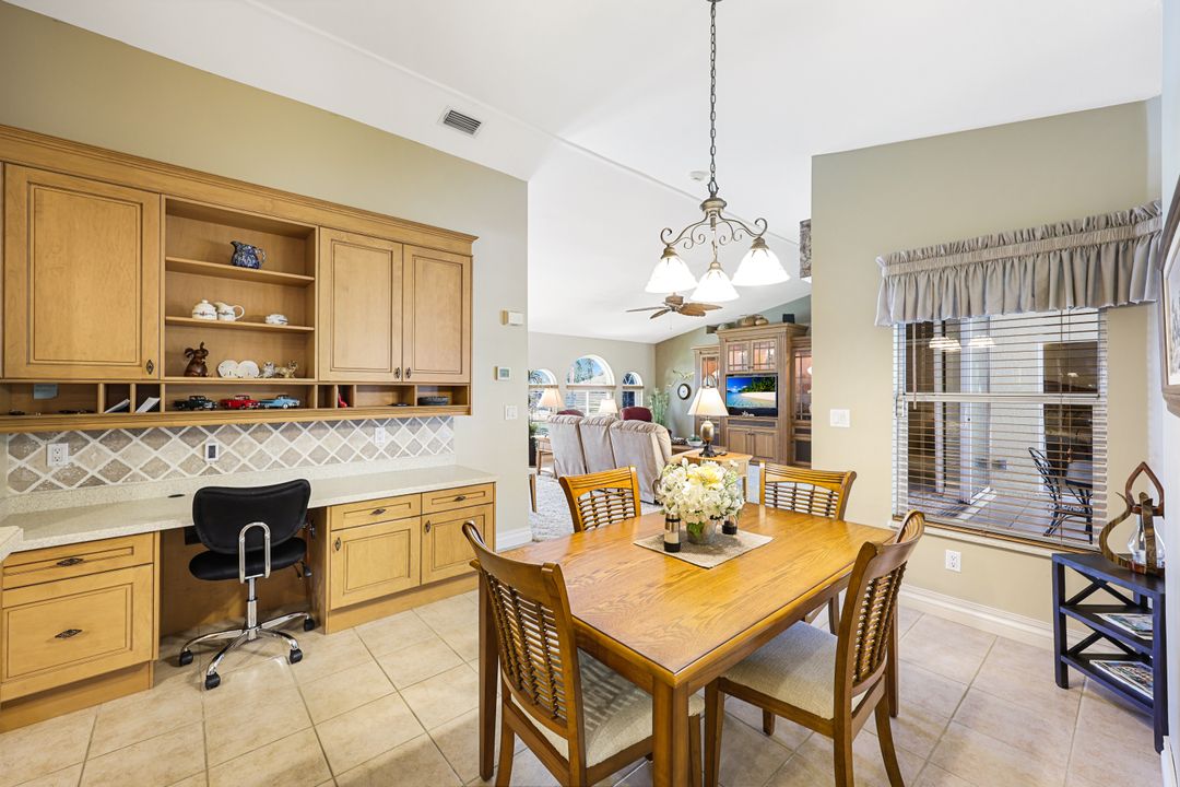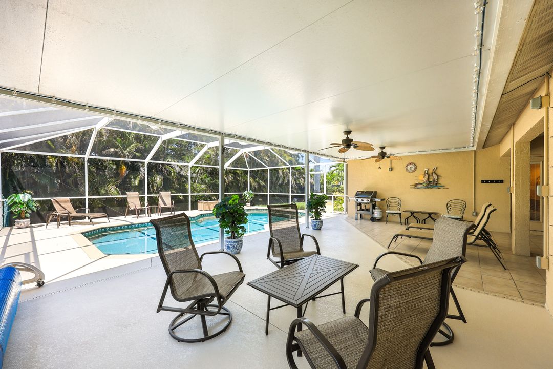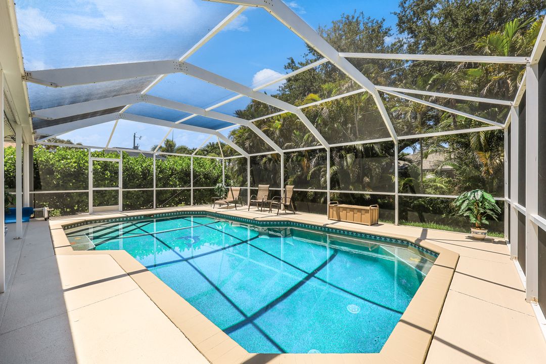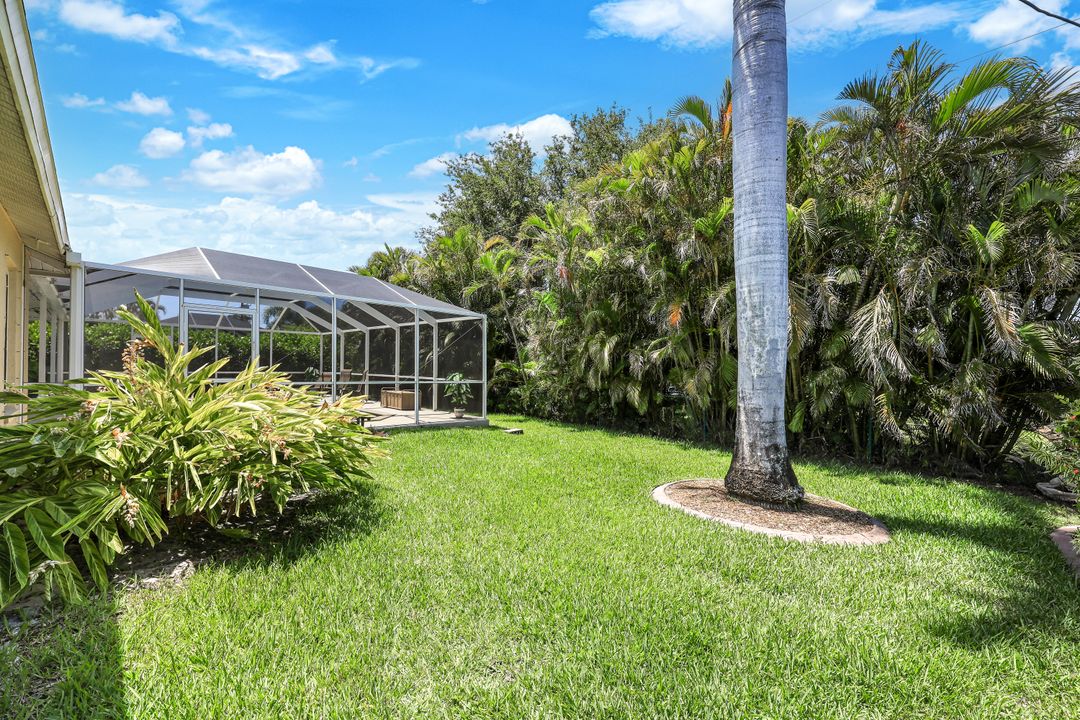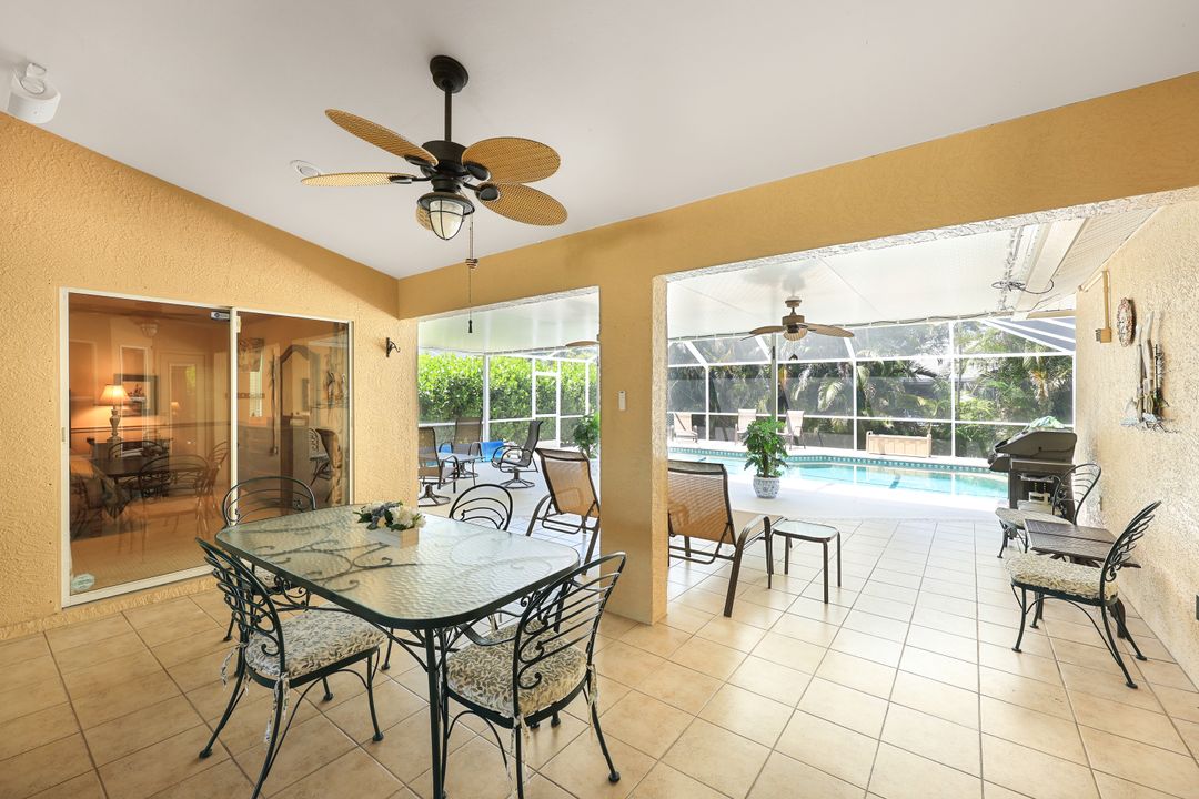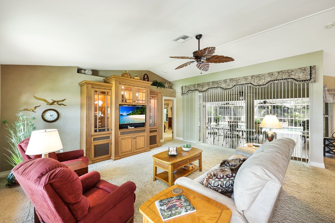 LOVINGLY MAINTAINED 3/2/2 POOL HOME! Step into your own private slice of the Florida lifestyle! From the moment you enter through the tiled front entry and elegant double doors, you'll be captivated by the soaring vaulted ceilings in the great room and the full wall of oversized pocketing sliding glass doors that open completely to the stunning lanai and pool area — ideal for seamless indoor-outdoor living. The spacious living room is anchored by a custom lighted entertainment center, and designer window treatments add an extra layer of style throughout the home. The chef-inspired kitchen features custom stain-resistant wood cabinetry, stainless steel appliances, sliding shelves, a lazy Susan, recessed lighting, and a reverse osmosis water system. The primary suite is a true retreat with private lanai access, walk-in closets, and a spa-inspired en-suite bath showcasing floating cabinets with under-cabinet lighting and a fully tiled walk-in shower. Two guest bedrooms offer built-in closets and shelving, enhanced by a custom wood feature wall and accent lighting creating a coastal and nautical theme. The home also features a versatile laundry room with upper cabinets, folding counter, and built-in pantry. Step outside to your covered entertaining area and enjoy the electric-heated, saltwater pool surrounded by privacy hedges and tropical landscaping. A dedicated pool bathroom offers extra convenience for guests. Additional highlights include a newer roof (2023), new hot water heater (2023), replaced lanai screens (2023), new pool pump and saltwater charger (2024), a two-car garage with ample cabinetry, custom blinds throughout, a fenced dog run, and water/sewer assessments paid in full. Best of all, this home is located in Flood Zone X! Perfectly positioned in the highly sought-after SW Cape, this beautifully maintained pool home is close to waterfront dining, marinas, and all the best coastal amenities Cape Coral has to offer. Whether you're hosting gatherings or enjoying quiet mornings by the pool, this home offers comfort, convenience, and timeless Florida charm.