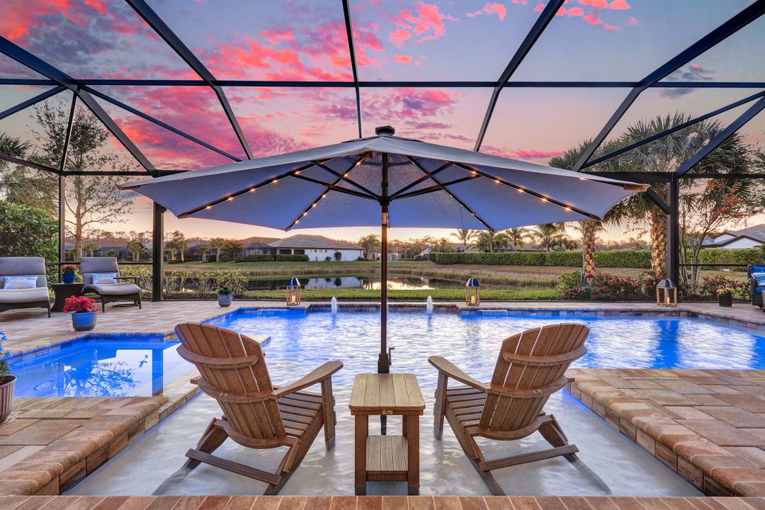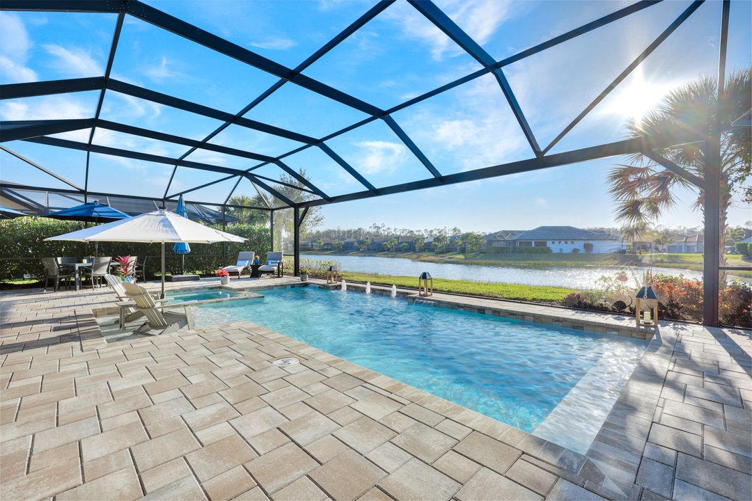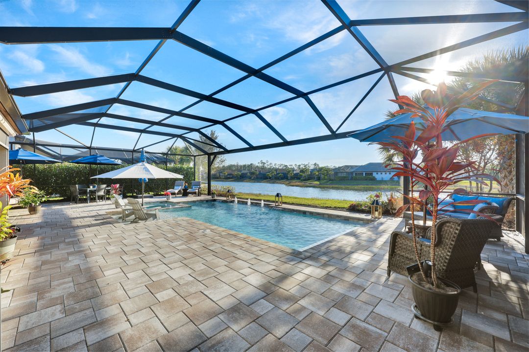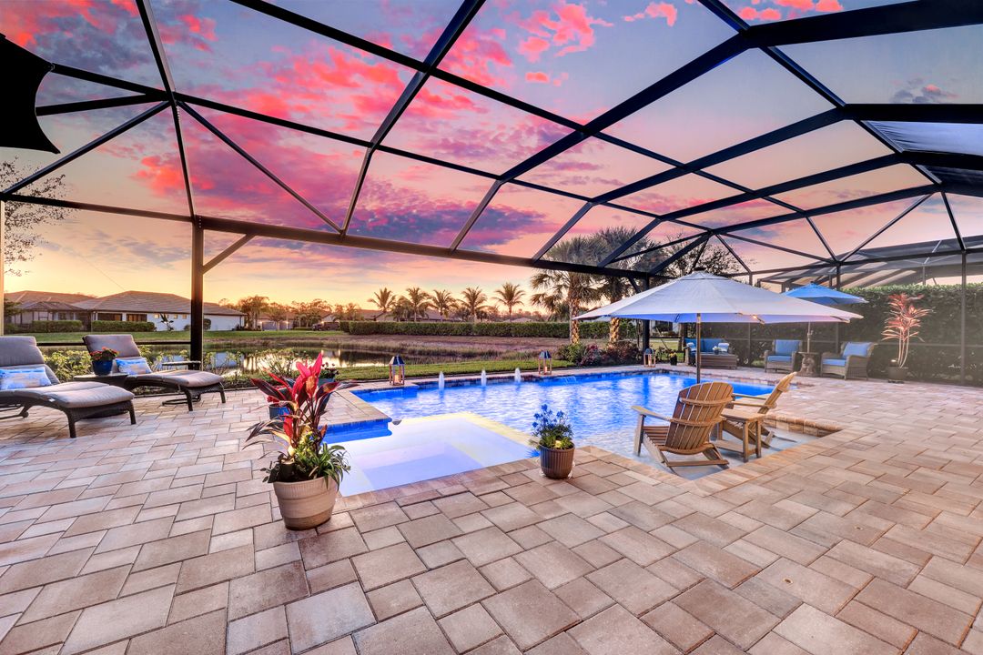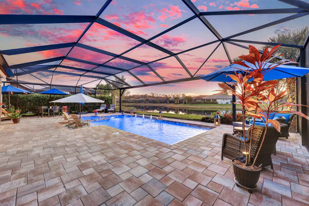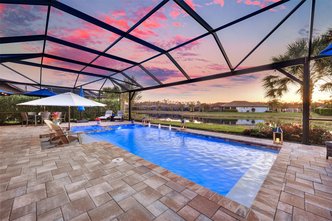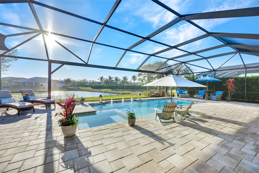 Lakefront Pool Home in Bridgetown at The Plantation. Situated on a Premium Lot overlooking the expansive lake with no homes behind for a private waterfront view. Southwestern Exposure provides the most sunlight on your pool area and magical waterfront sunsets each evening. This upgraded Pinnacle Model offers 2,488 Sf living with 3 Bedrooms plus a private office, 3 Full Bathrooms, and a 3 Car Garage. Upon walking in you will notice this home has more features than most in the community including the kitchen with a custom center island with bar top seating, KitchenAid appliance package, white shaker cabinetry, pantry with built-in shelving, and coffee bar / dry bar with beverage fridge. Soaring volume ceilings, crown molding, a neutral color palate, and large format tiles create a timeless and bright feeling throughout the living space. The living room and dining overlook the lake out of the 90-degree sliding glass doors that pocket and open for true indoor and outdoor living. The Master Suite overlooks the beautiful views and features a glass door to the pool – a custom addition to this model. The Master bathrooms have dual vanities, a soaking tub, a glass walk-in shower, and a huge walk-in closet with built-ins. Each bedroom is large and thoughtfully designed for guests and families from the window coverings to the built-in closet shelving. The private office makes working from home a breeze. Enjoy Florida’s weather in a resort-style pool area – A heated Pool with an integrated hot tub. The pool features every conceivable upgrade including a sun shelf with umbrella holder, fountains, waterfalls, color-changing pool lights, a hot tub, an extra 4 feet of deck space for sunbathing and family gatherings, tropical Clusia privacy hedges, a massive picture window pool cage for panoramic views, and Saltwater chlorination system that is gentler on skin and hair than traditional pools. Outdoor living includes a nice undercover area with a TV, sound system, and motorized hurricane screens – great for privacy, sunshades, and protecting your home from weather. Buy with confidence, Bridgetown is away from the coast and high & dry. Impact windows, doors, sliders, and hurricane screens in the back. The Bridgetown at the Plantation is a gated neighborhood with virtual guard and offers its residents great amenities including a Lap Pool, Main Pool, Spa, 3 Bocce courts, 5 tennis courts, 4 pickleball courts, children’s playground (“tot lot”), bathroom facilities, a storage building, a fire pit, and Tiki Bar. Bridgetown sits just a short distance away from shopping and dining options at The Forum, Gulf Coast Town Center, plus the fun and excitement of JetBlue Park. Beaches, Golf, Dining, and Shopping are all close by.