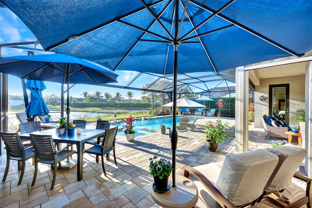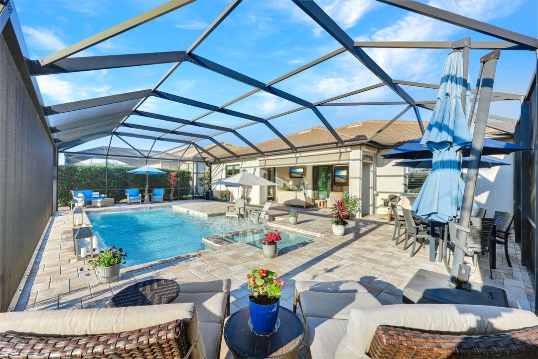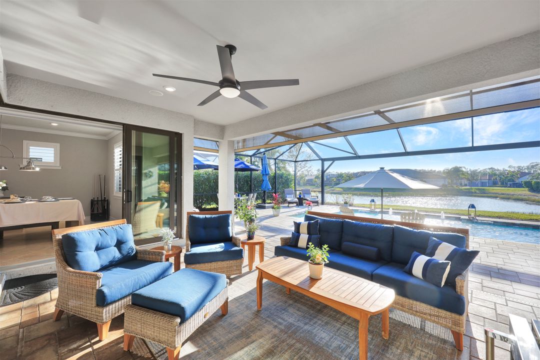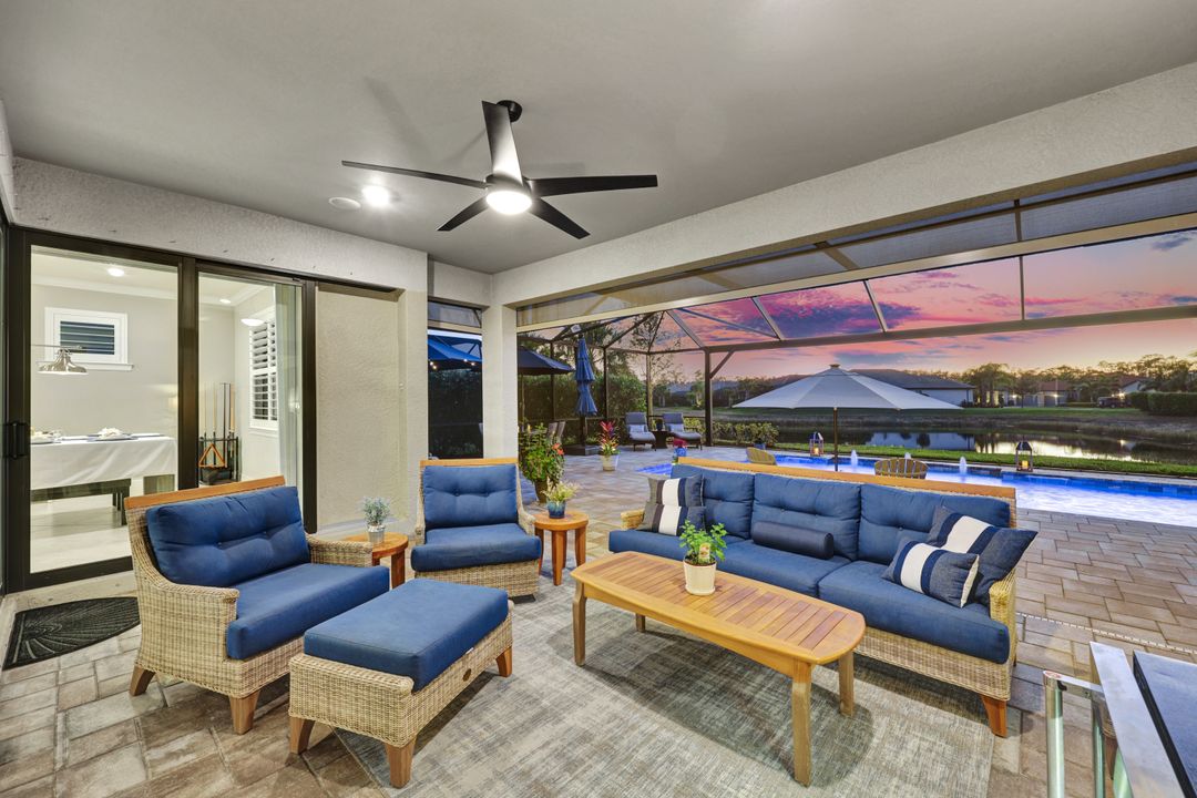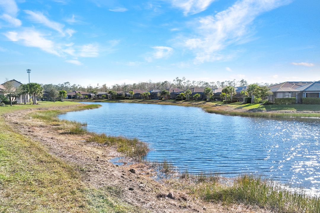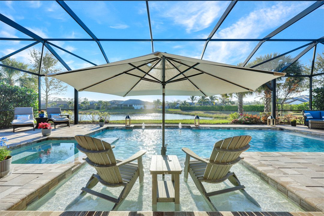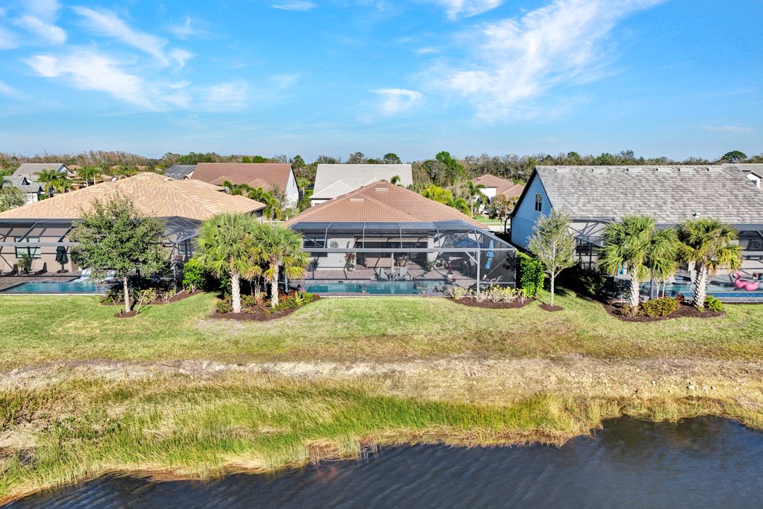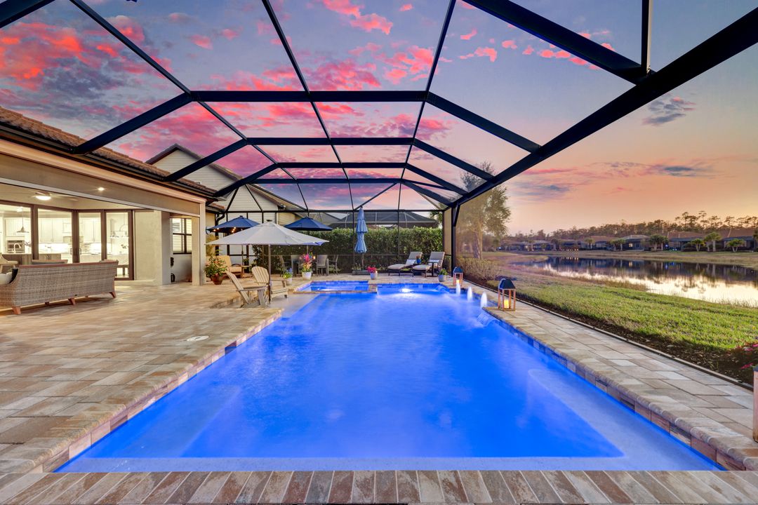 Lakefront Pool Home in Bridgetown at The Plantation. Situated on a Premium Lot overlooking the expansive lake with no homes behind for a private waterfront view. Southwestern Exposure provides the most sunlight on your pool area and magical waterfront sunsets each evening. This upgraded Pinnacle Model offers 2,488 Sf living with 3 Bedrooms plus a private office, 3 Full Bathrooms, and a 3 Car Garage. Upon walking in you will notice this home has more features than most in the community including the kitchen with a custom center island with bar top seating, KitchenAid appliance package, white shaker cabinetry, pantry with built-in shelving, and coffee bar / dry bar with beverage fridge. Soaring volume ceilings, crown molding, a neutral color palate, and large format tiles create a timeless and bright feeling throughout the living space. The living room and dining overlook the lake out of the 90-degree sliding glass doors that pocket and open for true indoor and outdoor living. The Master Suite overlooks the beautiful views and features a glass door to the pool – a custom addition to this model. The Master bathrooms have dual vanities, a soaking tub, a glass walk-in shower, and a huge walk-in closet with built-ins. Each bedroom is large and thoughtfully designed for guests and families from the window coverings to the built-in closet shelving. The private office makes working from home a breeze. Enjoy Florida’s weather in a resort-style pool area – A heated Pool with an integrated hot tub. The pool features every conceivable upgrade including a sun shelf with umbrella holder, fountains, waterfalls, color-changing pool lights, a hot tub, an extra 4 feet of deck space for sunbathing and family gatherings, tropical Clusia privacy hedges, a massive picture window pool cage for panoramic views, and Saltwater chlorination system that is gentler on skin and hair than traditional pools. Outdoor living includes a nice undercover area with a TV, sound system, and motorized hurricane screens – great for privacy, sunshades, and protecting your home from weather. Buy with confidence, Bridgetown is away from the coast and high & dry. Impact windows, doors, sliders, and hurricane screens in the back. The Bridgetown at the Plantation is a gated neighborhood with virtual guard and offers its residents great amenities including a Lap Pool, Main Pool, Spa, 3 Bocce courts, 5 tennis courts, 4 pickleball courts, children’s playground (“tot lot”), bathroom facilities, a storage building, a fire pit, and Tiki Bar. Bridgetown sits just a short distance away from shopping and dining options at The Forum, Gulf Coast Town Center, plus the fun and excitement of JetBlue Park. Beaches, Golf, Dining, and Shopping are all close by.