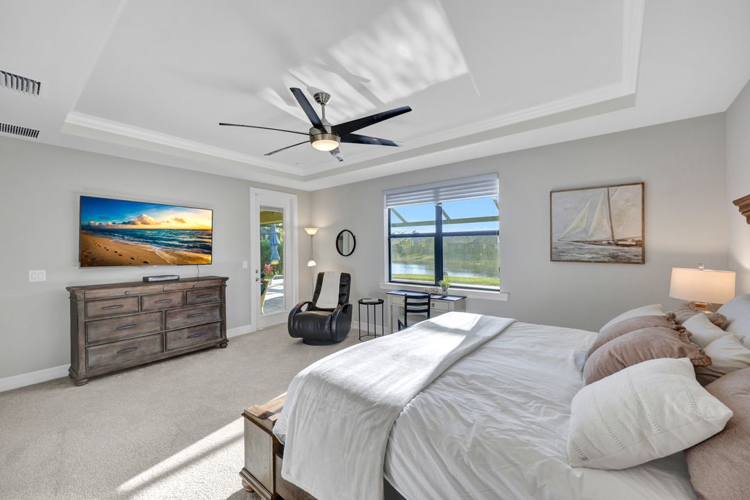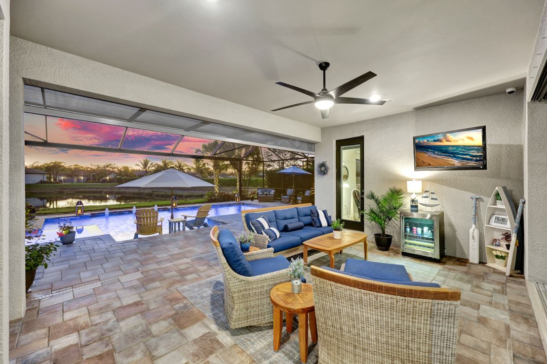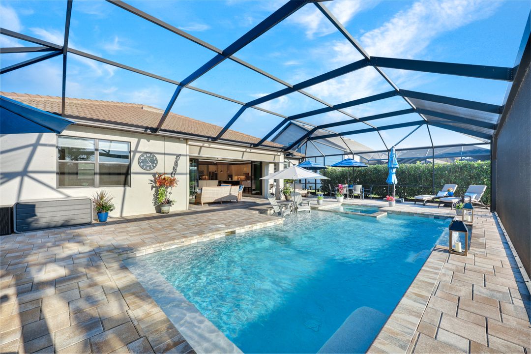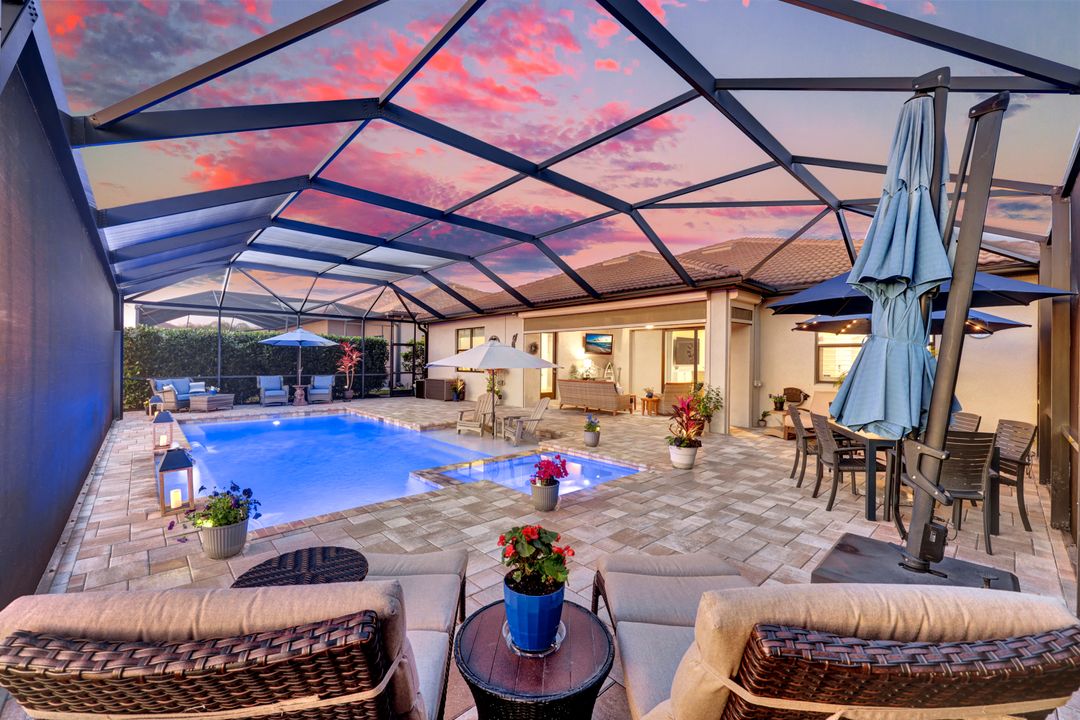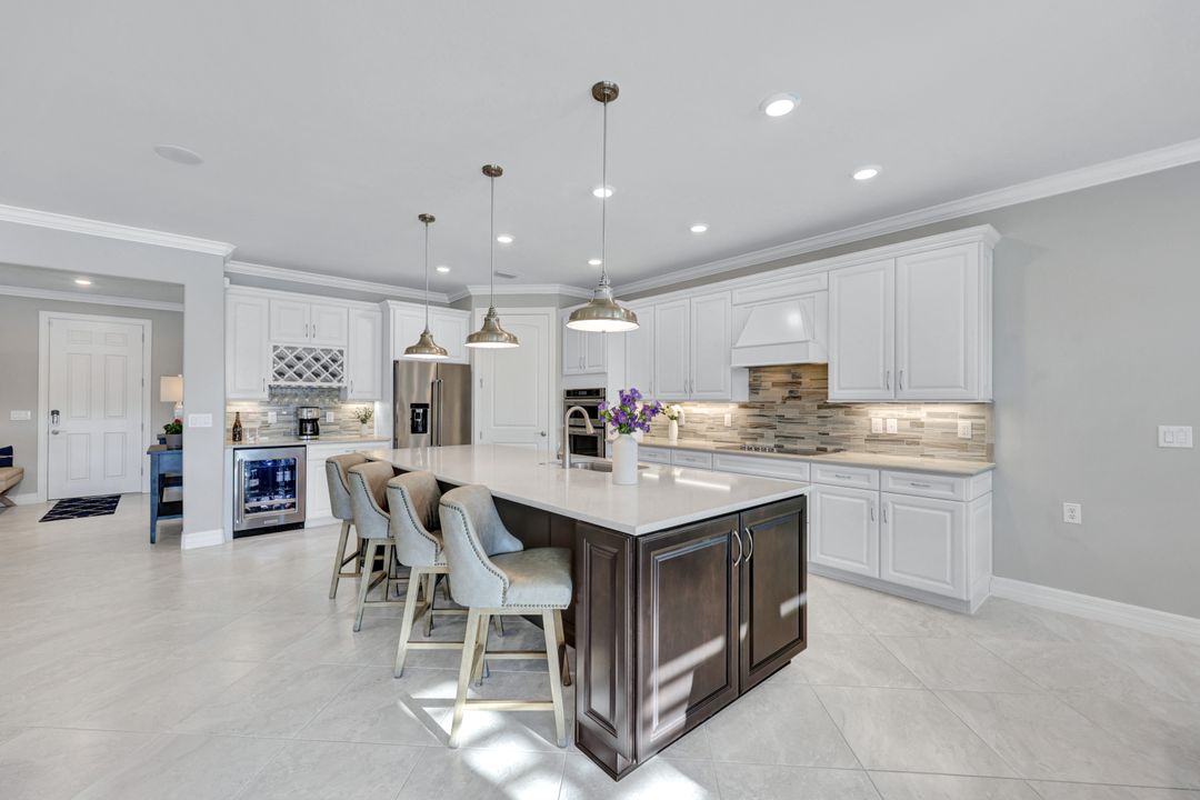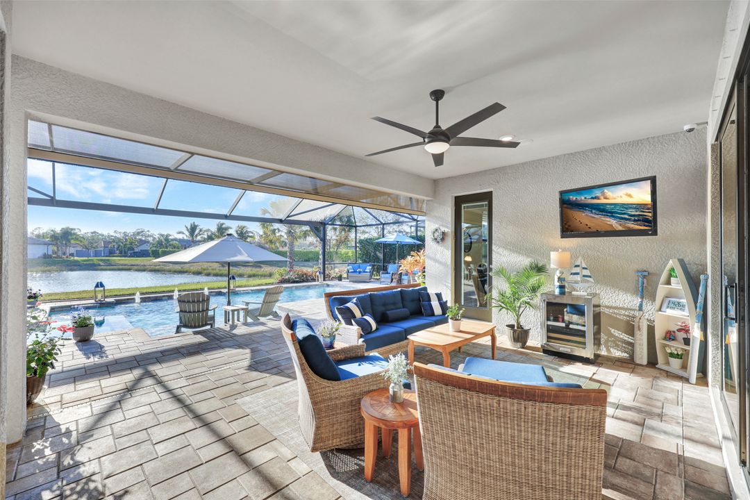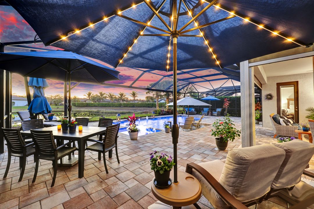 Lakefront Pool Home in Bridgetown at The Plantation. Situated on a Premium Lot overlooking the expansive lake with no homes behind for a private waterfront view. Southwestern Exposure provides the most sunlight on your pool area and magical waterfront sunsets each evening. This upgraded Pinnacle Model offers 2,488 Sf living with 3 Bedrooms plus a private office, 3 Full Bathrooms, and a 3 Car Garage. Upon walking in you will notice this home has more features than most in the community including the kitchen with a custom center island with bar top seating, KitchenAid appliance package, white shaker cabinetry, pantry with built-in shelving, and coffee bar / dry bar with beverage fridge. Soaring volume ceilings, crown molding, a neutral color palate, and large format tiles create a timeless and bright feeling throughout the living space. The living room and dining overlook the lake out of the 90-degree sliding glass doors that pocket and open for true indoor and outdoor living. The Master Suite overlooks the beautiful views and features a glass door to the pool – a custom addition to this model. The Master bathrooms have dual vanities, a soaking tub, a glass walk-in shower, and a huge walk-in closet with built-ins. Each bedroom is large and thoughtfully designed for guests and families from the window coverings to the built-in closet shelving. The private office makes working from home a breeze. Enjoy Florida’s weather in a resort-style pool area – A heated Pool with an integrated hot tub. The pool features every conceivable upgrade including a sun shelf with umbrella holder, fountains, waterfalls, color-changing pool lights, a hot tub, an extra 4 feet of deck space for sunbathing and family gatherings, tropical Clusia privacy hedges, a massive picture window pool cage for panoramic views, and Saltwater chlorination system that is gentler on skin and hair than traditional pools. Outdoor living includes a nice undercover area with a TV, sound system, and motorized hurricane screens – great for privacy, sunshades, and protecting your home from weather. Buy with confidence, Bridgetown is away from the coast and high & dry. Impact windows, doors, sliders, and hurricane screens in the back. The Bridgetown at the Plantation is a gated neighborhood with virtual guard and offers its residents great amenities including a Lap Pool, Main Pool, Spa, 3 Bocce courts, 5 tennis courts, 4 pickleball courts, children’s playground (“tot lot”), bathroom facilities, a storage building, a fire pit, and Tiki Bar. Bridgetown sits just a short distance away from shopping and dining options at The Forum, Gulf Coast Town Center, plus the fun and excitement of JetBlue Park. Beaches, Golf, Dining, and Shopping are all close by.