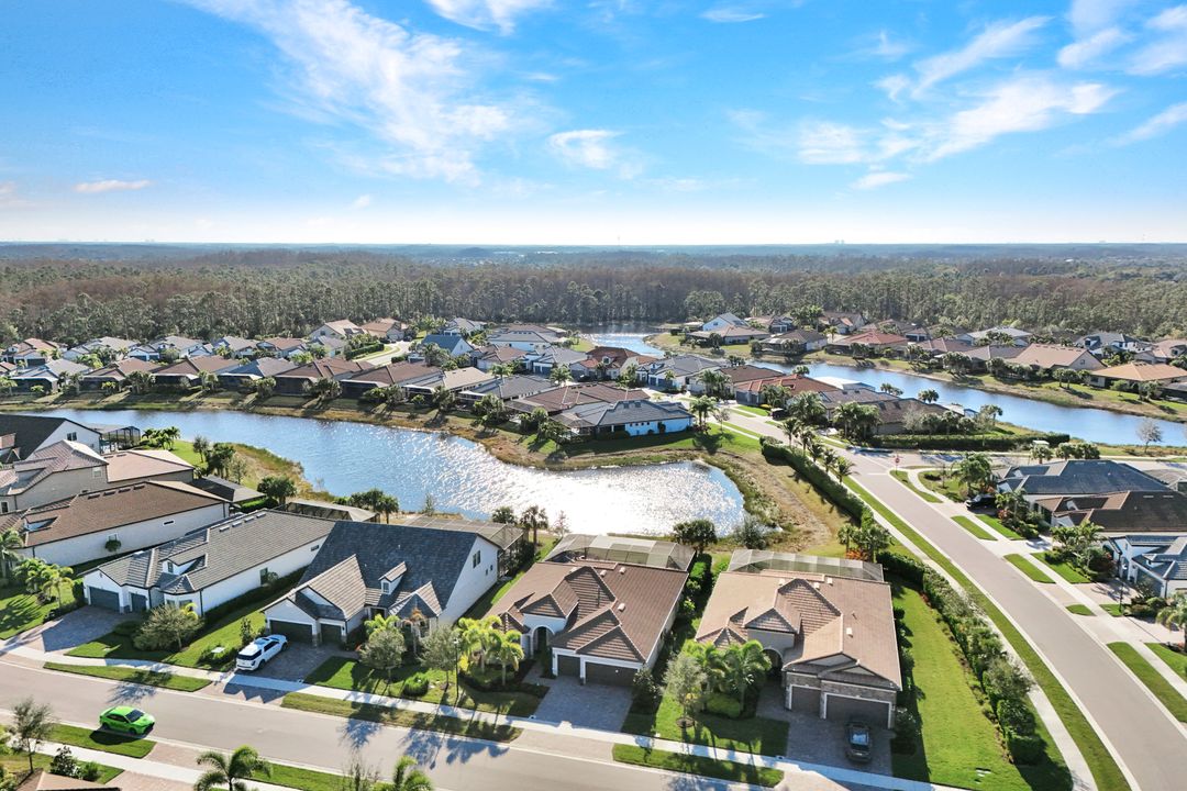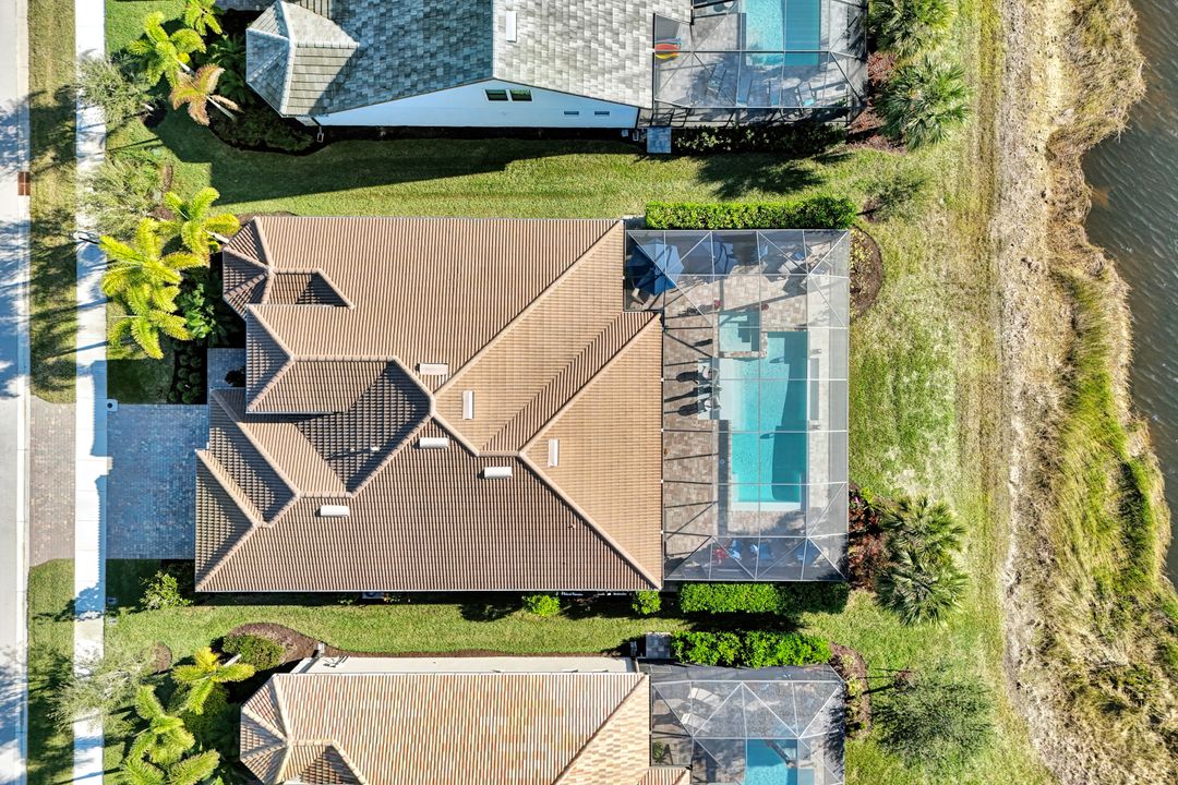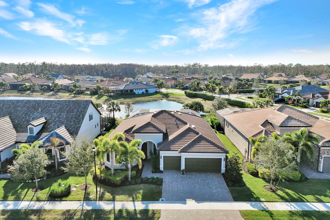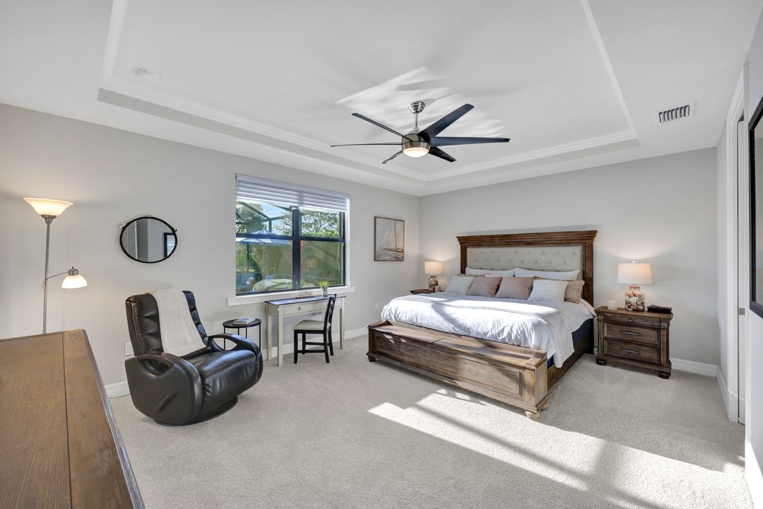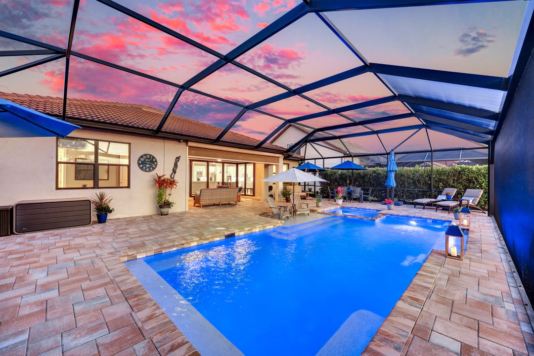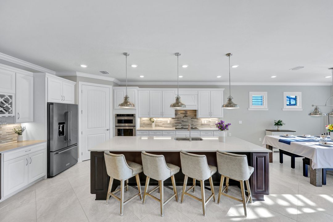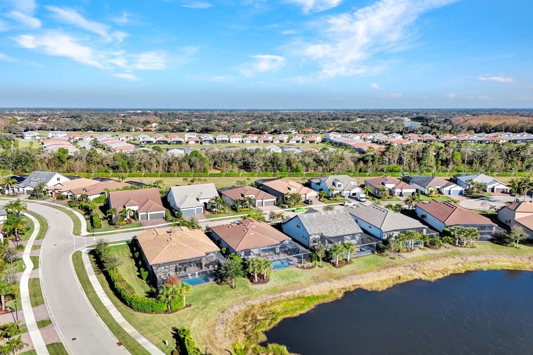Lakefront Pool Home in Bridgetown at The Plantation. Situated on a Premium Lot overlooking the expansive lake with no homes behind for a private waterfront view. Southwestern Exposure provides the most sunlight on your pool area and magical waterfront sunsets each evening. This upgraded Pinnacle Model offers 2,488 Sf living with 3 Bedrooms plus a private office, 3 Full Bathrooms, and a 3 Car Garage. Upon walking in you will notice this home has more features than most in the community including the kitchen with a custom center island with bar top seating, KitchenAid appliance package, white shaker cabinetry, pantry with built-in shelving, and coffee bar / dry bar with beverage fridge. Soaring volume ceilings, crown molding, a neutral color palate, and large format tiles create a timeless and bright feeling throughout the living space. The living room and dining overlook the lake out of the 90-degree sliding glass doors that pocket and open for true indoor and outdoor living. The Master Suite overlooks the beautiful views and features a glass door to the pool – a custom addition to this model. The Master bathrooms have dual vanities, a soaking tub, a glass walk-in shower, and a huge walk-in closet with built-ins. Each bedroom is large and thoughtfully designed for guests and families from the window coverings to the built-in closet shelving. The private office makes working from home a breeze. Enjoy Florida’s weather in a resort-style pool area – A heated Pool with an integrated hot tub. The pool features every conceivable upgrade including a sun shelf with umbrella holder, fountains, waterfalls, color-changing pool lights, a hot tub, an extra 4 feet of deck space for sunbathing and family gatherings, tropical Clusia privacy hedges, a massive picture window pool cage for panoramic views, and Saltwater chlorination system that is gentler on skin and hair than traditional pools. Outdoor living includes a nice undercover area with a TV, sound system, and motorized hurricane screens – great for privacy, sunshades, and protecting your home from weather. Buy with confidence, Bridgetown is away from the coast and high & dry. Impact windows, doors, sliders, and hurricane screens in the back. The Bridgetown at the Plantation is a gated neighborhood with virtual guard and offers its residents great amenities including a Lap Pool, Main Pool, Spa, 3 Bocce courts, 5 tennis courts, 4 pickleball courts, children’s playground (“tot lot”), bathroom facilities, a storage building, a fire pit, and Tiki Bar. Bridgetown sits just a short distance away from shopping and dining options at The Forum, Gulf Coast Town Center, plus the fun and excitement of JetBlue Park. Beaches, Golf, Dining, and Shopping are all close by.