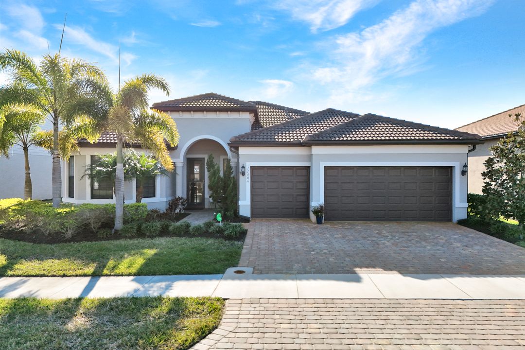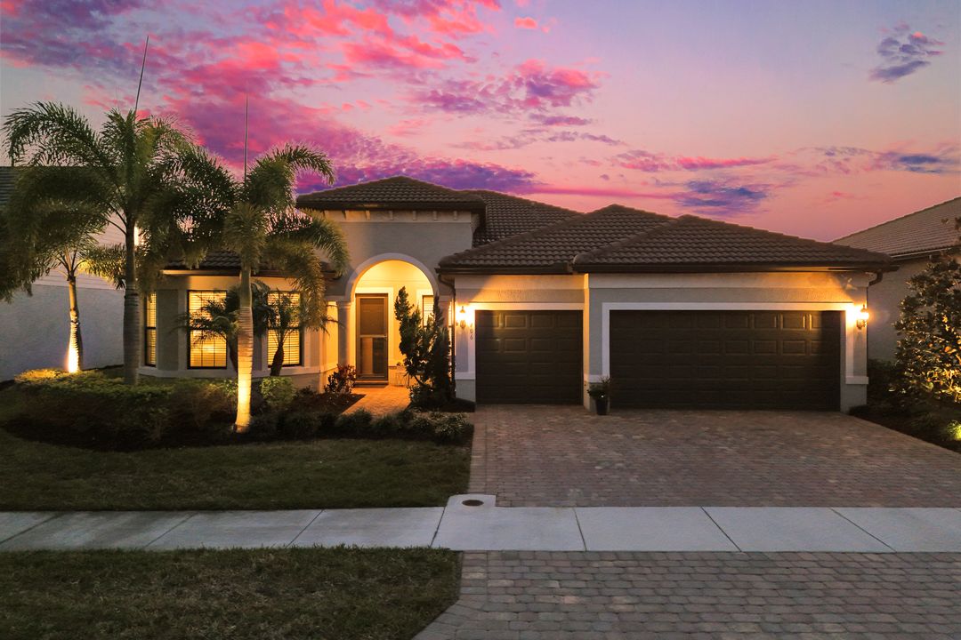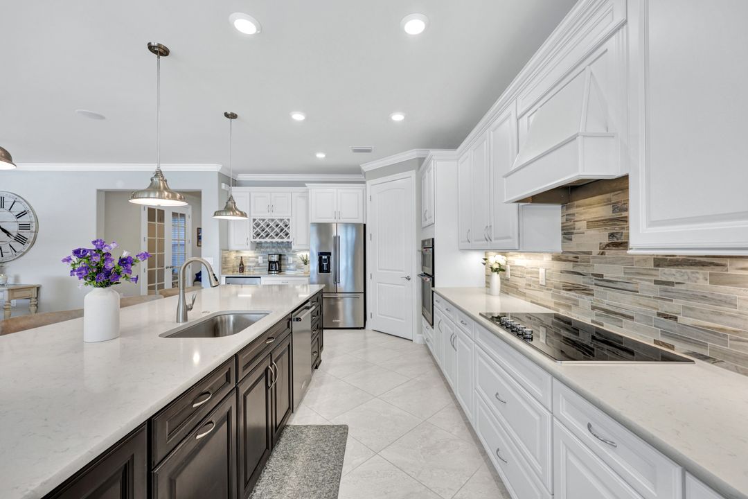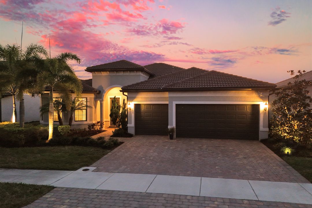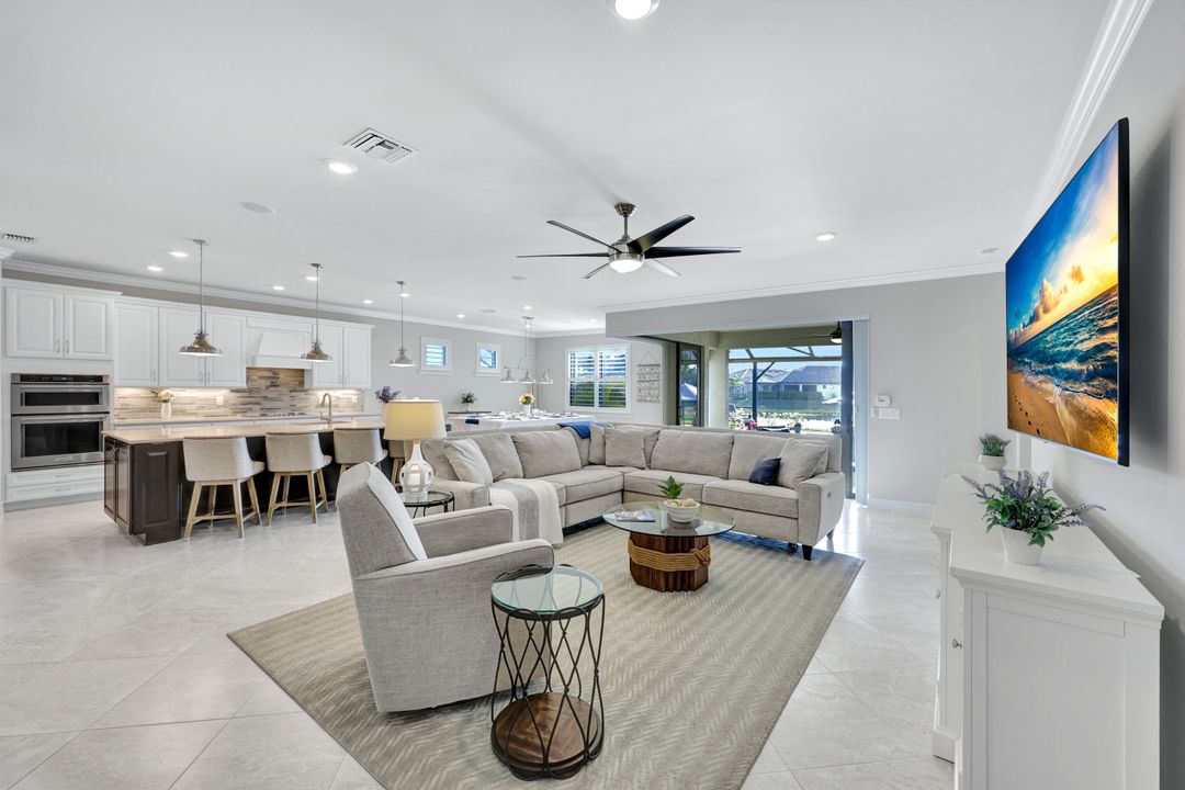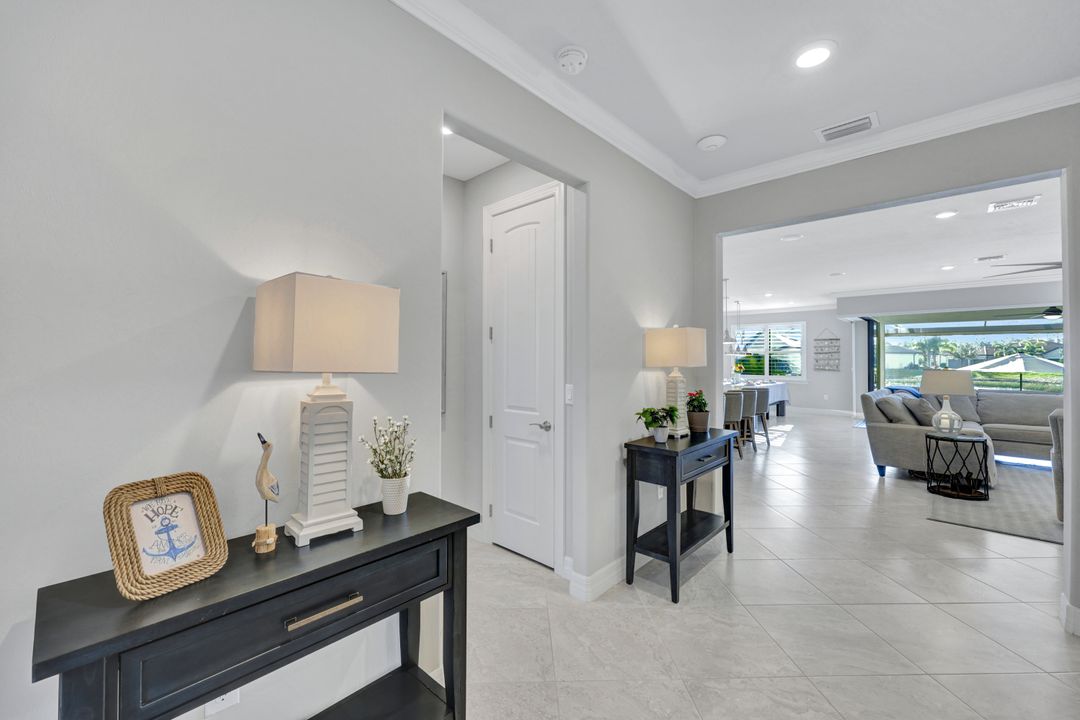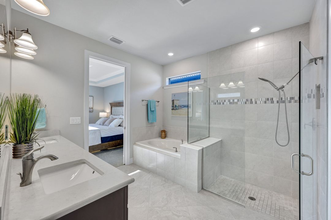 Lakefront Pool Home in Bridgetown at The Plantation. Situated on a Premium Lot overlooking the expansive lake with no homes behind for a private waterfront view. Southwestern Exposure provides the most sunlight on your pool area and magical waterfront sunsets each evening. This upgraded Pinnacle Model offers 2,488 Sf living with 3 Bedrooms plus a private office, 3 Full Bathrooms, and a 3 Car Garage. Upon walking in you will notice this home has more features than most in the community including the kitchen with a custom center island with bar top seating, KitchenAid appliance package, white shaker cabinetry, pantry with built-in shelving, and coffee bar / dry bar with beverage fridge. Soaring volume ceilings, crown molding, a neutral color palate, and large format tiles create a timeless and bright feeling throughout the living space. The living room and dining overlook the lake out of the 90-degree sliding glass doors that pocket and open for true indoor and outdoor living. The Master Suite overlooks the beautiful views and features a glass door to the pool – a custom addition to this model. The Master bathrooms have dual vanities, a soaking tub, a glass walk-in shower, and a huge walk-in closet with built-ins. Each bedroom is large and thoughtfully designed for guests and families from the window coverings to the built-in closet shelving. The private office makes working from home a breeze. Enjoy Florida’s weather in a resort-style pool area – A heated Pool with an integrated hot tub. The pool features every conceivable upgrade including a sun shelf with umbrella holder, fountains, waterfalls, color-changing pool lights, a hot tub, an extra 4 feet of deck space for sunbathing and family gatherings, tropical Clusia privacy hedges, a massive picture window pool cage for panoramic views, and Saltwater chlorination system that is gentler on skin and hair than traditional pools. Outdoor living includes a nice undercover area with a TV, sound system, and motorized hurricane screens – great for privacy, sunshades, and protecting your home from weather. Buy with confidence, Bridgetown is away from the coast and high & dry. Impact windows, doors, sliders, and hurricane screens in the back. The Bridgetown at the Plantation is a gated neighborhood with virtual guard and offers its residents great amenities including a Lap Pool, Main Pool, Spa, 3 Bocce courts, 5 tennis courts, 4 pickleball courts, children’s playground (“tot lot”), bathroom facilities, a storage building, a fire pit, and Tiki Bar. Bridgetown sits just a short distance away from shopping and dining options at The Forum, Gulf Coast Town Center, plus the fun and excitement of JetBlue Park. Beaches, Golf, Dining, and Shopping are all close by.