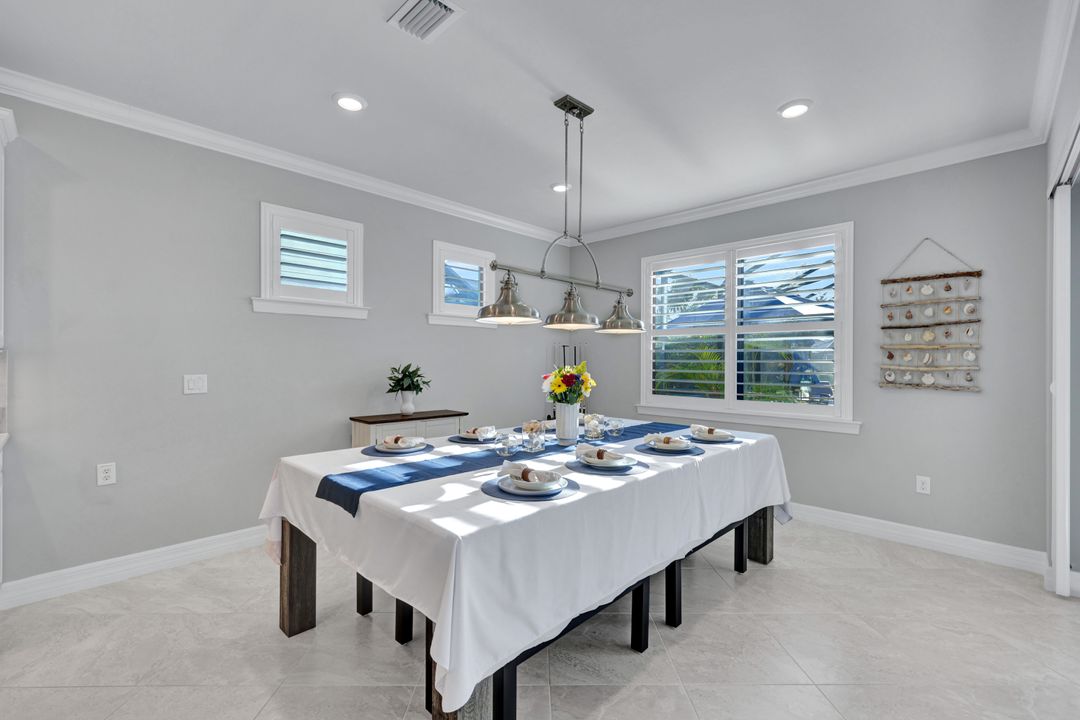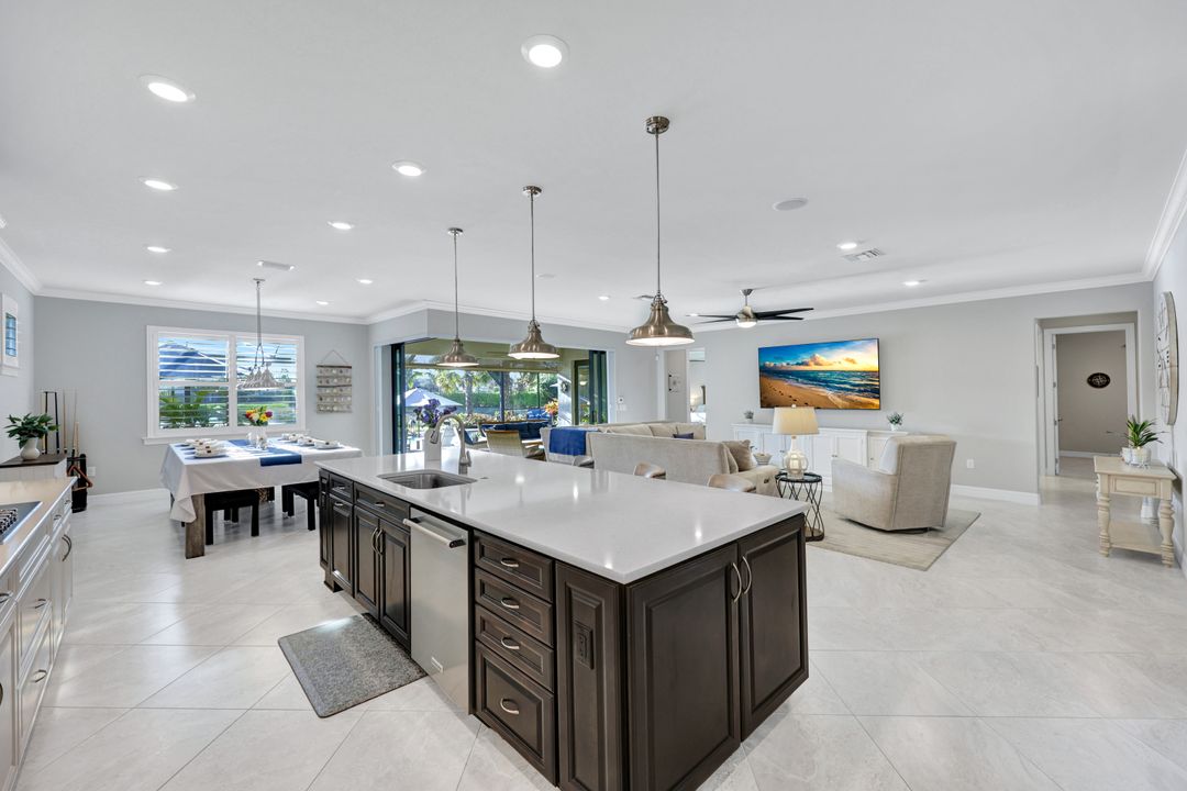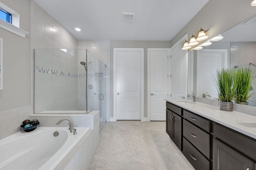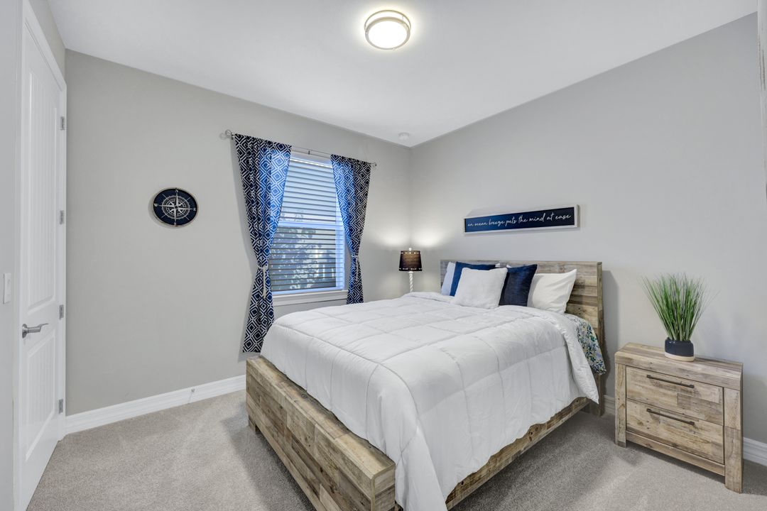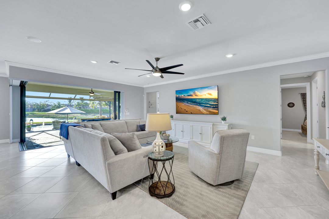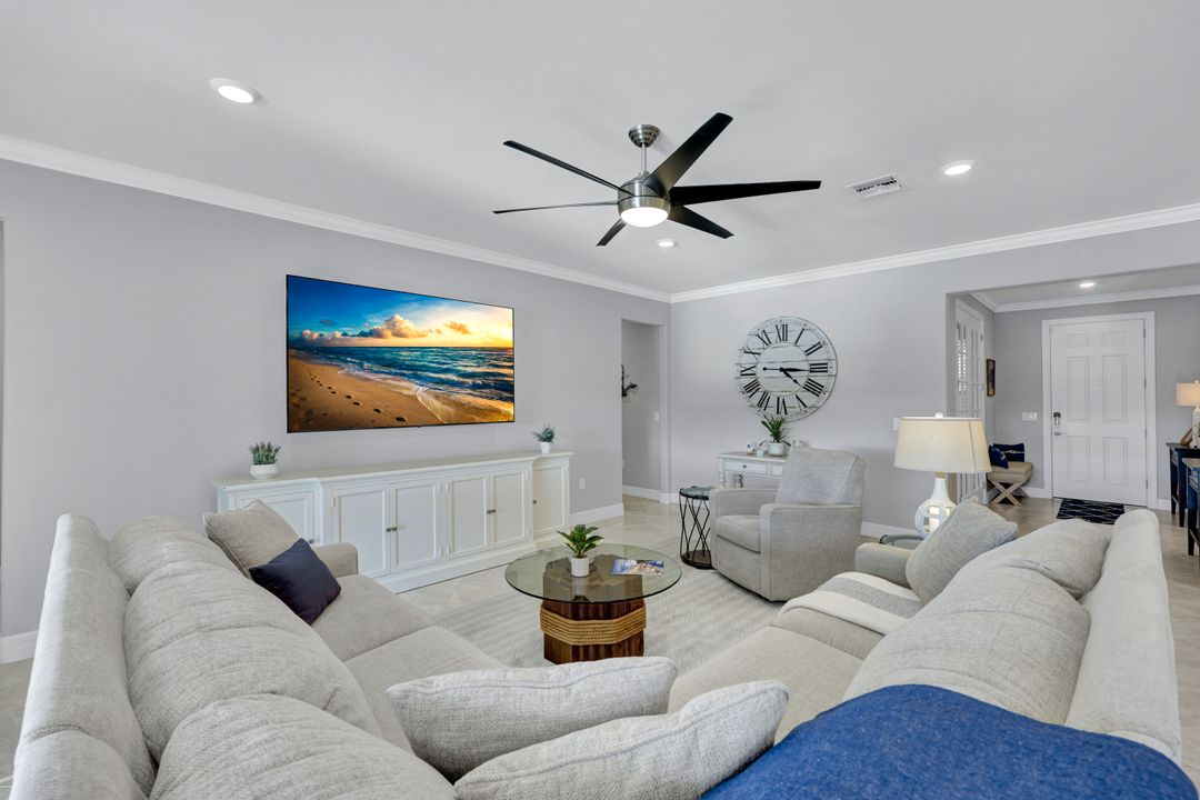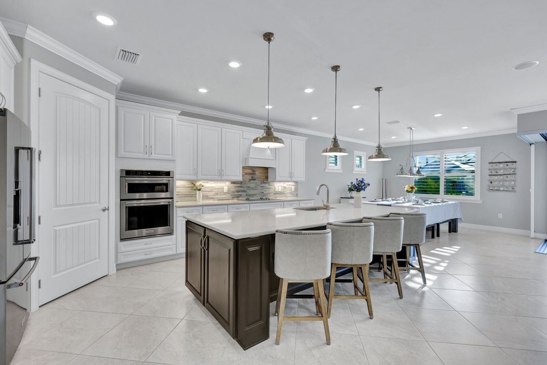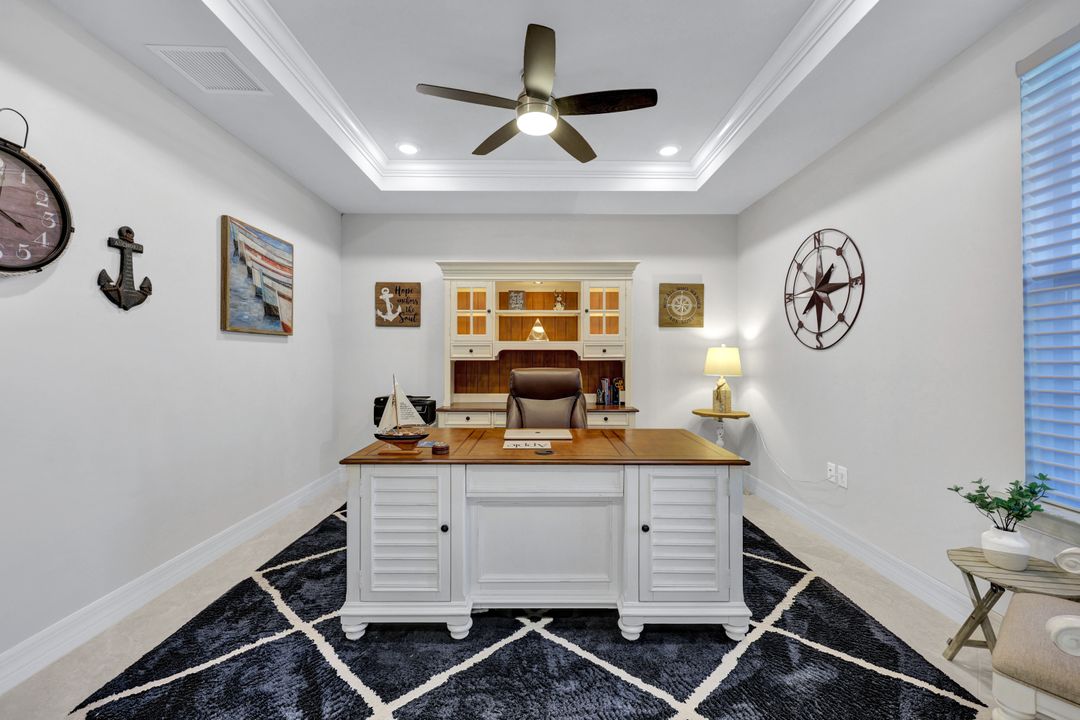 Lakefront Pool Home in Bridgetown at The Plantation. Situated on a Premium Lot overlooking the expansive lake with no homes behind for a private waterfront view. Southwestern Exposure provides the most sunlight on your pool area and magical waterfront sunsets each evening. This upgraded Pinnacle Model offers 2,488 Sf living with 3 Bedrooms plus a private office, 3 Full Bathrooms, and a 3 Car Garage. Upon walking in you will notice this home has more features than most in the community including the kitchen with a custom center island with bar top seating, KitchenAid appliance package, white shaker cabinetry, pantry with built-in shelving, and coffee bar / dry bar with beverage fridge. Soaring volume ceilings, crown molding, a neutral color palate, and large format tiles create a timeless and bright feeling throughout the living space. The living room and dining overlook the lake out of the 90-degree sliding glass doors that pocket and open for true indoor and outdoor living. The Master Suite overlooks the beautiful views and features a glass door to the pool – a custom addition to this model. The Master bathrooms have dual vanities, a soaking tub, a glass walk-in shower, and a huge walk-in closet with built-ins. Each bedroom is large and thoughtfully designed for guests and families from the window coverings to the built-in closet shelving. The private office makes working from home a breeze. Enjoy Florida’s weather in a resort-style pool area – A heated Pool with an integrated hot tub. The pool features every conceivable upgrade including a sun shelf with umbrella holder, fountains, waterfalls, color-changing pool lights, a hot tub, an extra 4 feet of deck space for sunbathing and family gatherings, tropical Clusia privacy hedges, a massive picture window pool cage for panoramic views, and Saltwater chlorination system that is gentler on skin and hair than traditional pools. Outdoor living includes a nice undercover area with a TV, sound system, and motorized hurricane screens – great for privacy, sunshades, and protecting your home from weather. Buy with confidence, Bridgetown is away from the coast and high & dry. Impact windows, doors, sliders, and hurricane screens in the back. The Bridgetown at the Plantation is a gated neighborhood with virtual guard and offers its residents great amenities including a Lap Pool, Main Pool, Spa, 3 Bocce courts, 5 tennis courts, 4 pickleball courts, children’s playground (“tot lot”), bathroom facilities, a storage building, a fire pit, and Tiki Bar. Bridgetown sits just a short distance away from shopping and dining options at The Forum, Gulf Coast Town Center, plus the fun and excitement of JetBlue Park. Beaches, Golf, Dining, and Shopping are all close by.