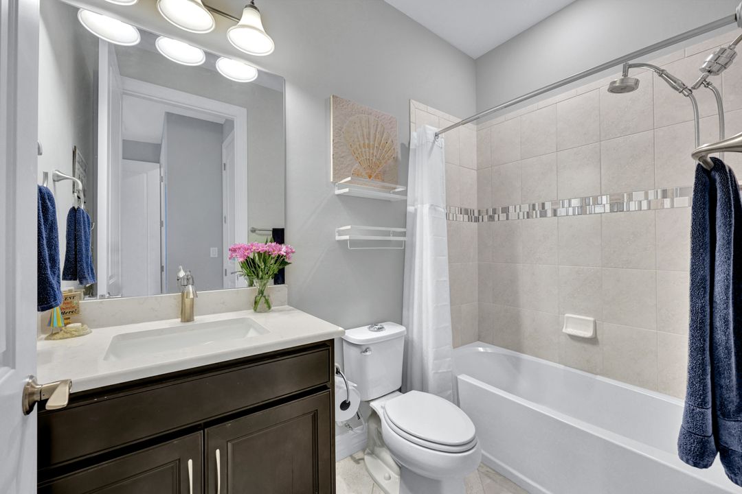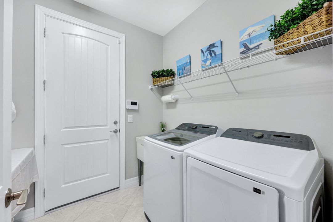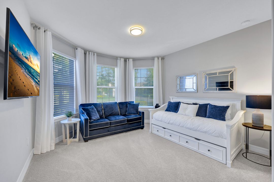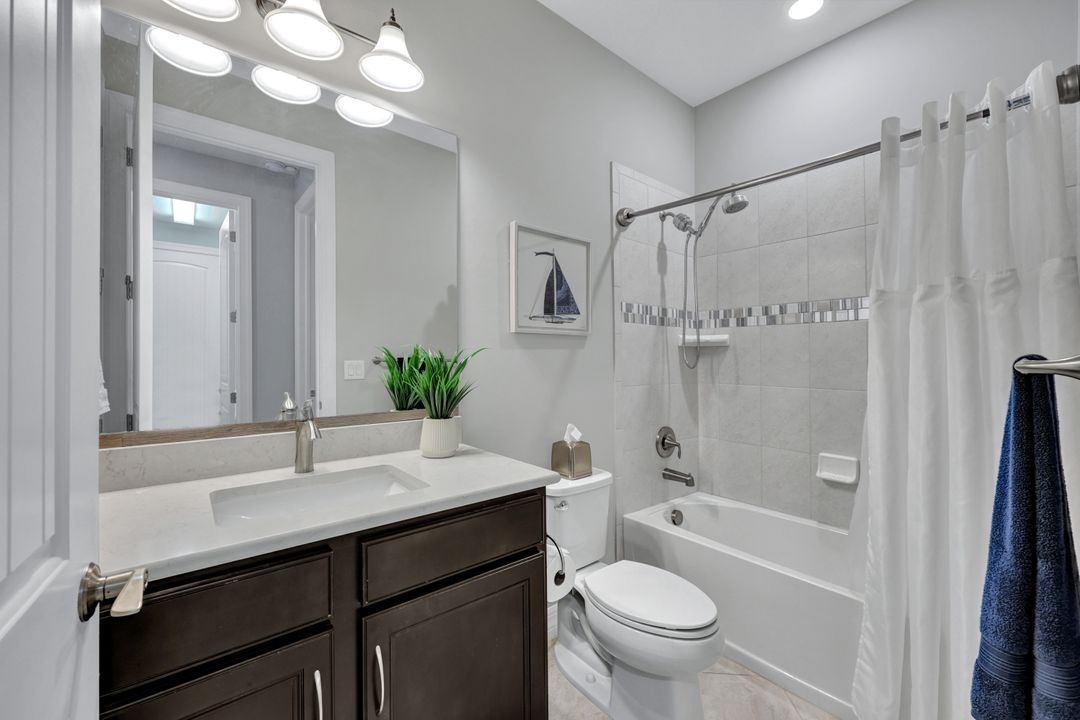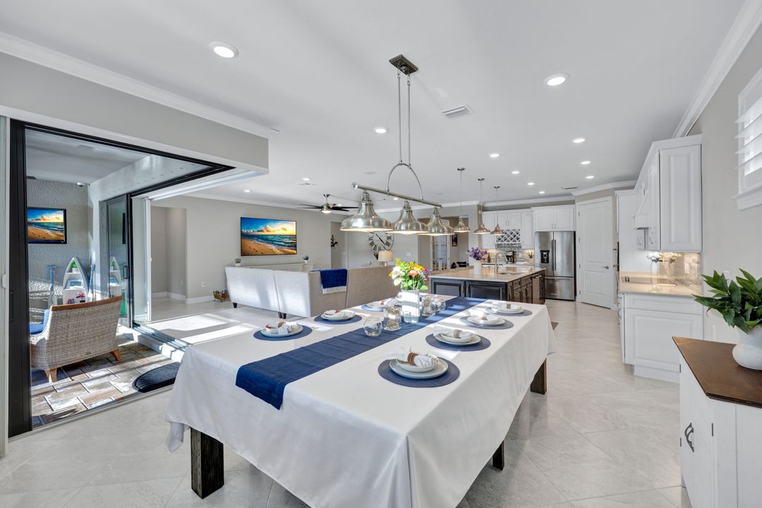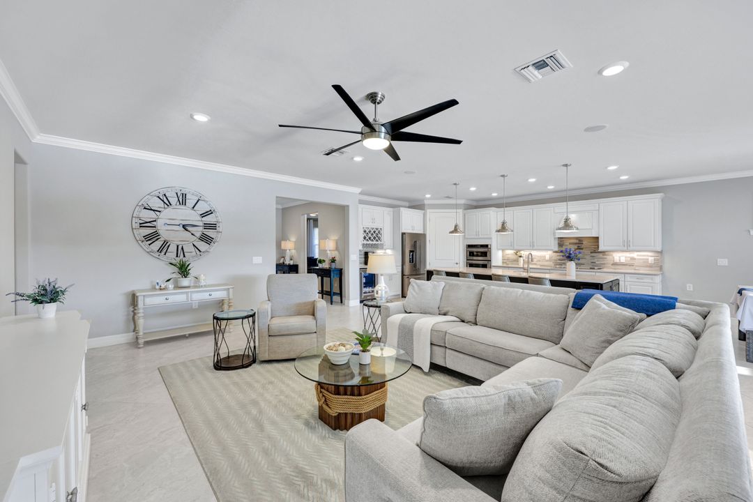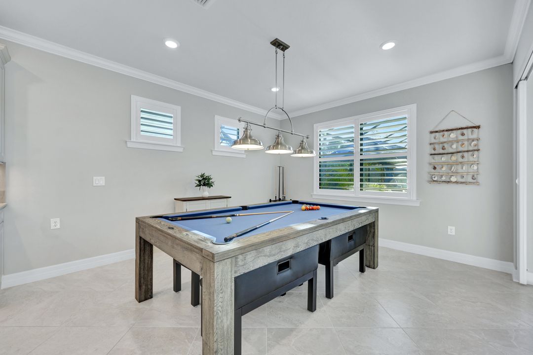 Lakefront Pool Home in Bridgetown at The Plantation. Situated on a Premium Lot overlooking the expansive lake with no homes behind for a private waterfront view. Southwestern Exposure provides the most sunlight on your pool area and magical waterfront sunsets each evening. This upgraded Pinnacle Model offers 2,488 Sf living with 3 Bedrooms plus a private office, 3 Full Bathrooms, and a 3 Car Garage. Upon walking in you will notice this home has more features than most in the community including the kitchen with a custom center island with bar top seating, KitchenAid appliance package, white shaker cabinetry, pantry with built-in shelving, and coffee bar / dry bar with beverage fridge. Soaring volume ceilings, crown molding, a neutral color palate, and large format tiles create a timeless and bright feeling throughout the living space. The living room and dining overlook the lake out of the 90-degree sliding glass doors that pocket and open for true indoor and outdoor living. The Master Suite overlooks the beautiful views and features a glass door to the pool – a custom addition to this model. The Master bathrooms have dual vanities, a soaking tub, a glass walk-in shower, and a huge walk-in closet with built-ins. Each bedroom is large and thoughtfully designed for guests and families from the window coverings to the built-in closet shelving. The private office makes working from home a breeze. Enjoy Florida’s weather in a resort-style pool area – A heated Pool with an integrated hot tub. The pool features every conceivable upgrade including a sun shelf with umbrella holder, fountains, waterfalls, color-changing pool lights, a hot tub, an extra 4 feet of deck space for sunbathing and family gatherings, tropical Clusia privacy hedges, a massive picture window pool cage for panoramic views, and Saltwater chlorination system that is gentler on skin and hair than traditional pools. Outdoor living includes a nice undercover area with a TV, sound system, and motorized hurricane screens – great for privacy, sunshades, and protecting your home from weather. Buy with confidence, Bridgetown is away from the coast and high & dry. Impact windows, doors, sliders, and hurricane screens in the back. The Bridgetown at the Plantation is a gated neighborhood with virtual guard and offers its residents great amenities including a Lap Pool, Main Pool, Spa, 3 Bocce courts, 5 tennis courts, 4 pickleball courts, children’s playground (“tot lot”), bathroom facilities, a storage building, a fire pit, and Tiki Bar. Bridgetown sits just a short distance away from shopping and dining options at The Forum, Gulf Coast Town Center, plus the fun and excitement of JetBlue Park. Beaches, Golf, Dining, and Shopping are all close by.
