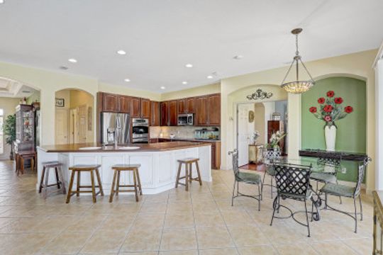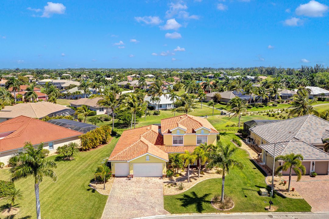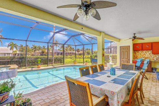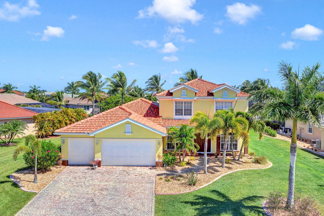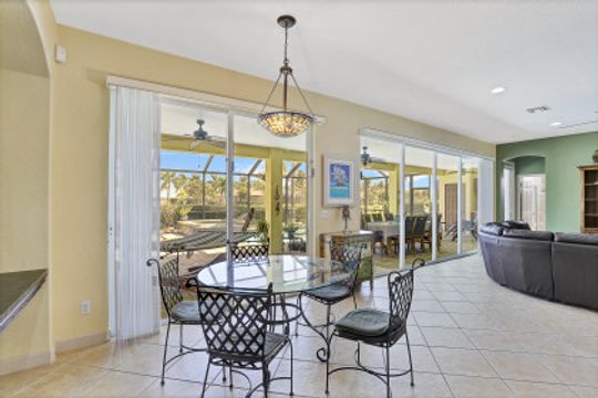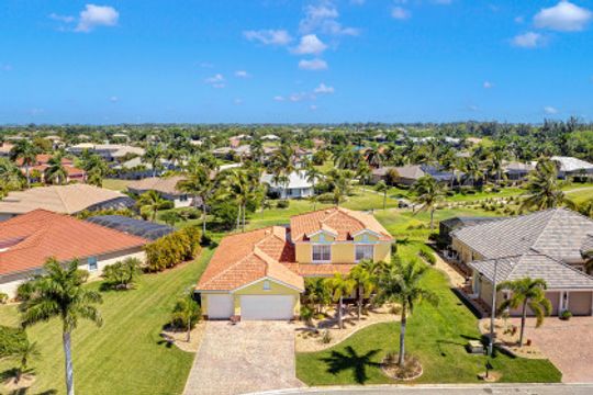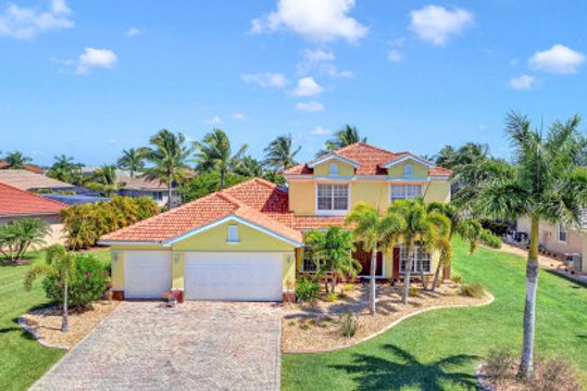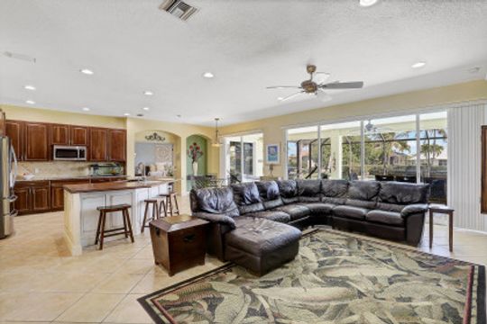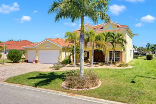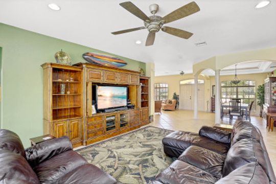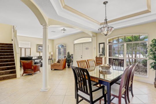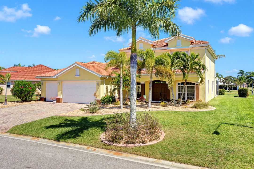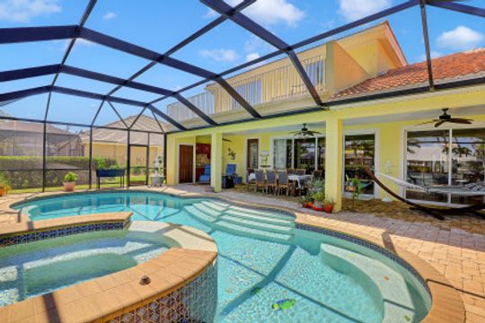 Cape Royal community featuring this two story 5 bed 3 bath 3 car garage home. Walk into an open, spacious, plenty of natural light floor plan hosting living area with formal dining plus family room that is shared with the oversize island eat-in kitchen featuring double sliders that open to the screen lanai/pool area. This eat-in kitchen is like no other; white rubbed cabinetry, real walnut hardwood countertops constructed island, double wall oven & undermount sink. First floor showcases TWO bedrooms!! Owners suite with tray ceiling and sitting area, bath with large sunken jetted tub & separate shower. Additional guestroom makes for a great in-law suite. Three additional guestrooms and bath on second floor. All bedrooms freshly painted, tile & wood floors throughout the home. Interior is staying cool with 2 AC units, one of which replaced within last 2 yrs. Outside, enjoy the newer custom pool & spa just added 5 yrs ago. Large comfortable lanai area is great for entertaining while kids are playing in the backyard. Cape Royal is a hidden gem with low HOA dues & plenty of activities to get involved in; bocce ball, tennis, book club, dining, kayaking and more. Roof less than 2 yrs old.