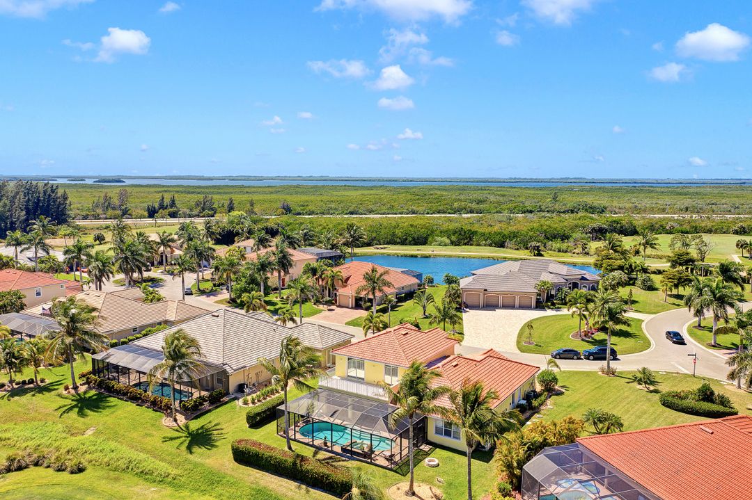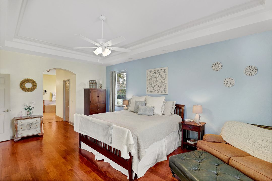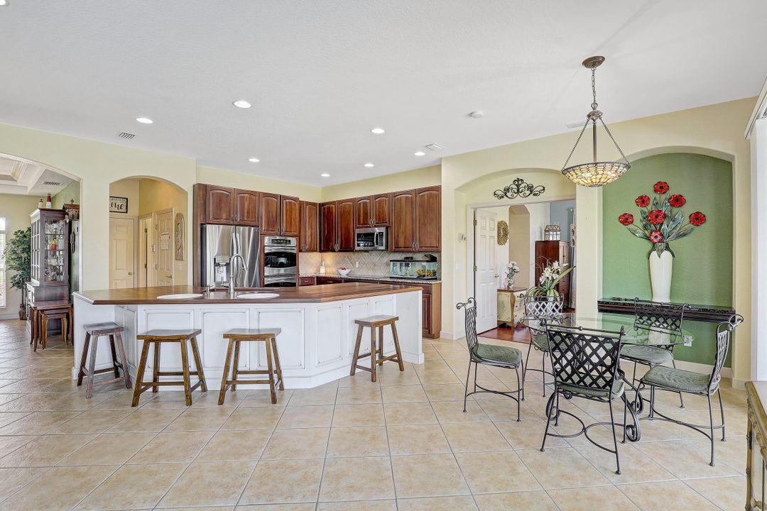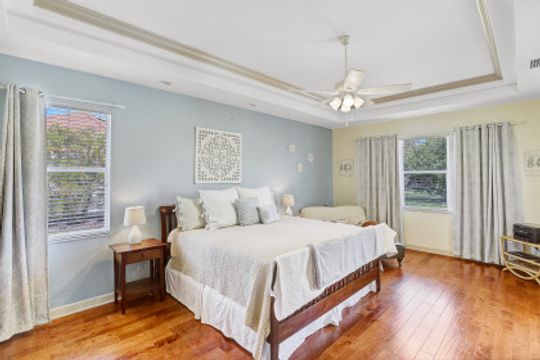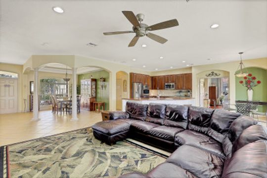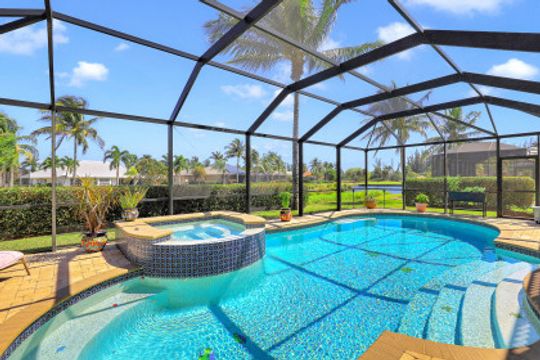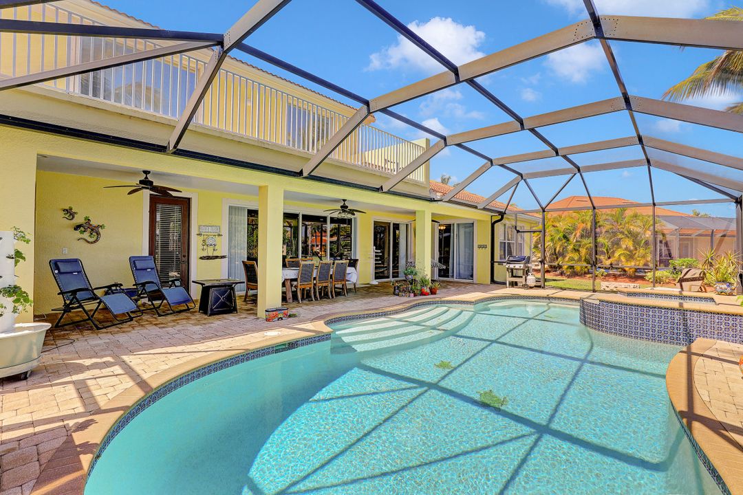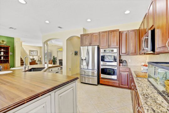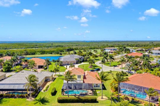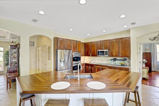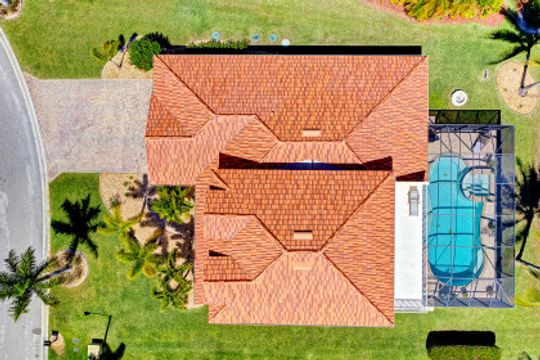 Cape Royal community featuring this two story 5 bed 3 bath 3 car garage home. Walk into an open, spacious, plenty of natural light floor plan hosting living area with formal dining plus family room that is shared with the oversize island eat-in kitchen featuring double sliders that open to the screen lanai/pool area. This eat-in kitchen is like no other; white rubbed cabinetry, real walnut hardwood countertops constructed island, double wall oven & undermount sink. First floor showcases TWO bedrooms!! Owners suite with tray ceiling and sitting area, bath with large sunken jetted tub & separate shower. Additional guestroom makes for a great in-law suite. Three additional guestrooms and bath on second floor. All bedrooms freshly painted, tile & wood floors throughout the home. Interior is staying cool with 2 AC units, one of which replaced within last 2 yrs. Outside, enjoy the newer custom pool & spa just added 5 yrs ago. Large comfortable lanai area is great for entertaining while kids are playing in the backyard. Cape Royal is a hidden gem with low HOA dues & plenty of activities to get involved in; bocce ball, tennis, book club, dining, kayaking and more. Roof less than 2 yrs old.