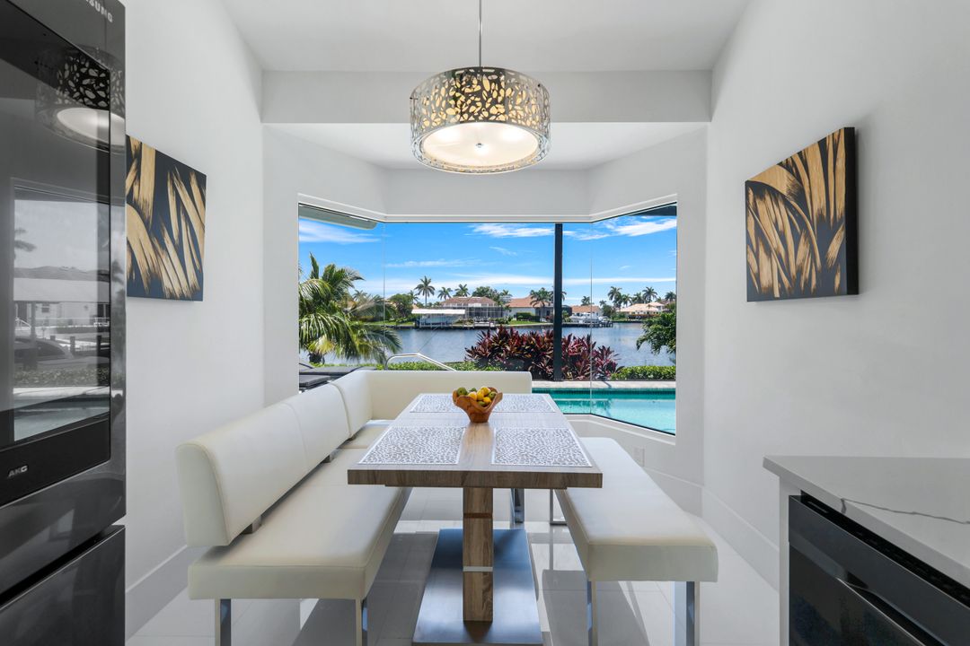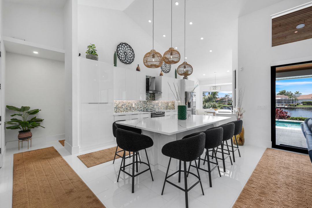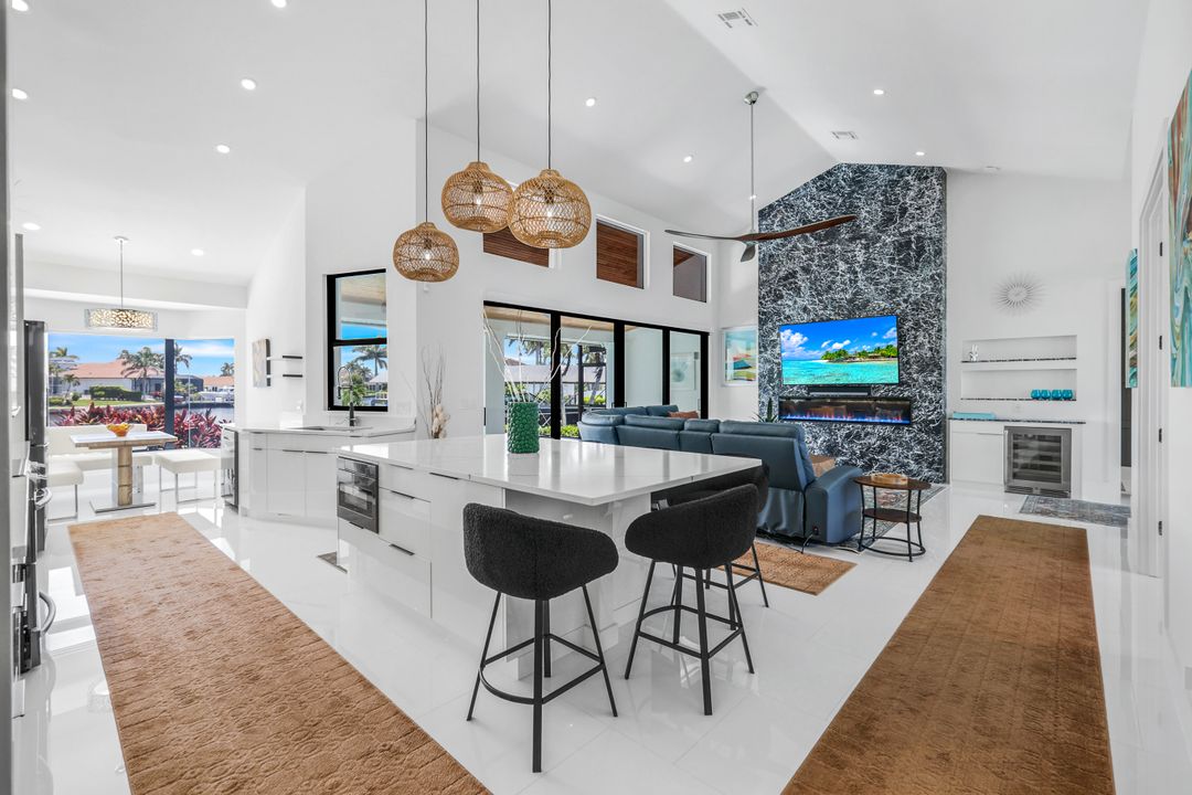 The luminous great room offers serene water views and features a custom granite-surround fireplace, stylish reclining sectional, and built-in wine fridge—perfect for relaxed luxury living. A statement chef’s kitchen is anchored by quartz countertops, gleaming white cabinetry with underlighting, a high-tech Samsung refrigerator, a stunning glass tile backsplash. Designer pendant lighting adds warmth and polish to the center island breakfast bar and illuminates a charming dining nook nestled in a sunlit window bay.