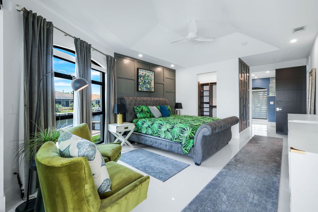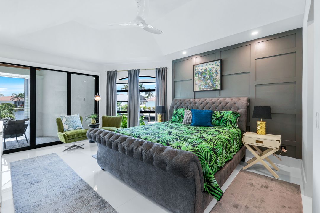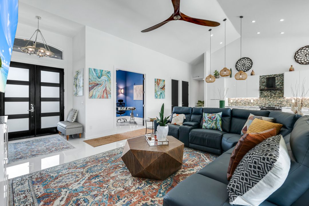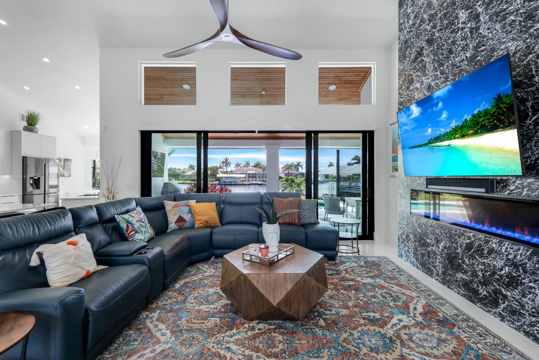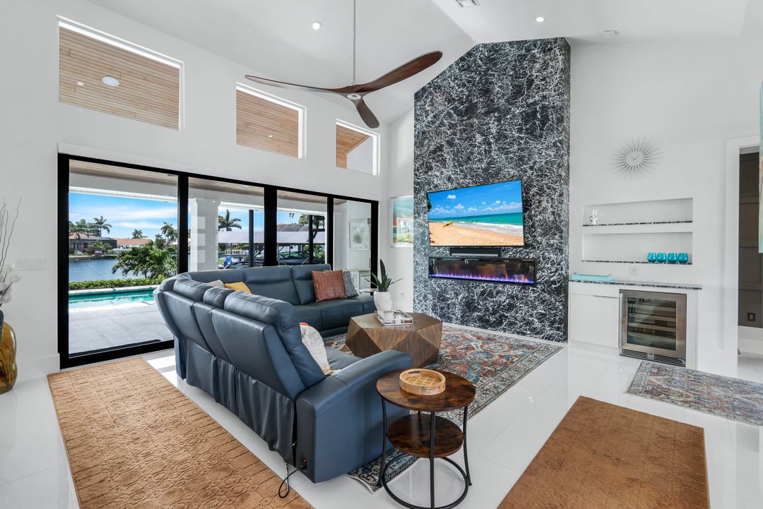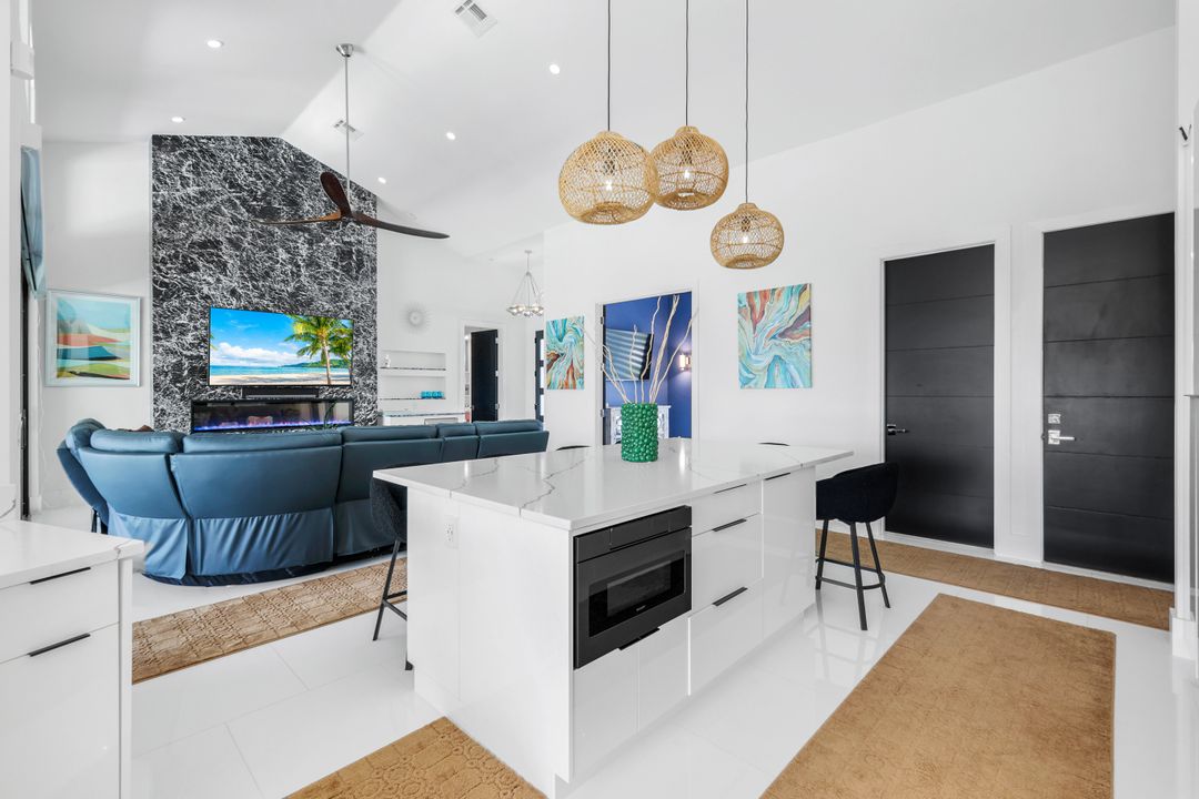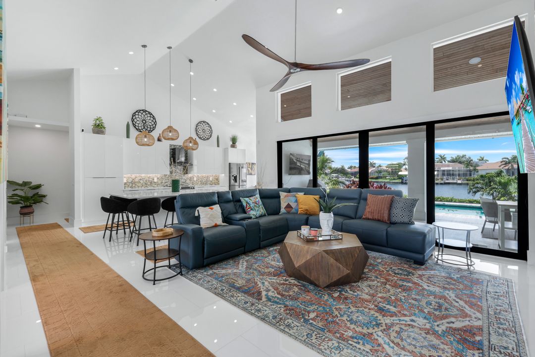 Showcasing a sophisticated architectural footprint and curated design elements, the home has been reimagined with high-end modern coastal finishes, including impact-rated windows and doors, porcelain tile flooring throughout, a striking oversized entry door, and elegant cathedral ceilings enhanced by clerestory windows, automatic blinds and expansive sliders that bathe the interiors in natural light.