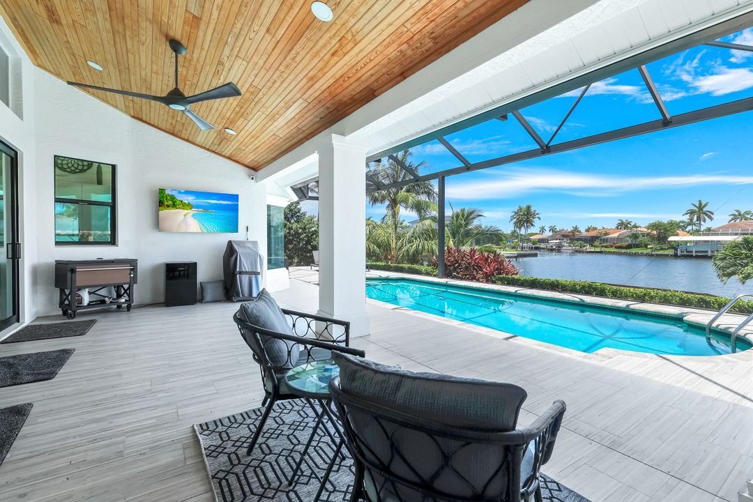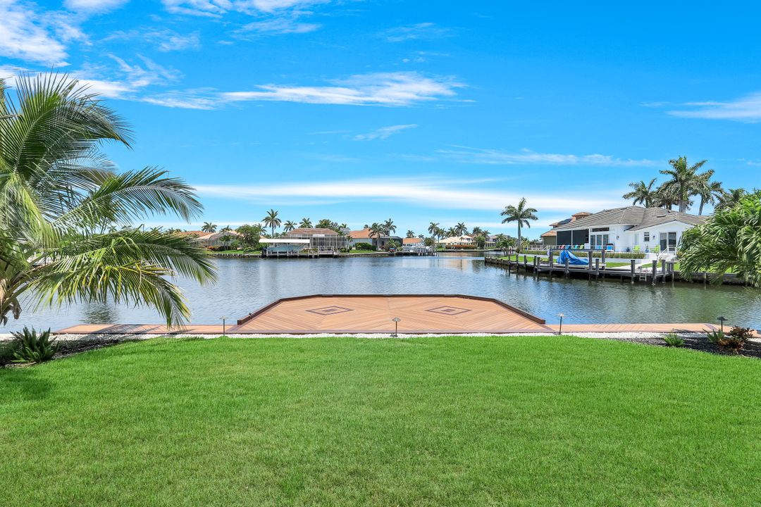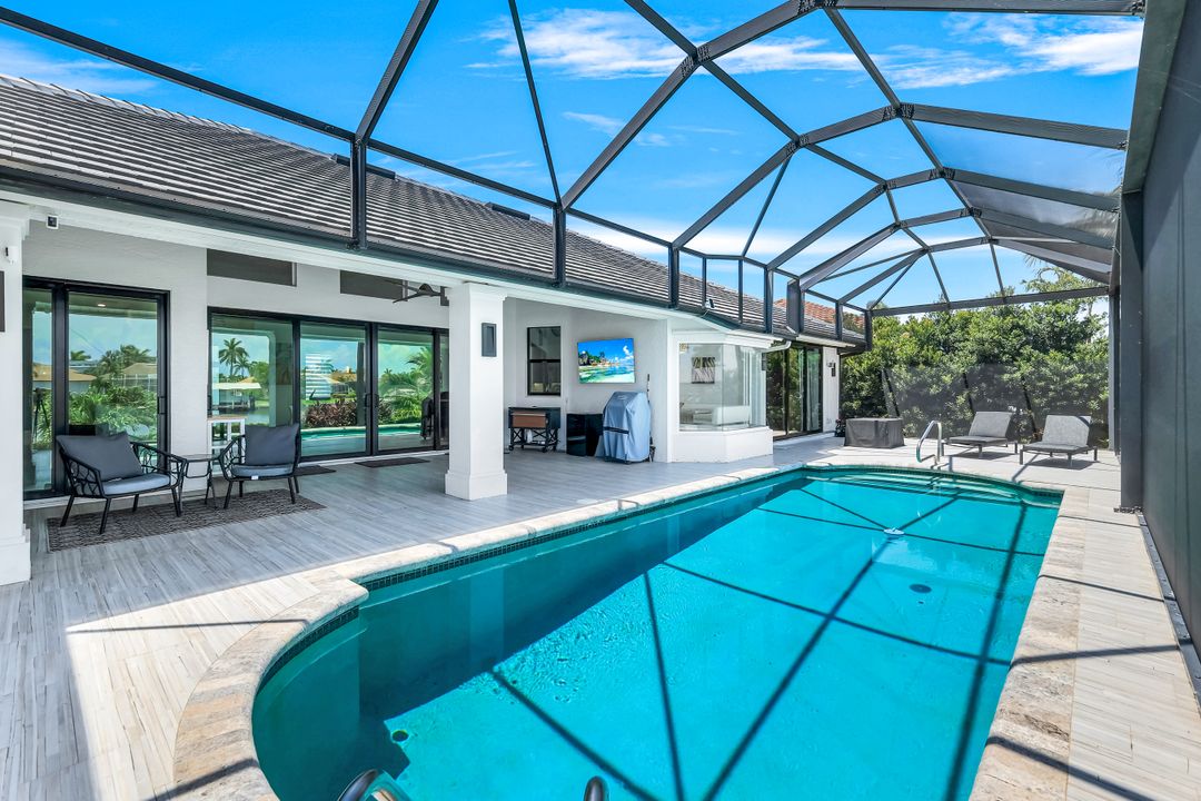 Outdoors, enjoy the epitome of Marco Island living with a large pool and elevated spa, a covered lanai with tongue-and-groove wood ceiling, and a clear picture-frame screen enclosure offering unobstructed vistas and a true indoor-outdoor experience. The newly constructed 150-foot dock is a showpiece—featuring a beautifully inlaid sundeck and conversation area over the water, three Jet Ski lifts, a small boat lift, and a 45-foot covered boat slip for vessels up to 40 feet. Lush tropical landscaping, architectural lighting, a roomy 2 car garage and a long paver driveway complete this exceptional residence.