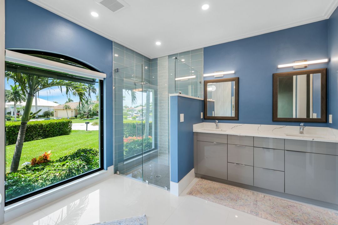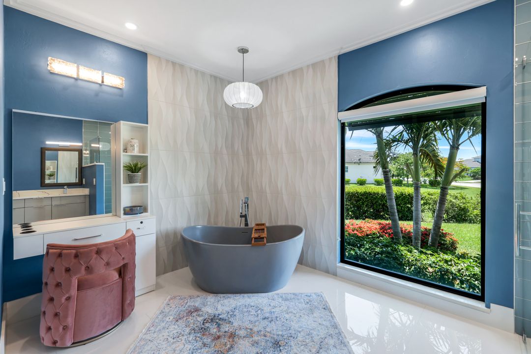 The sumptuous primary suite is a refined retreat with built-in closets, lanai access, designer feature walls, and a beautifully appointed spa bath with a standalone soaking tub, walk-in shower, dual vanities, a built-in beauty vanity, and a separate water closet.