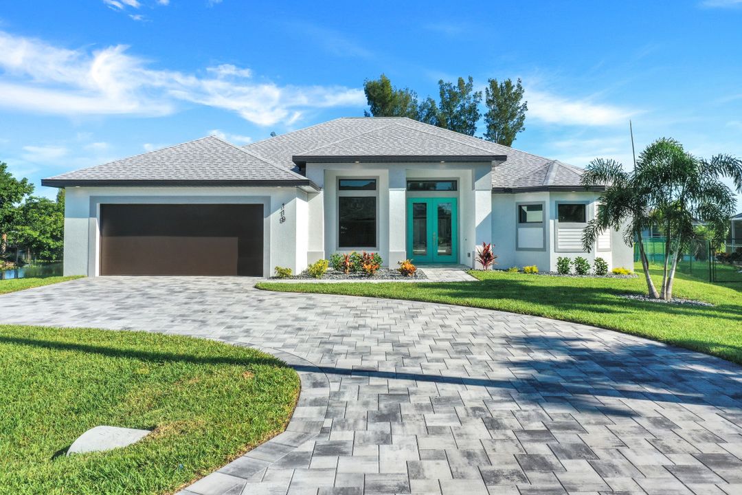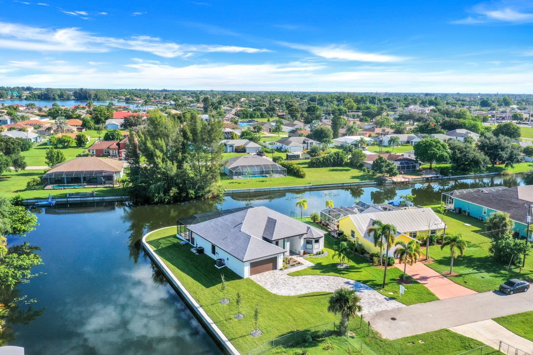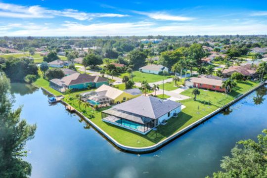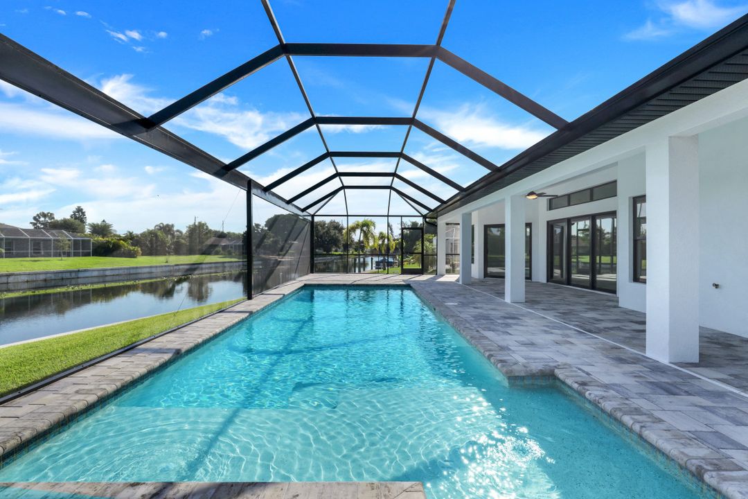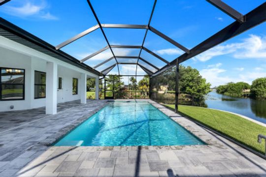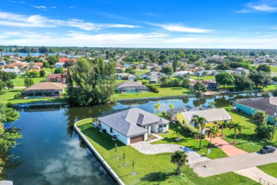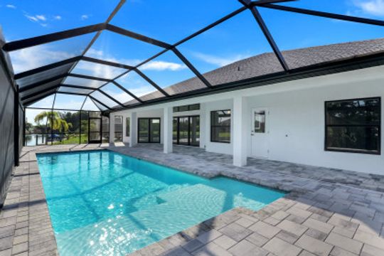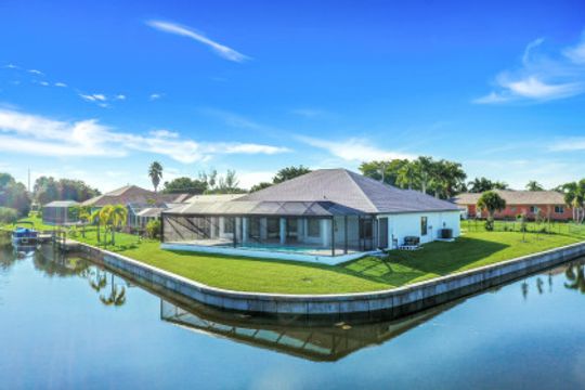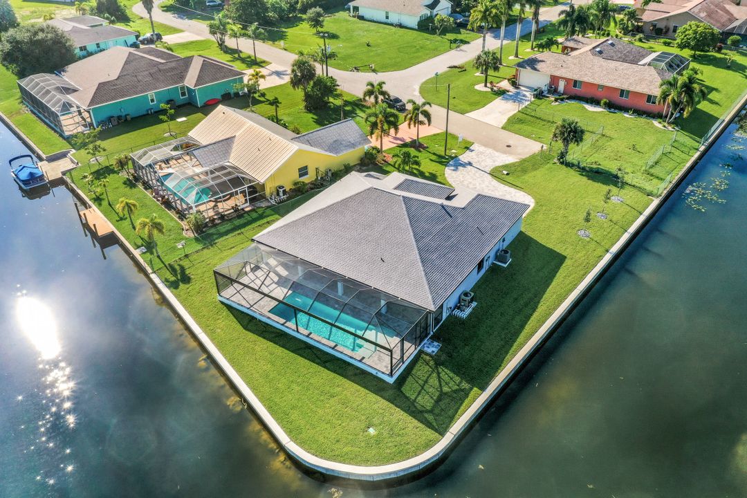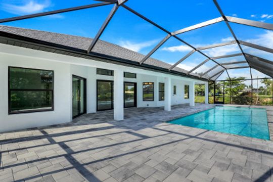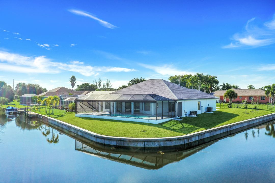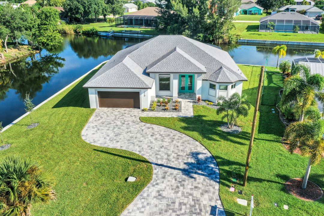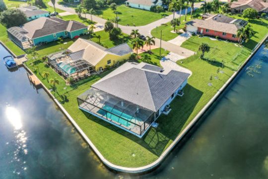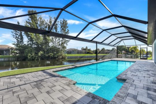 Brand new, modern pool home, custom built, ready to move in. Amazing piece of paradise, situated on a very unique intersecting and oversized dead end corner lot, brand new 254 ft seawall built to the highest standards. Large screened lanai including 33"x11" pool, open floorplan, tray ceilings, impact windows and sliding doors, granite counter tops, wood panel cabinets, stainless steel appliances, tile floor throughout the house, epoxy garage floor, paved driveway, beautiful landscaping. Wake up to beautiful views overlooking intersecting Alhambra und Utica canal in a highly desirable, grown area in SW Cape Coral. There are miles of fresh water canals right out your back door, Alhambra Lake and a chain of other lakes are just around the corner. Enjoy boating, kayaking, fishing, or just bird watching. Be on local beaches, Del Prado, Fort Myers or Punta Gorda in just minutes. Close to shopping, dining, medical facilities, schools and golf courses, calm waters and flood zone X so no flood insurance required. All assessments are in, house comes with a 1 year builder warranty and the possibility to build your own dock.