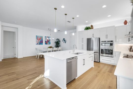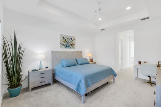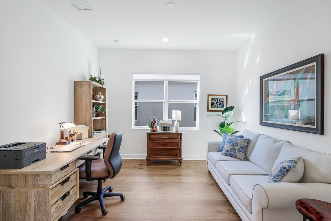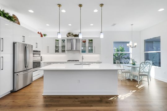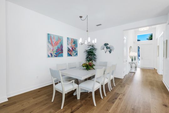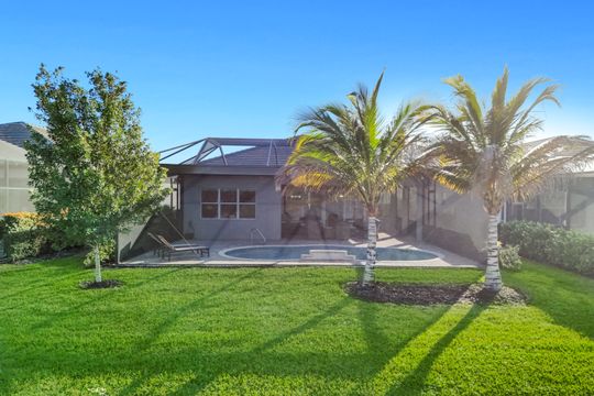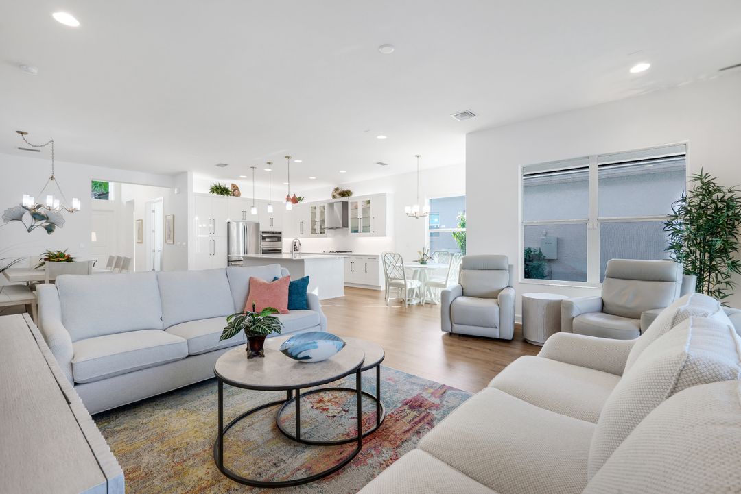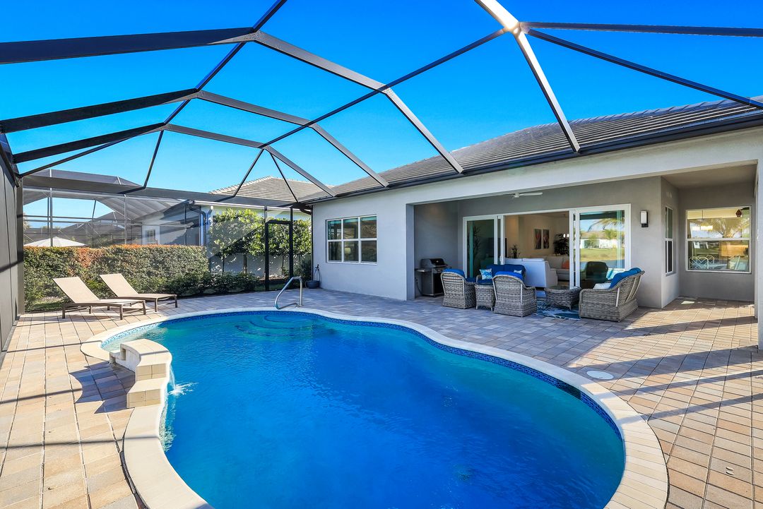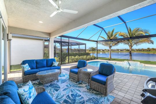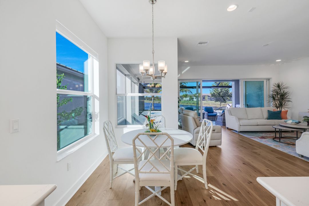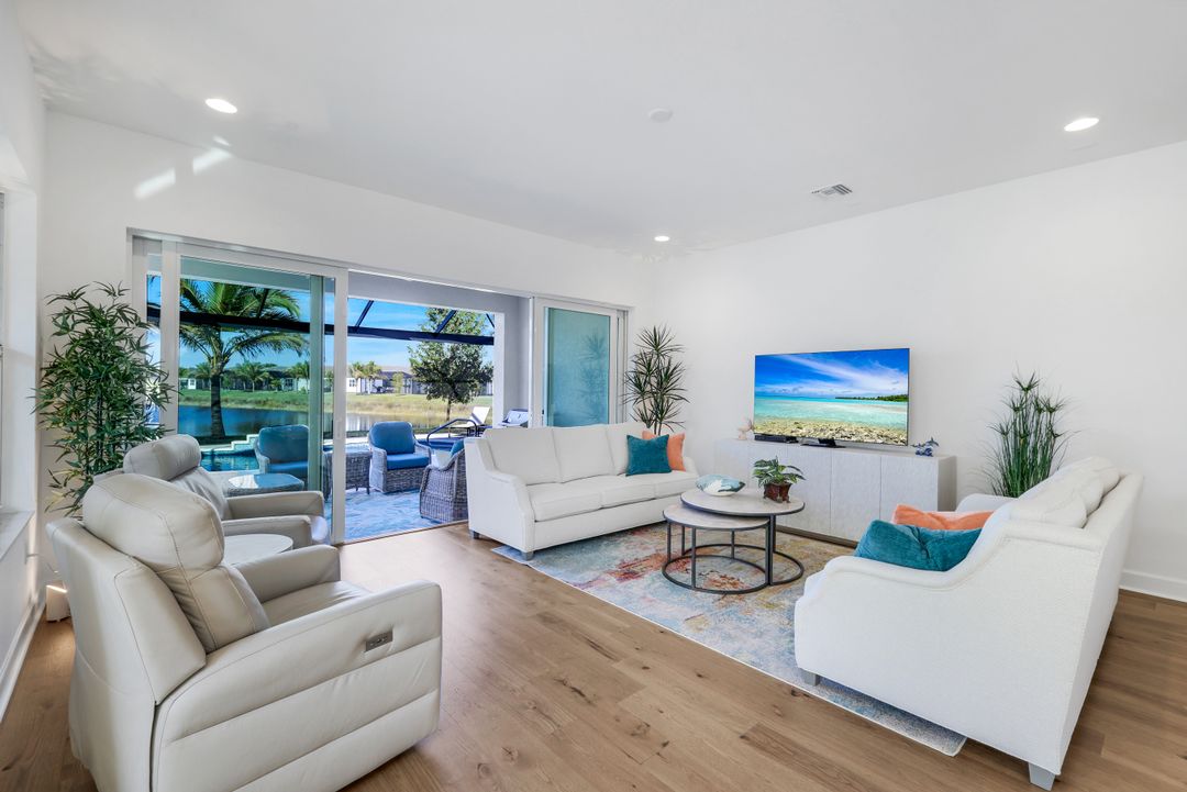 AN IMPRESSIVE ENTRANCE. A BREATHTAKING VIEW. AN EXCEPTIONAL HOME. From the moment you step inside, you are welcomed by a stunning, wide lake view, instantly setting a tone of elegance and serenity in this impeccably designed residence located just a short walk from the award-winning Valencia Trails clubhouse and amenities. This refined home showcases #1 grade hardwood flooring throughout the main living areas and a sophisticated modern aesthetic defined by clean lines, abundant natural light, and a seamless open-concept design created for elevated everyday living and gracious entertaining. The designer kitchen is both striking and functional, featuring crisp white cabinetry, luxurious quartz countertops, premium appliances, and an expansive center island—an ideal gathering space for intimate evenings or stylish entertaining. The great room flows effortlessly through expansive sliding glass doors to a covered lanai overlooking a private pool with picture-window screening, offering a tranquil setting framed by shimmering lake views. The primary suite is a private sanctuary, thoughtfully positioned to maximize privacy and comfort, complete with a spa-inspired bath and generous walk-in closets. Two additional guest suites, each with a dedicated en-suite bath, provide hotel-level comfort for visitors. A versatile den offers the perfect space for a home office, media lounge, or private retreat. Select furnishings are negotiable, presenting an exceptional opportunity for an effortless, move-in-ready transition with refined style already in place. As a resident of Valencia Trails, enjoy access to a grand clubhouse, resort and lap pools, pickleball and tennis courts, a state-of-the-art fitness center, scenic walking trails, and a dynamic social calendar—all within one of Naples’ most prestigious active adult communities. This is not simply a home—it is a statement of refined Naples living. A rare offering where luxury, design, and an extraordinary lakefront setting converge.