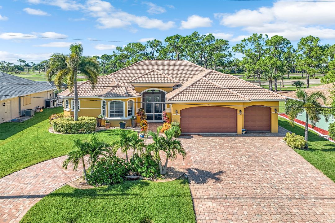 CALLING ALL GOLFERS – 4 Bedroom, 3 Bath, 3-Car Garage, Pool Home with Desirable Southern Exposure and a Great View of the 5th Hole on Palmetto Pine Golf Course! Located in Southwest Cape Coral, this Updated Pool Home is Move-in ready, has Beautiful Landscaping, Circlular Paver Driveway, and Great Curb Appeal. The Decorative Double Front Doors welcome you into this Spacious Home with an Open Floor Plan, 2,430 sq ft of Living area, and High Ceilings. Zero Corner Sliding Glass Doors expand your Living Area into the Large Lanai and Screened Pool area with a Spill-over Waterfall Spa and Outdoor Kitchen, perfect for entertaining. Relax in your own Private Oasis, whether you are swimming in your Heated Pool, unwinding in the Spa, or just enjoying time with friends and family, all while taking in the Amazing Golf Course View. You will Love the Updated Kitchen with Gorgeous Granite Counters, Plentiful Wood Cabinets, Huge Island, Breakfast Bar, Pantry, and Breakfast Nook. The Owner’s Suite has a Tray Ceiling with Accent Lighting, Dual Vanities, Garden Tub, Big Shower, Custom Closets, Linen Closet, and a combination Bidet and Toilet. Additional features include Tile on the Diagonal, Laminate in the Bedrooms, New AC 2020, New Water Heater 2017, Water Softener 2021, Walk-in Closets in 3 of the 4 Bedrooms, Recessed Lighting, Surround Sound, Built-in China Cabinet with Under Cabinet Lighting, Central Vacuum, Laundry room with Utility tub, Pool Bath, Built-in Cabinets and Sink in Garage, and Pull-down stairs for attic access. The Kitchen, Living room, Family room, All Bedrooms, and the Lanai are equipped with Ceiling Fans. One Bedroom is currently utilized as an Office. The Home is Storm Protected with Electric Roll-down Shutters on All Windows, Front Entry, and Lanai. This Home had NO flooding and NO damage due to hurricane Ian. Palmetto Pine Golf Course has No membership required and No HOA fees, you can pay as you play. Ideal location close to Dining, Shopping and Beaches, with easy access to Fort Myers, RSW International Airport and the Punta Gorda Airport. ALL UTILITY ASSESSMENTS ARE PAID IN FULL AND NOT IN A FLOOD ZONE! Make an Offer Today!