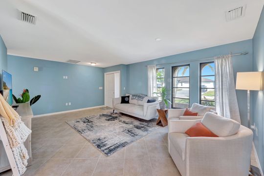 This stunning Southern Exposure pool home offers beautiful landscaping with recessed spotlights, decorative stamped curbing, marble chip rocks, and an irrigation system installed in 2022. The charming screened-in entryway welcomes you into a home featuring diagonal-stacked tile flooring with sleek transition strips and luxury vinyl plank in key areas, as well as fresh interior paint throughout. The kitchen boasts granite countertops, a stacked-stone backsplash with decorative inlay, a window overlooking the pool, wood cabinetry, recessed lighting, and a 2024 stainless steel appliance package. Vaulted ceilings with backlit crown molding enhance the living room, while the spacious laundry room includes a laundry sink for added convenience. The primary bedroom offers private pocket sliding doors leading to the pool area, a huge walk-in closet, and an en-suite bath with granite countertops and a floor-to-ceiling tiled shower. The outdoor space features a screened-in pool with a waterfall, freshly painted lanai flooring, and an outdoor bar area perfect for entertaining, all enclosed by a 6-foot privacy fence. Additional highlights include a new roof installed in 2022, a new HVAC system in 2023, updated electrical and water heater in 2023, a pool bath, and guest bedrooms with walk-in closets. This home is a perfect blend of style, comfort, and functionality, offering everything you need to enjoy the Southwest Florida lifestyle. Schedule your private showing today!