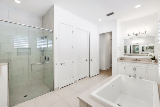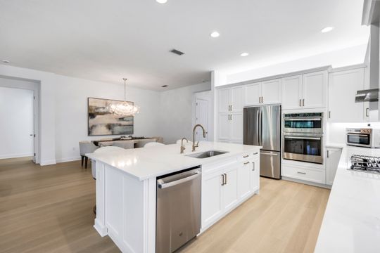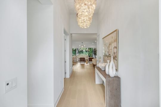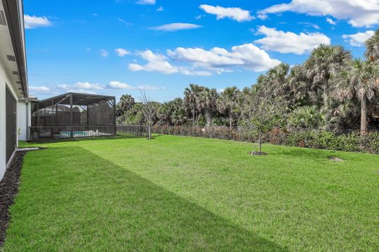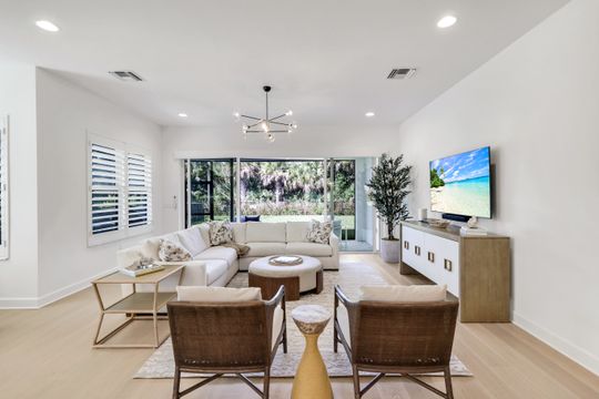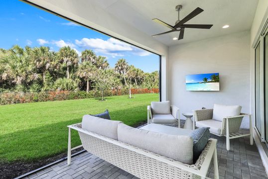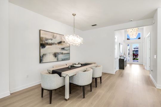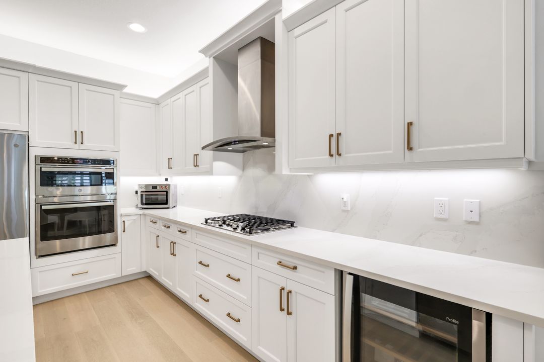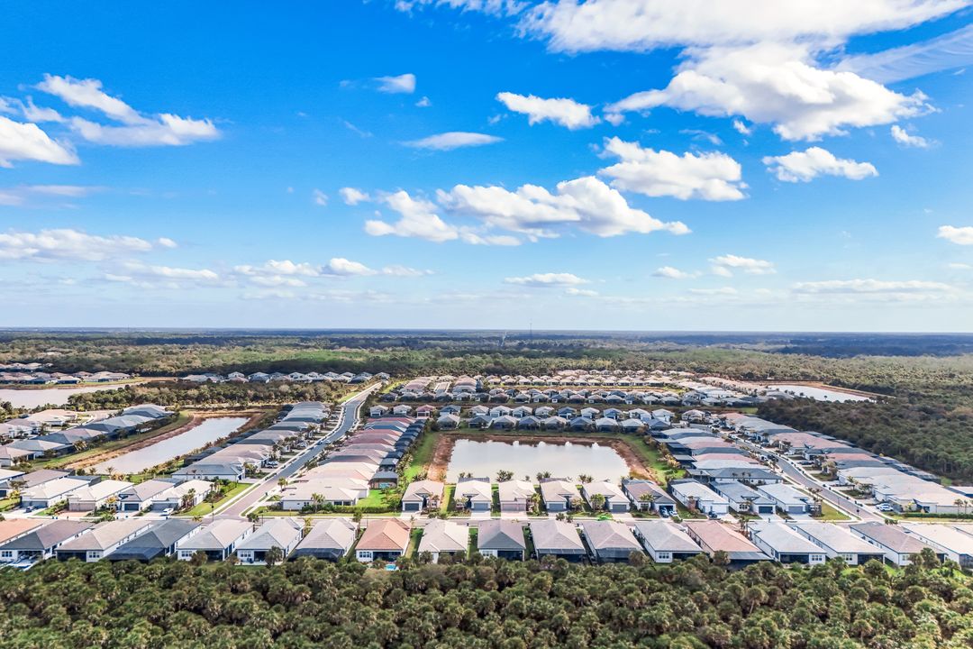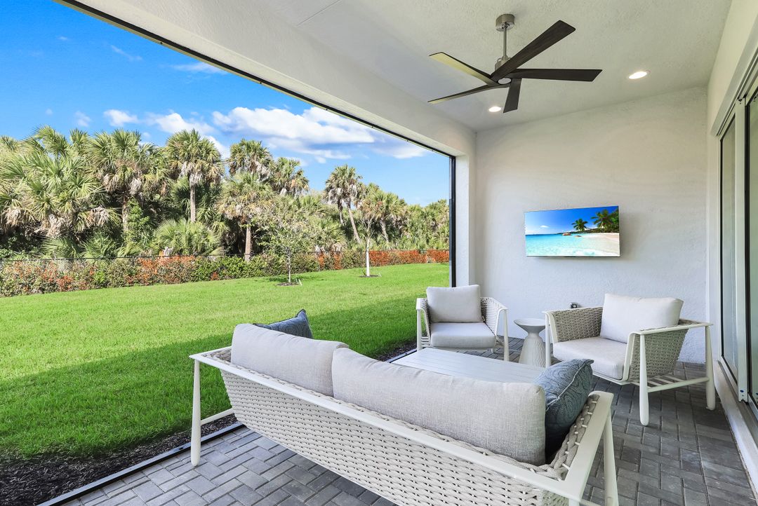 Coastal elegance and effortless living come together in this tastefully appointed Pearl floor plan, ideally positioned within the vibrant community of Valencia Trails. With over $200,000 in builder upgrades and owner customizations, this home showcases an elevated level of finishes and thoughtful design throughout. A glass entry door opens to a welcoming foyer with soaring coffered ceilings accented by dramatic chandeliers. One of the home’s most striking features is the French white oak hardwood flooring installed throughout the main living areas—a custom upgrade that brings warmth, texture, and timeless coastal style well beyond standard builder finishes. Curated lighting fixtures, designer ceiling fans, and plantation shutters further enhance the home’s refined interior. The great room flows seamlessly into both formal and casual dining areas and a light-filled gourmet kitchen, creating an inviting space where family and guests can gather with ease. The kitchen features upgraded white shaker cabinetry, quartz countertops and backsplash, a large cabinet-wrapped island, deep single-bowl sink, instant hot faucet, champagne-toned faucet and hardware, and ambient lighting. GE appliances include a gas range, vented hood, and beverage refrigerator, offering everyday functionality. The split-bedroom floor plan offers privacy for owners and guests alike. The spacious primary suite includes two finished walk-in closets and a spa-like bath with dual vanities, a soaking tub, and an oversized walk-in shower with multiple shower heads, bench seating, and frameless glass enclosure. Two guest bedrooms and two full baths provide inviting space for visitors, complemented by a versatile French-door den ideal for a home office, media room, or sitting area. Indoor living extends naturally to the L-shaped screened lanai, designed with separate areas for relaxing and dining. An outdoor kitchen makes entertaining easy while the peaceful western preserve view provides a beautiful backdrop for evening sunsets. The homesite offers ample room to create your own outdoor oasis with space for a future pool. Additional features include hurricane-impact windows and doors, a finished laundry room with GE washer and dryer, cabinetry and sink, and a prime location within the community with quick and convenient access to the Vanderbilt Beach Road entrance. This thoughtfully designed Pearl floor plan offers 2,450 square feet of well-planned living space, creating a home that feels both spacious and easy to maintain—an ideal choice for year-round residents or seasonal snowbirds. Valencia Trails is more than a community—it’s a lifestyle. This exclusive 55+ neighborhood offers a spectacular 43,000-square-foot clubhouse featuring a gourmet restaurant, poolside bar, resort-style pools, fitness center, pickleball, tennis, bocce, yoga studio, art studio, cooking classes, spa, dog park, and a vibrant social calendar. Here, every day feels like a resort getaway.