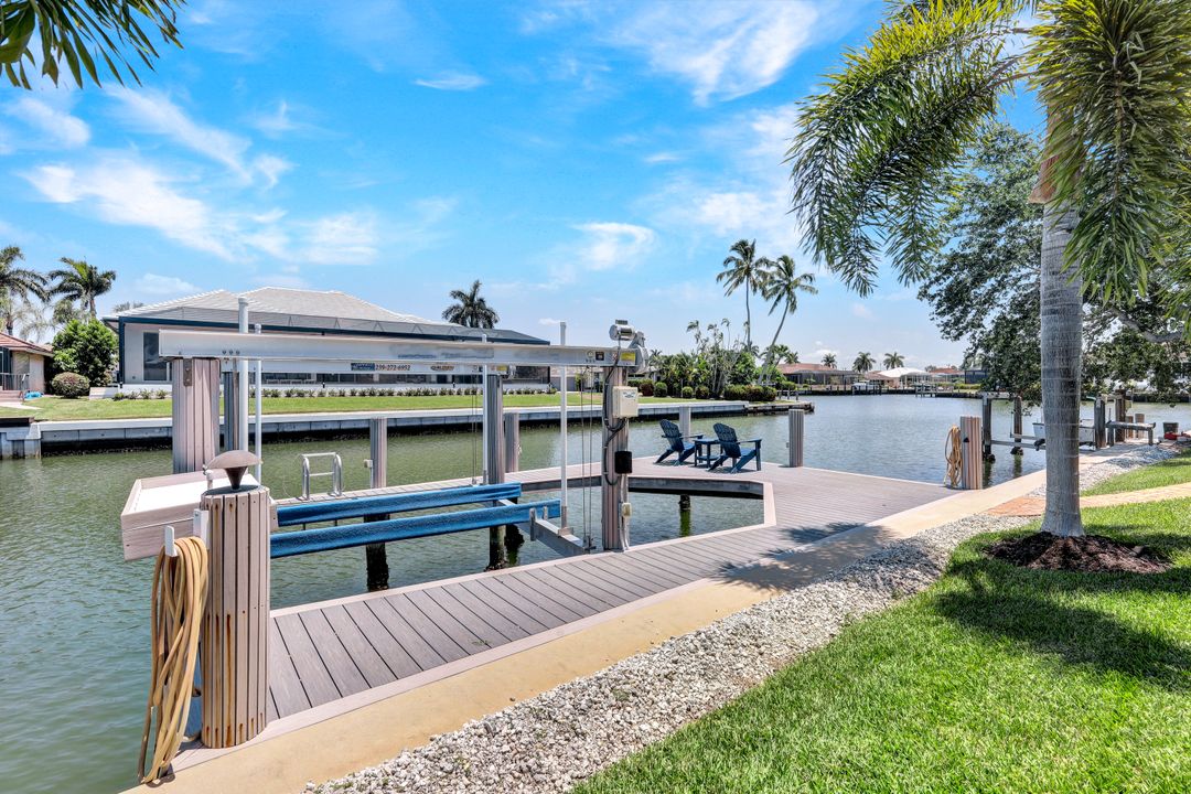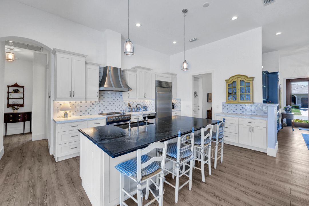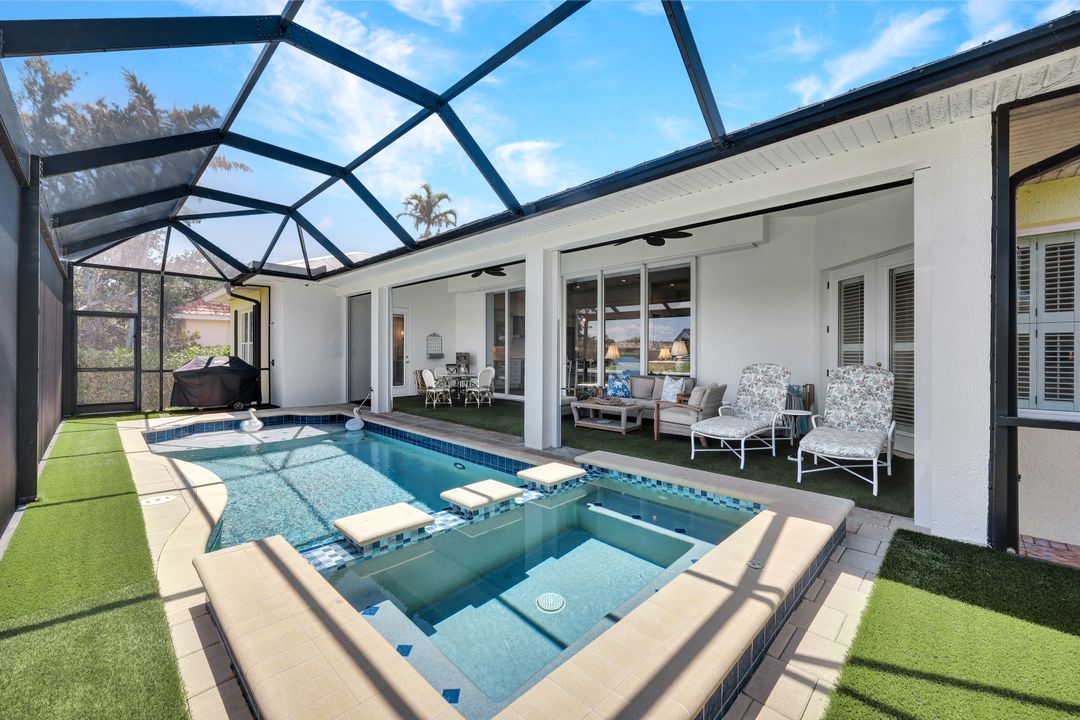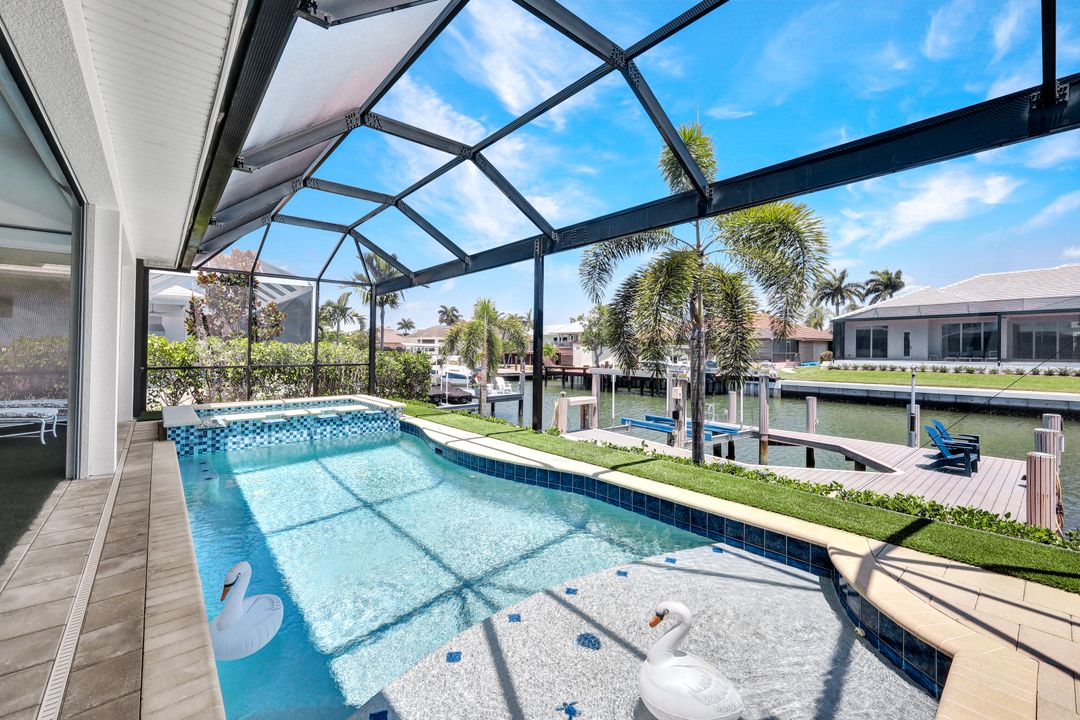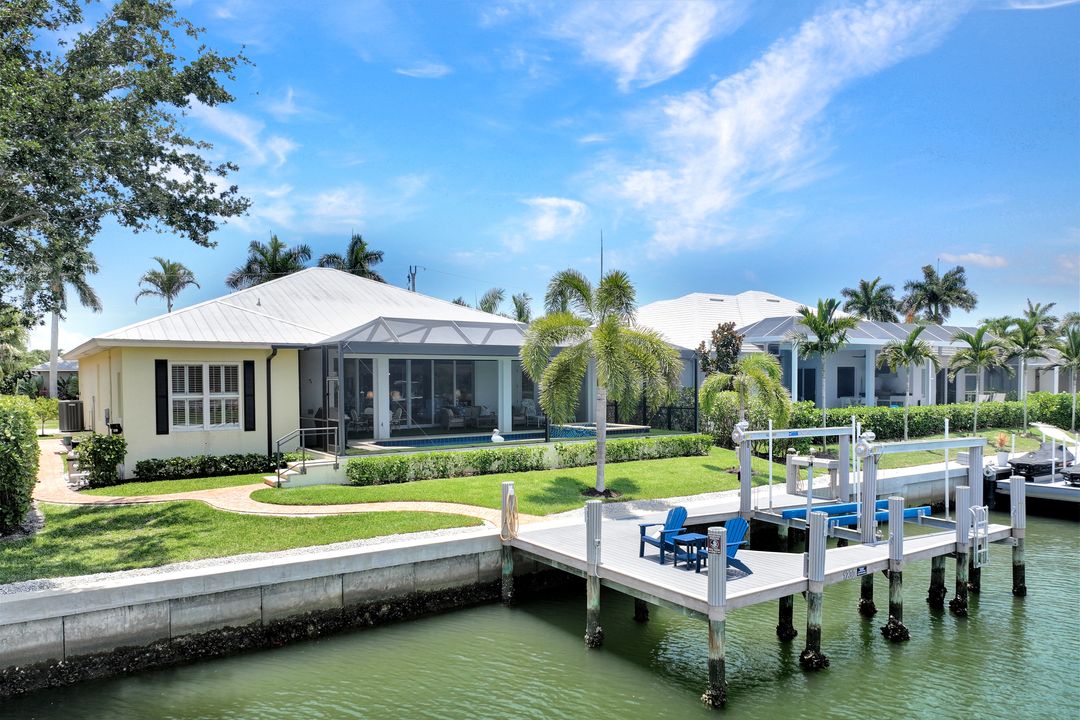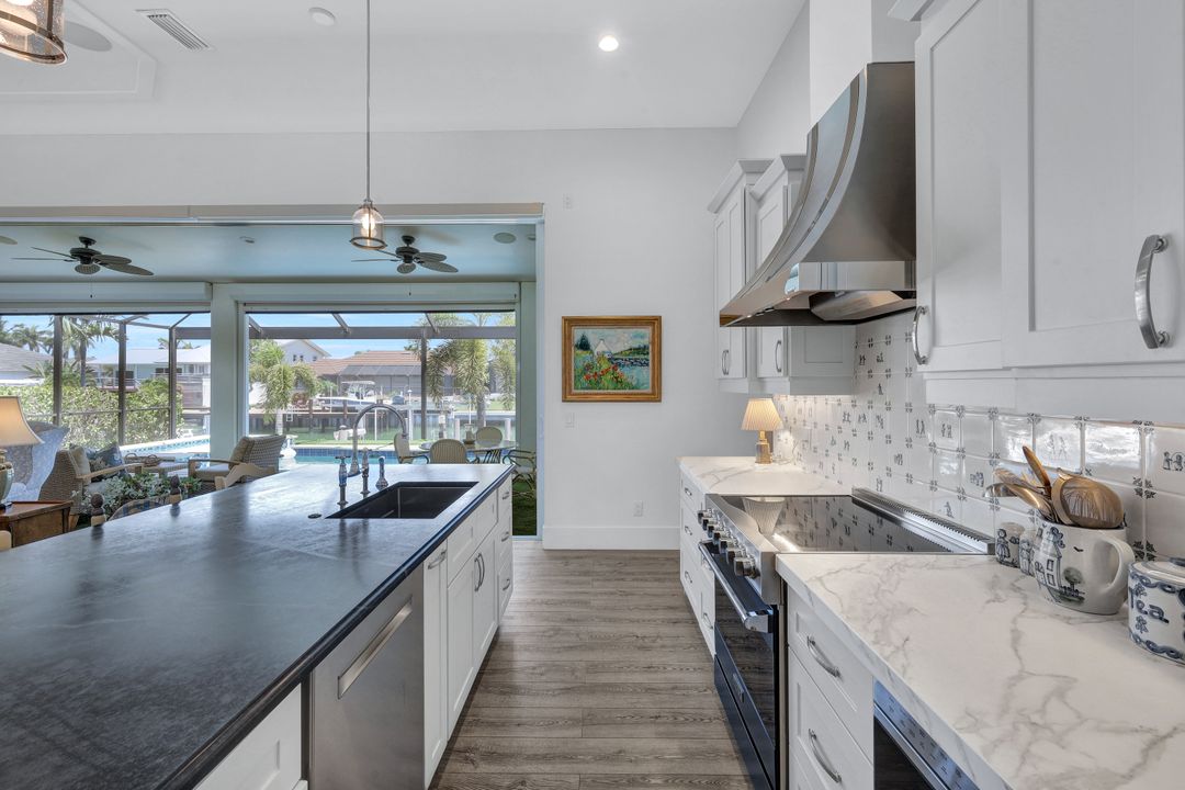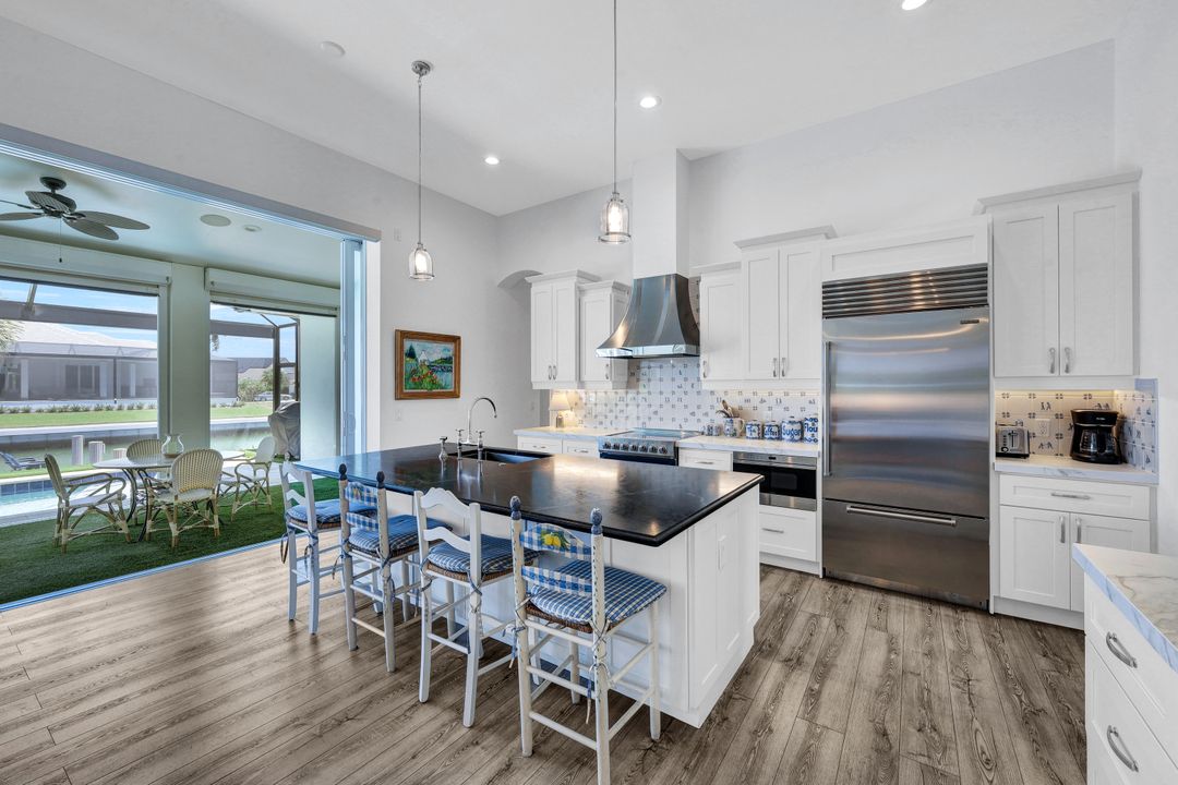 Find your paradise in this exquisitely finished waterfront 3 bedroom, 3 bath home where custom touches abound. Upon entry to the great room, be greeted with sweeping canal views through full wall retractable sliders. Entertain in a 2021 renovated Chef’s kitchen complete with a special-order blue Viking stove, Subzero refrigerator, Bosch dishwasher, Vent-A-Hood fan, soapstone island, polished nickel Perrin & Rowe faucet, and a backsplash of Delft tiles imported directly from Holland. An oversized pantry and custom hand-painted wet bar complete the space. This home brings the best of both privacy and gathering spaces with an open concept great room and dining area as well as a separate office with pocket doors overlooking the front porch. A 2021 renovated bath completes inside luxury updates. Outside, find a pool and jacuzzi on the lush lanai. New shutters and exterior lantern style lighting enhance the home’s Floridian cottage style charm, while new landscaping provides privacy, and a new Chicago Brick salvaged walkway provides luxurious access to the private dock with boat lift for quick Gulf access. Other upgrades include new pool heater and pump (2022), new air conditioner (2021), new washer and dryer, new hot water heater and Storm Smart fabric hurricane shades to protect the outside space and provide shade on sunny days. Built in 2017, this home has all the modern updates including impact glass windows, doors, and sliders that kept the home safe from damage in Hurricane Ian as well as luxury vinyl plank flooring. All that is missing is you. Welcome home.