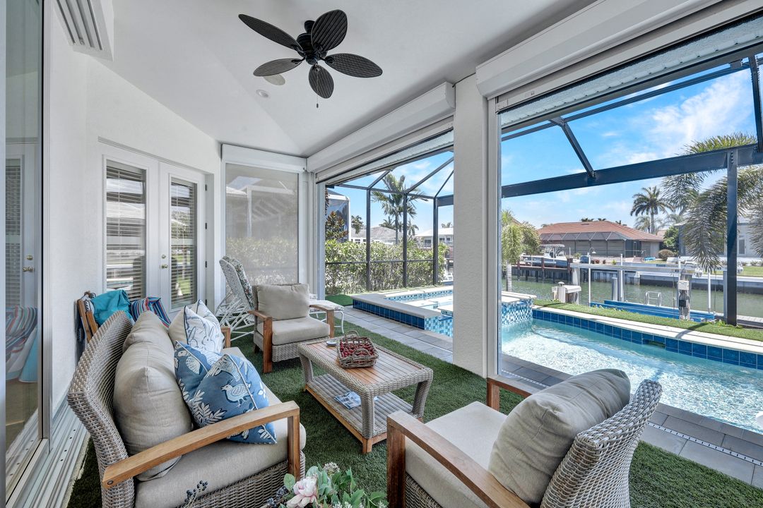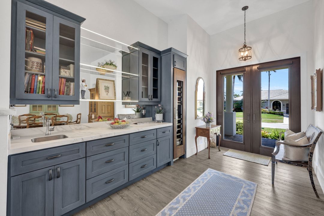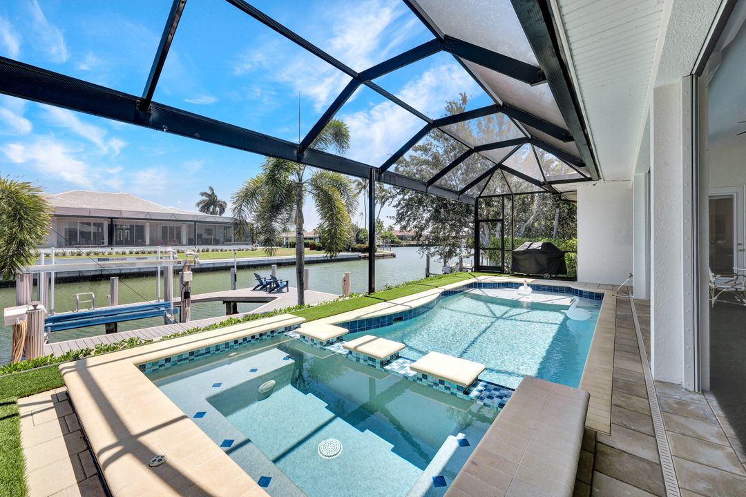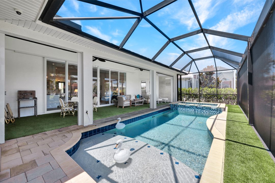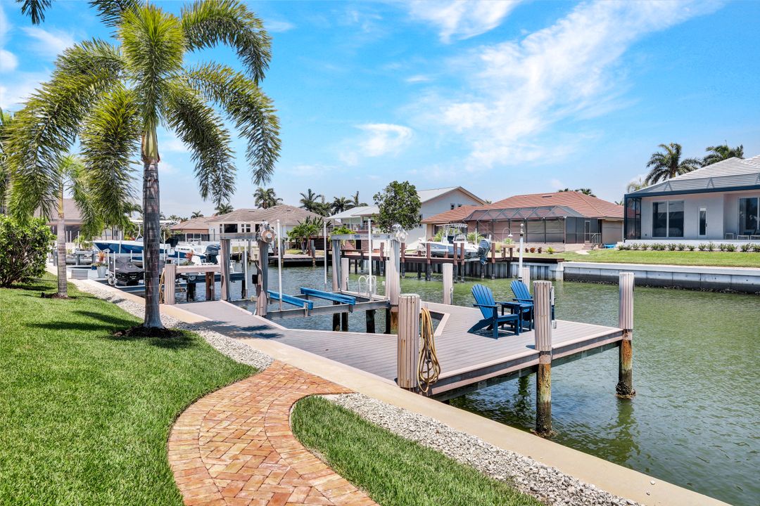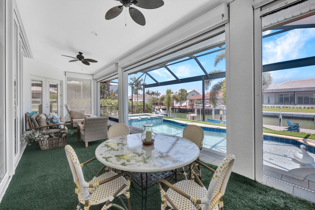 Find your paradise in this exquisitely finished waterfront 3 bedroom, 3 bath home where custom touches abound. Upon entry to the great room, be greeted with sweeping canal views through full wall retractable sliders. Entertain in a 2021 renovated Chef’s kitchen complete with a special-order blue Viking stove, Subzero refrigerator, Bosch dishwasher, Vent-A-Hood fan, soapstone island, polished nickel Perrin & Rowe faucet, and a backsplash of Delft tiles imported directly from Holland. An oversized pantry and custom hand-painted wet bar complete the space. This home brings the best of both privacy and gathering spaces with an open concept great room and dining area as well as a separate office with pocket doors overlooking the front porch. A 2021 renovated bath completes inside luxury updates. Outside, find a pool and jacuzzi on the lush lanai. New shutters and exterior lantern style lighting enhance the home’s Floridian cottage style charm, while new landscaping provides privacy, and a new Chicago Brick salvaged walkway provides luxurious access to the private dock with boat lift for quick Gulf access. Other upgrades include new pool heater and pump (2022), new air conditioner (2021), new washer and dryer, new hot water heater and Storm Smart fabric hurricane shades to protect the outside space and provide shade on sunny days. Built in 2017, this home has all the modern updates including impact glass windows, doors, and sliders that kept the home safe from damage in Hurricane Ian as well as luxury vinyl plank flooring. All that is missing is you. Welcome home.