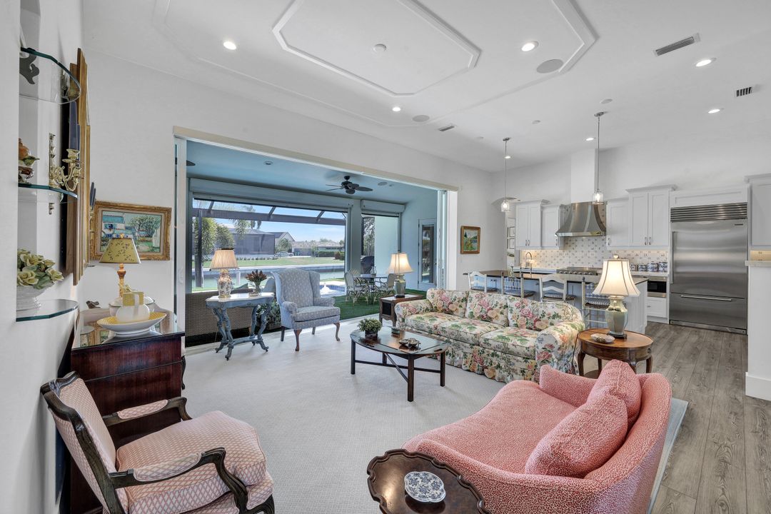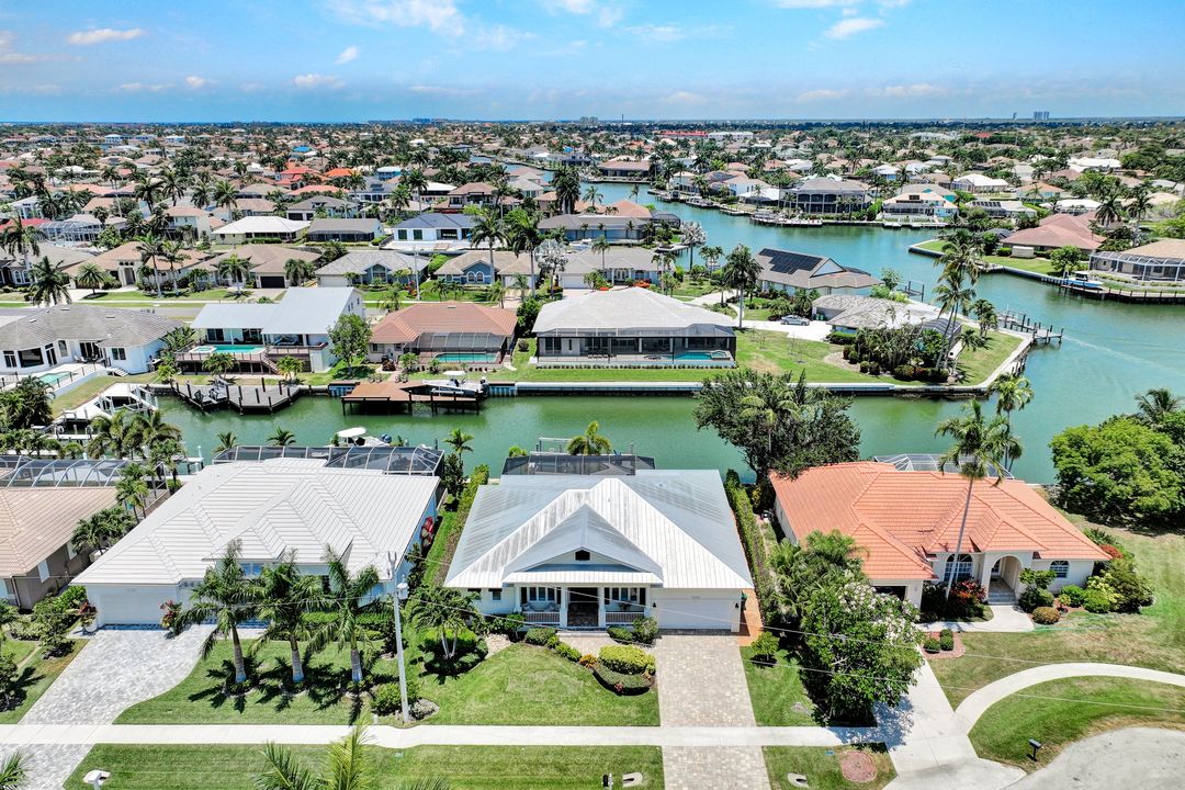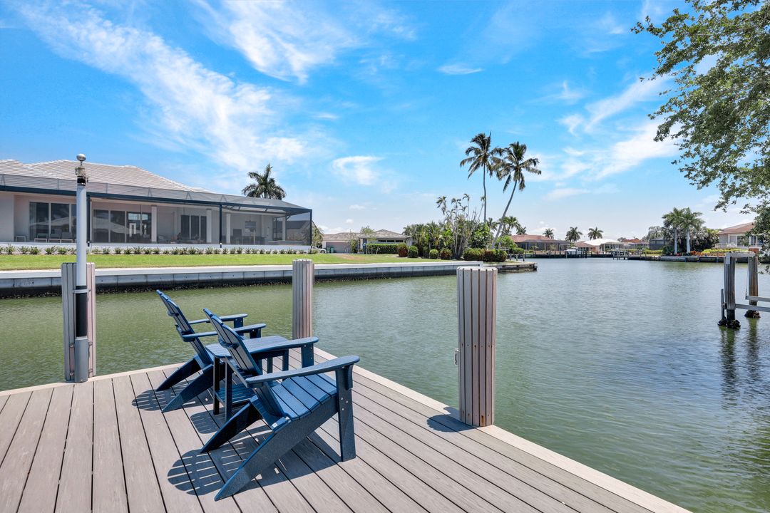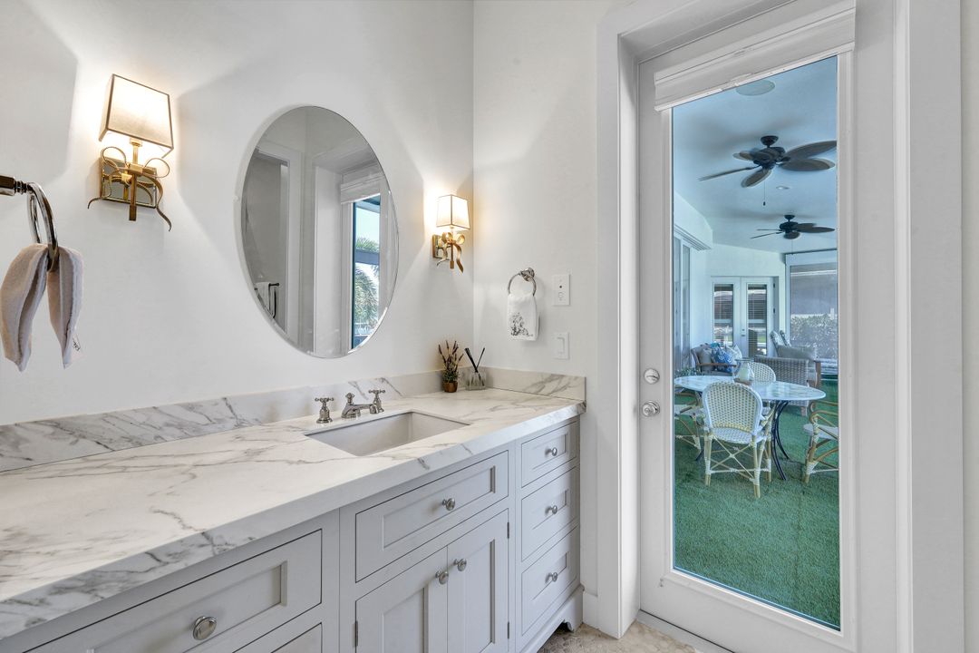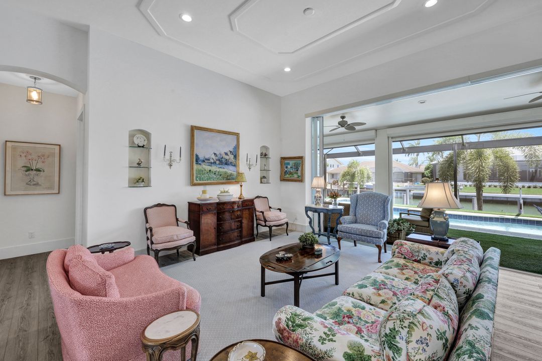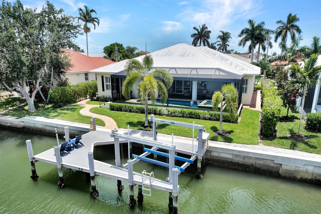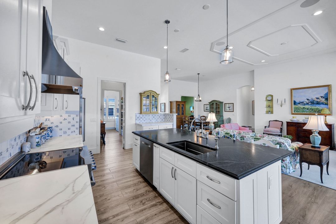 Find your paradise in this exquisitely finished waterfront 3 bedroom, 3 bath home where custom touches abound. Upon entry to the great room, be greeted with sweeping canal views through full wall retractable sliders. Entertain in a 2021 renovated Chef’s kitchen complete with a special-order blue Viking stove, Subzero refrigerator, Bosch dishwasher, Vent-A-Hood fan, soapstone island, polished nickel Perrin & Rowe faucet, and a backsplash of Delft tiles imported directly from Holland. An oversized pantry and custom hand-painted wet bar complete the space. This home brings the best of both privacy and gathering spaces with an open concept great room and dining area as well as a separate office with pocket doors overlooking the front porch. A 2021 renovated bath completes inside luxury updates. Outside, find a pool and jacuzzi on the lush lanai. New shutters and exterior lantern style lighting enhance the home’s Floridian cottage style charm, while new landscaping provides privacy, and a new Chicago Brick salvaged walkway provides luxurious access to the private dock with boat lift for quick Gulf access. Other upgrades include new pool heater and pump (2022), new air conditioner (2021), new washer and dryer, new hot water heater and Storm Smart fabric hurricane shades to protect the outside space and provide shade on sunny days. Built in 2017, this home has all the modern updates including impact glass windows, doors, and sliders that kept the home safe from damage in Hurricane Ian as well as luxury vinyl plank flooring. All that is missing is you. Welcome home.