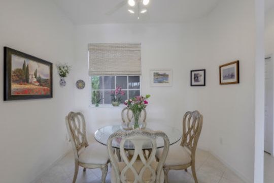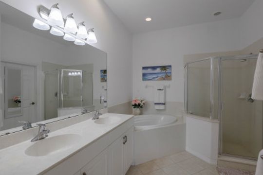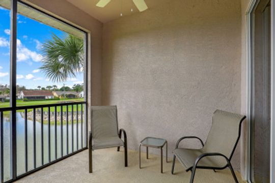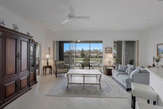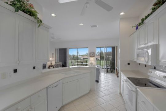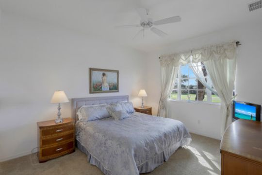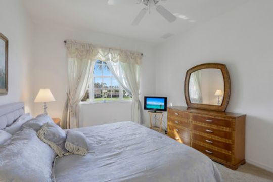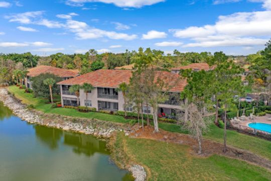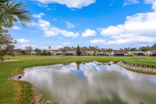 GOLF MEMBERSHIP INCLUDED! Gorgeous golf course view overlooks a beautiful lake and our signature hole #18! Very spacious coach home offers 3 BEDS 3 BATHS EACH A PRIVATE SUITE. High ceilings and nicely furnished, move in ready! Located in the highly desirable neighborhood of Grand Pines, this home features a great room floorplan, an eat-in kitchen with breakfast bar that opens to a large lanai making this home perfect for year-round entertaining! Relax in this home while enjoying the beautiful lake and golf course views. Extra-long one car attached garage large enough to accommodate a car and your golf cart. Grand Pines is financially secure with sufficiently funded reserves! Hunters Ridge is very friendly, casual, and offers a large variety of social activities. Hunters Ridge is financially stable and no CDD's!! Enjoy all a private golf country club has to offer including large community swimming pool with poolside cafe, club patio bar, fitness center, clubhouse, dining room and grill room, tennis courts, pickleball courts, bocce ball, golf simulators and much more!
