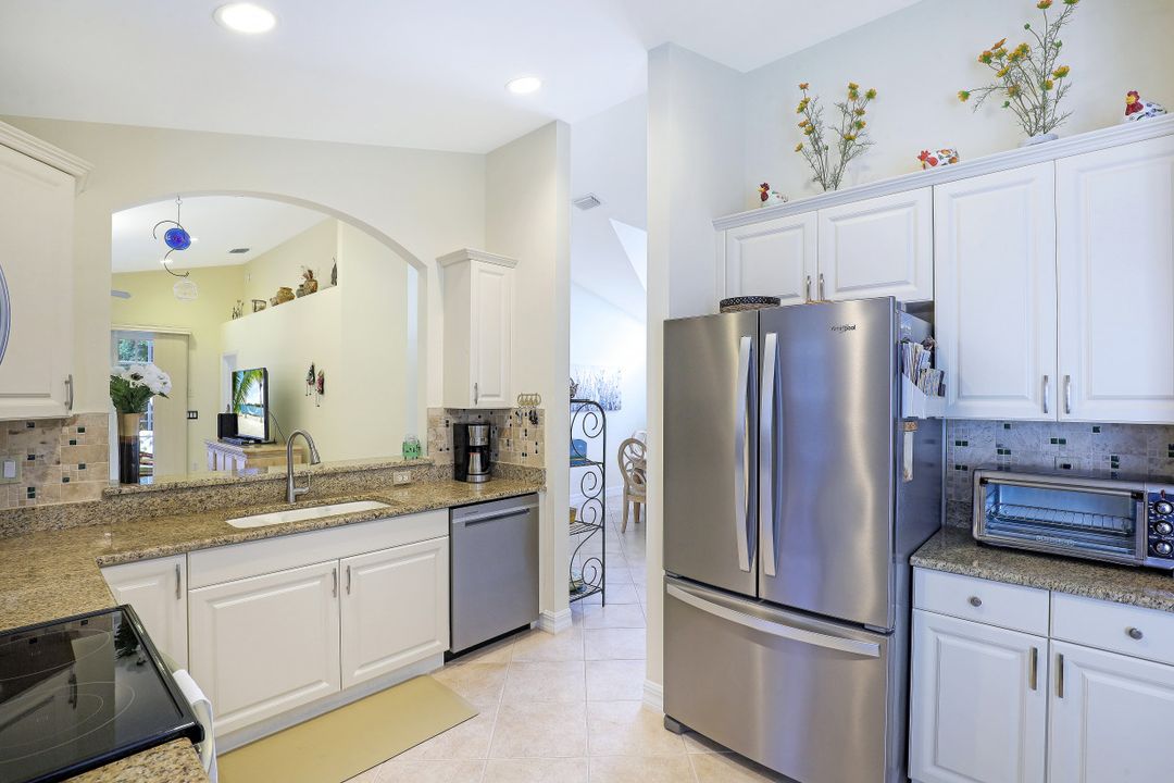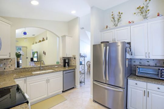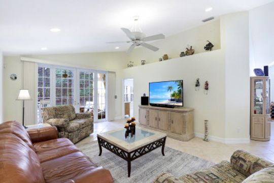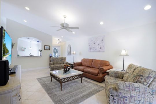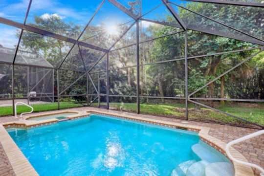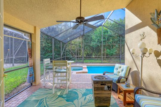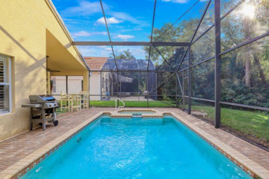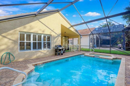 Just steps away from the Clubhouse, this "Cortina model" single family home offers 2 Bedrooms+Den, 2 Baths, and almost 1800 Sq Ft under air has been lovingly maintained by its original owners. Vaulted ceilings and a Great Room style floorplan give this home an open and airy feel along with a split floorplan was the Master Suite in the back of the home and the Guest Suite/Den in the front. A long list of upgrades and updates include: NEW ROOF (2019); diagonal tile floors throughout the common areas and luxury vinyl in the bedrooms/den; Glass front door; updated kitchen including granite countertops, tile backsplash, and newer SS appliances; plantation shutters throughout; Hurricane shutters; fresh interior paint; fresh exterior painting to be completed on Jan 17th! Enjoy the Florida sun around the heated pool & sunken spa and expanded deck. Room behind and to the side of the cage to fence in the yard! "Club at Saturnia Grande" offers resort pool, hot tub, lap pool, kiddie pool, saunas, fitness center, billiards room, ball room, 4 tennis courts, basketball court, and more! HOA fees include Landscaping, Irrigation, Clubhouse Amenities, Alarm Monitoring, Cable TV, Internet, and Phone! A RATED SCHOOLS!