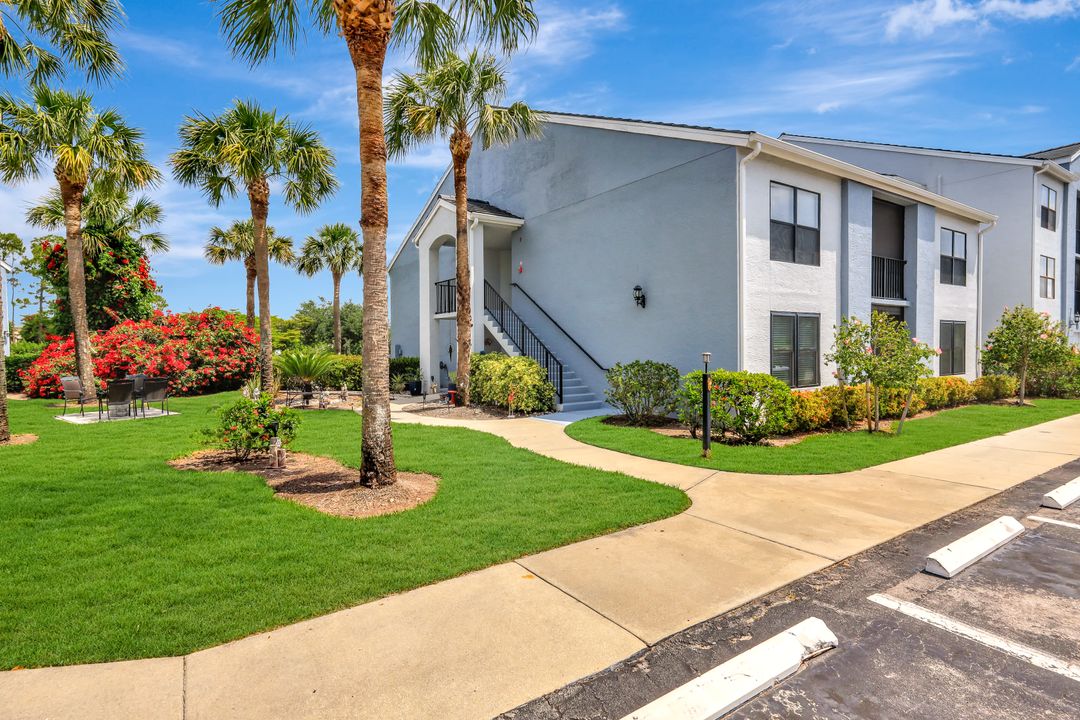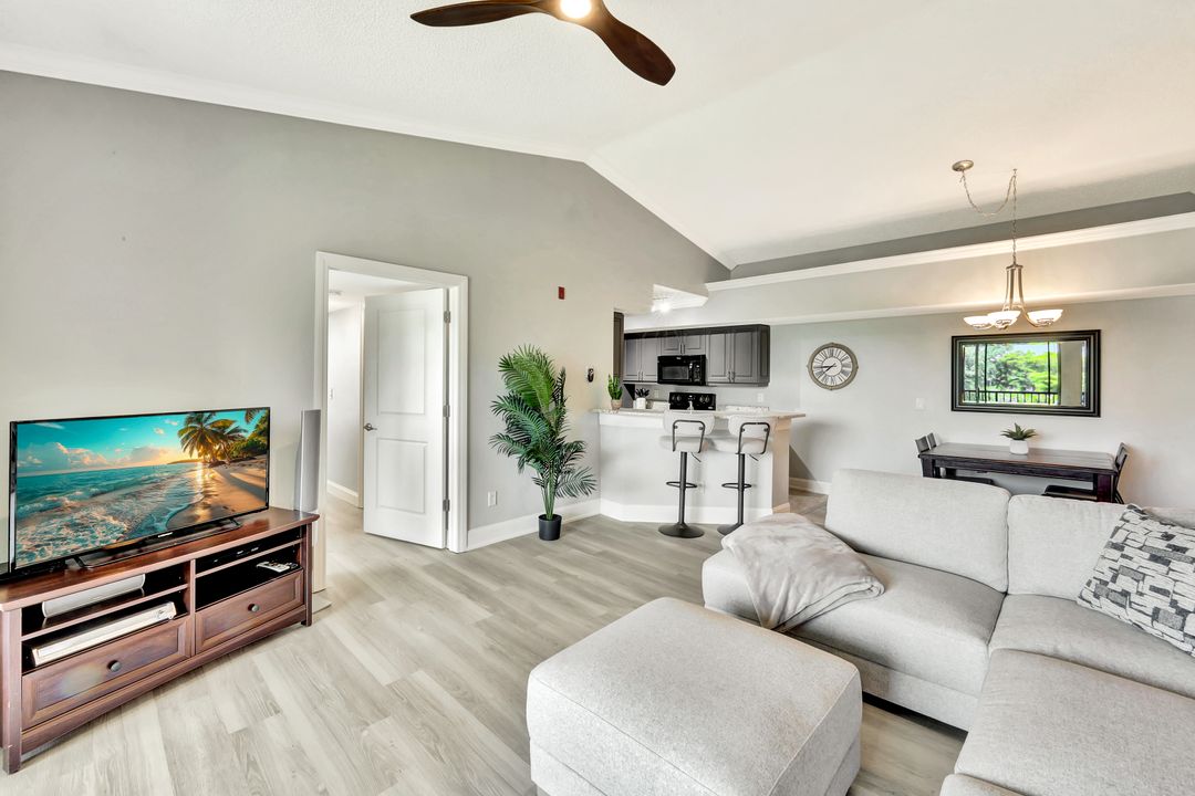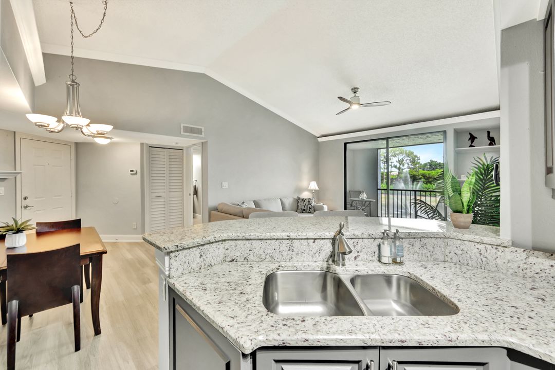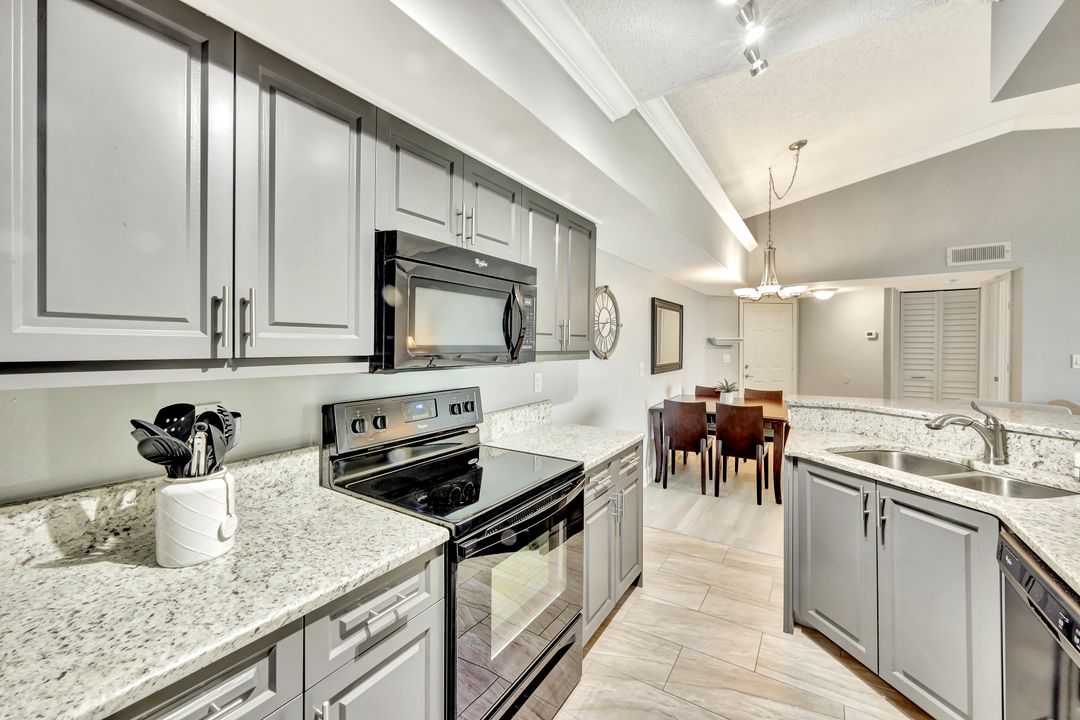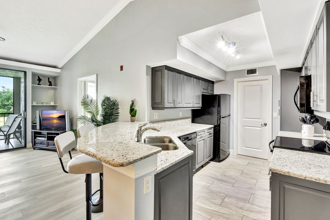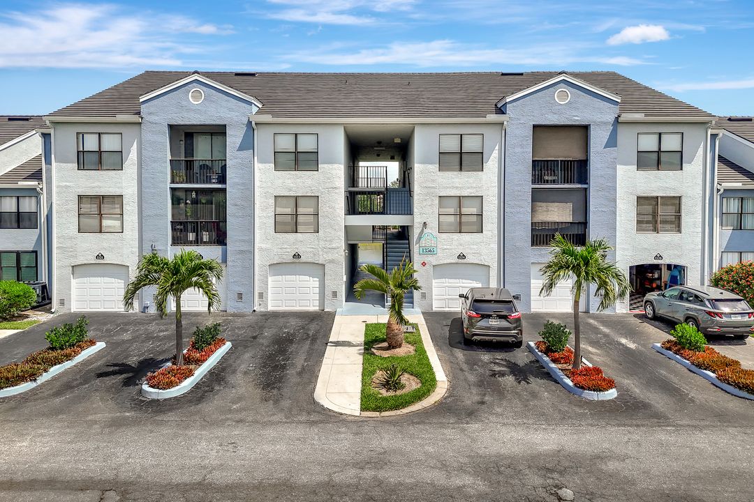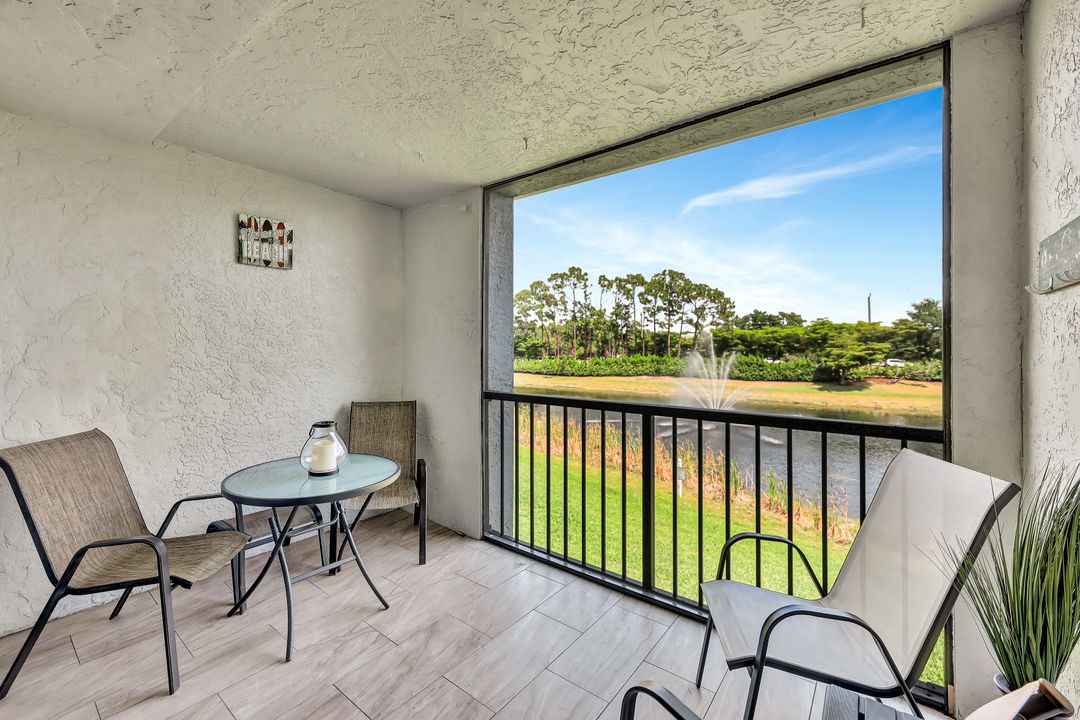 Renovated 3 Bed, 2 Bath second- floor Condo with Lake Views at Musa at Daniels. Enjoy peaceful lake and fountain views from your extended screened lanai, a rare feature that gives you just a little more room to relax and unwind. Inside, the kitchen is thoughtfully updated with quartz countertops, soft-close drawers, black appliances, and a spacious pantry. The vaulted ceilings create an open, airy feel, while luxury vinyl and tile flooring highlight the main living areas and cozy carpeting warms the bedrooms. Both secondary bedrooms can be conveniently separated by a door, perfect for privacy or guests, and the primary suite features a large walk-in closet. Additional updates include a new hot water heater, an AC unit that is just a few years old, and a recently completed roof (2023). A laundry closet is tucked away for easy access. The active community offers two pools, a fitness center, tennis courts, and a vibrant social atmosphere. Your HOA dues conveniently cover internet and Direct TV. Plus, this condo comes with the opportunity to inherit a garage lease by continuing the affordable monthly rental—a fantastic bonus for extra storage or covered parking. Located just minutes from I-75, this home combines comfort, style, and an unbeatable central location. Don't miss out on this move-in ready opportunity!