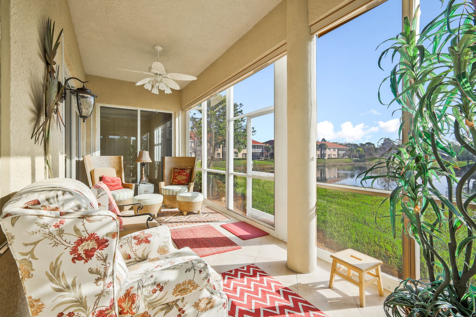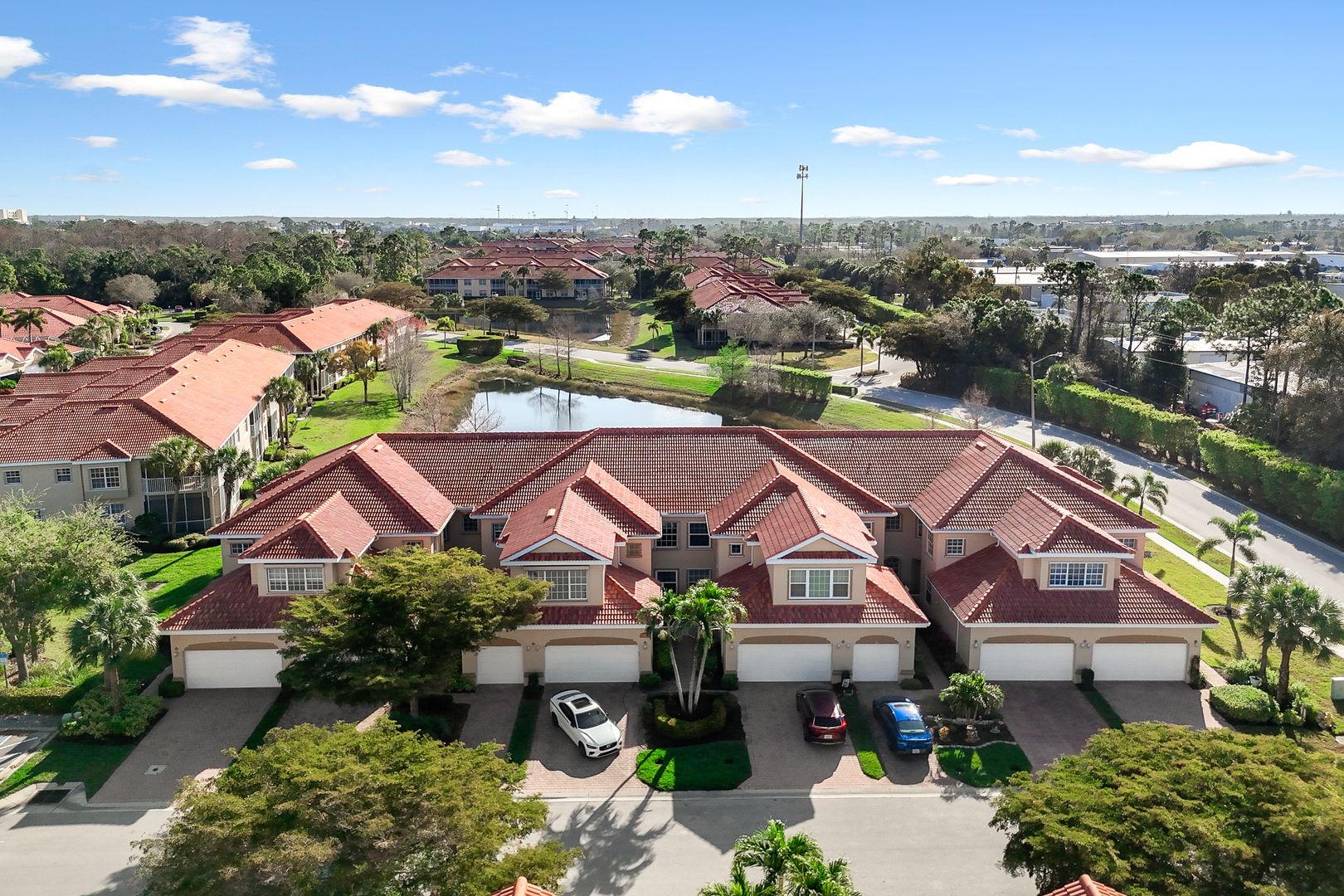 Welcome to Bell Tower Park, one of Fort Myers’ most desirable gated communities, where comfort, space, and the Florida lifestyle come together beautifully. This spacious 3-bedroom, 2.5-bath condo with a 2-car garage offers over 1,700 square feet of living space and features a foyer entry that opens into a semi-open floor plan, creating a welcoming flow that feels both open and private. As an end unit, the home enjoys extra natural light and added privacy, while the eastern rear exposure provides stunning Florida sunrises over the peaceful pond view. Inside, you'll find tile flooring throughout most of the living areas, with laminate in one guest bedroom and carpet in the primary suite and additional guest bedroom for comfort. The kitchen is both stylish and functional with wood cabinetry, granite countertops, a cozy breakfast nook, and a RainSoft water filtration system, while crown molding and plantation shutters add an elegant touch throughout the home. The unit also features a new HVAC system, providing added comfort and peace of mind. Located in an X flood zone, meaning no flood insurance is required for financing, the property also features a durable tile roof and the ease of low-maintenance living. Bell Tower Park is an amenity-rich community offering basketball, tennis, pickleball, a bocce court, playground for the kids, two resort-style pools, a spa, and a fully equipped fitness center, and the low HOA fees include cable and internet. All of this is set in a prime central Fort Myers location just a short drive to dining, shopping, entertainment, and Southwest Florida’s beautiful beaches.