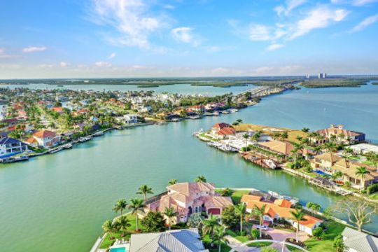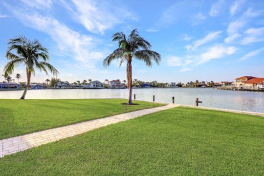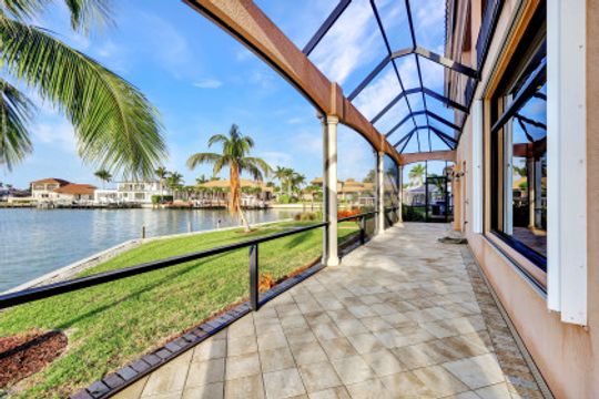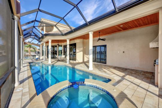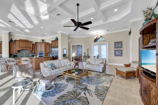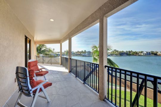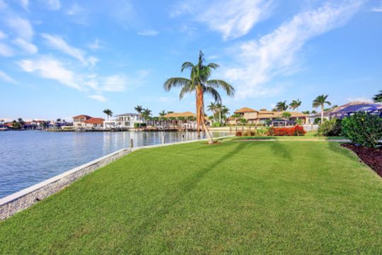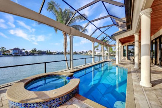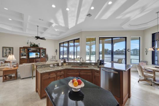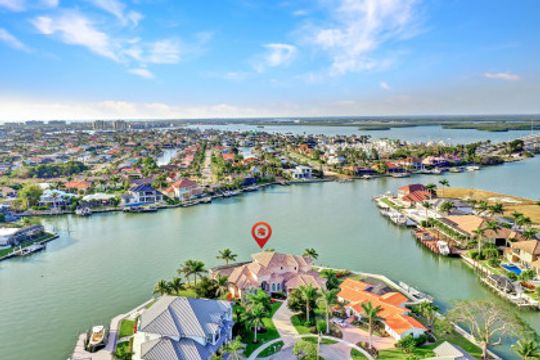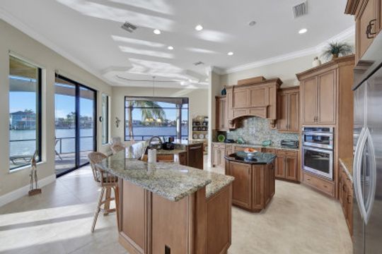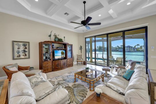 Wake up to breathtaking wide bay views. This waterfront Marco Island tip lot location affords privacy and features a 224 ft triple reinforced wrap-around seawall (2012) with 115 ft wood lined covered and screened lanai with additional grassy yard. Welcome to this water direct coastal contemporary home of 4 Bed | 4.5 Ba | 3617SF, located on a cul-de-sac of nearly 1/2 an acre (.49). Enjoy the shallow beach pool with waterfall spa, outdoor shower and summer kitchen with built-in grill and walls of telescopic sliders maximizing the views. Overlook the water from the great room open plan living, dining, kitchen and all 4 ensuite bedrooms. The kitchen includes a breakfast bar with seating for 6, pantry closet, built-in desk and dining area. Enter through French doors to the private primary ensuite with 2 walk-in closets and bath with separate vanities, soaking tub, and walkthrough in shower. A 2nd ground floor guest ensuite overlooking the water, is followed by 2 upper ensuite bedrooms joined by a common living room with wet bar & built-in entertainment center, all accessing a waterfront terrace. Architectural features include a roomy, airy feel to the home with high, volume, tray and box beam ceiling, recessed lighting, impact windows and doors, and 3 zoned A/C, with graceful arches through the interior and exterior. A large garage for 3 cars can fit a 4th, with loading space and parking in the drive. Tropical landscaping includes majestic Royal Palms. This is the ultimate light and bright entertainers' home; perfect for indoor/outdoor waterfront living and enjoying the Florida lifestyle. Contact Pat Wilkins, Broker Associate | 239-290-8593 | patwilkins@marcoexpert.com | https://marcoexpert.com