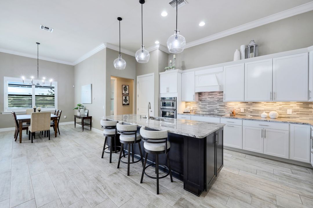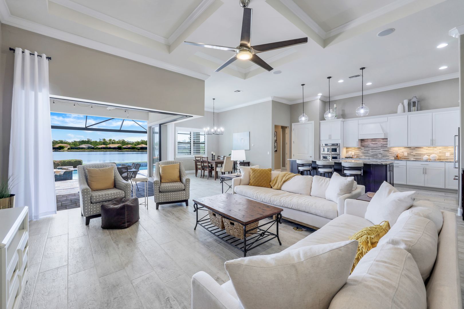 Highly sought after Clubview floor plan in desirable Coconut Shores! This 4+Den, 3 Bath, 3-car garage home is situated on the spectacular 240-acre lake with never-ending water views. Stepping into the impressive entryway, you are drawn from the foyer through the great room and out to the extraordinary serenity of the oversized lanai. The heart of this home is a gourmet kitchen with everything the chef desires. You will have many choices for entertaining, either in the spacious great room, formal dining area, or on the lanai through the zero/corner sliders for easy flow from indoor to outdoor living. Enjoy a dip in the pool, a soak in the spa, and a memorable meal prepared in the outdoor kitchen. The master suite is a private oasis enhanced by dual walk-in closets accented with built-in closet systems. Exceptional finishes include solid core doors, porcelain tile flooring in main living areas and extensive use of crown molding highlighting the sky-high coffered and tray ceilings. Versatile work spaces are offered in the large den and the bonus den/craft room. Amenities galore in this coastal-themed community include resort-style pool, restaurant outdoor bar, and fishing pier.