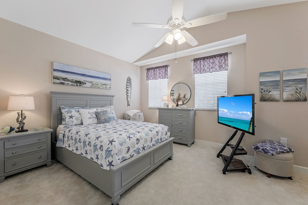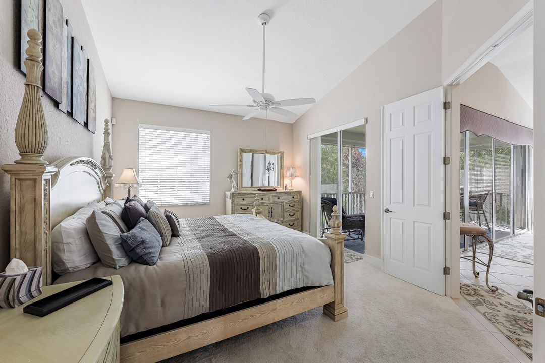 Then why not secure this Lakefront, beautifully and well appointed 2nd flr Condo as your temporary or long term retreat? This 3/2 is ready for the most particular individuals as it offers a long lake view (an aviary delight) and a distant golf course view (if you can’t play it critique it). Well maintained and in good taste, this fully equipped condo has all that one could need. High vaulted ceilings, wall of sliders out to large Lanai for afternoon drinks or lazy naps…Great Rm Floorplan with Formal DR, Eat in Kitchen and breakfast bar, split Bedrooms, one w/QSize, the other w/Tsize. The MBR Ensuite (w/KSize) offers separate shower and garden tub, dual sinks plus plenty of closet space for the “wardrobe,” be it casual, dinner attire, athletic/swim wear…BONUS…attached SGL Car Garage so bring all of the toys if you wish for your enjoyment, kayaking close by, biking and walking trails too! Resort style Lakeside Community Pool, Exercise Rm and Tennis is available to all, there is no membership connected with this rental. The very popular Crown Colony Gated community is close to all major roadways, shopping, medical, theatre, restaurants, the best beaches of SWFL and a short drive to airport. The rental rate includes water, basic cable and internet, electric as well (with a monthly cap and for short term only, annual will pay direct for electric).