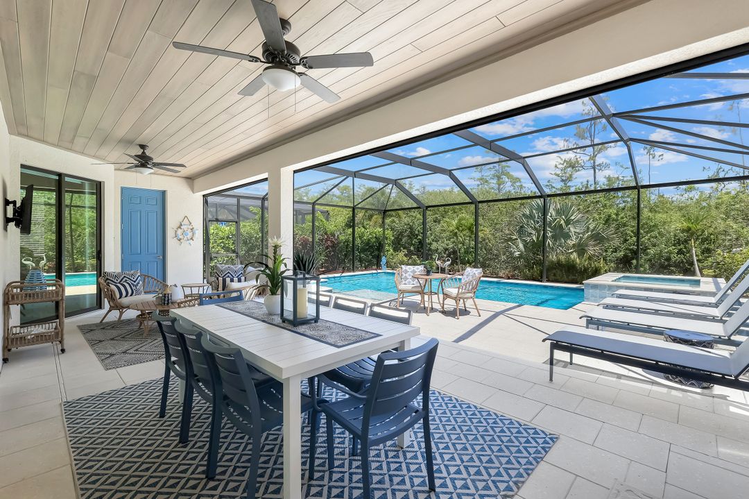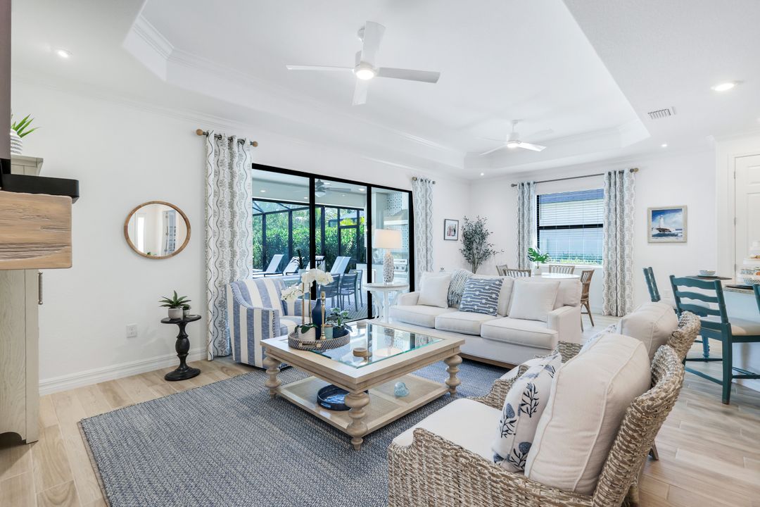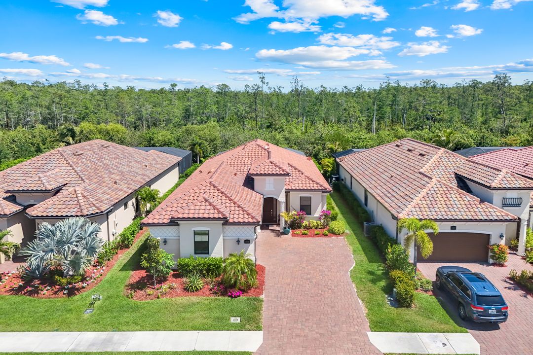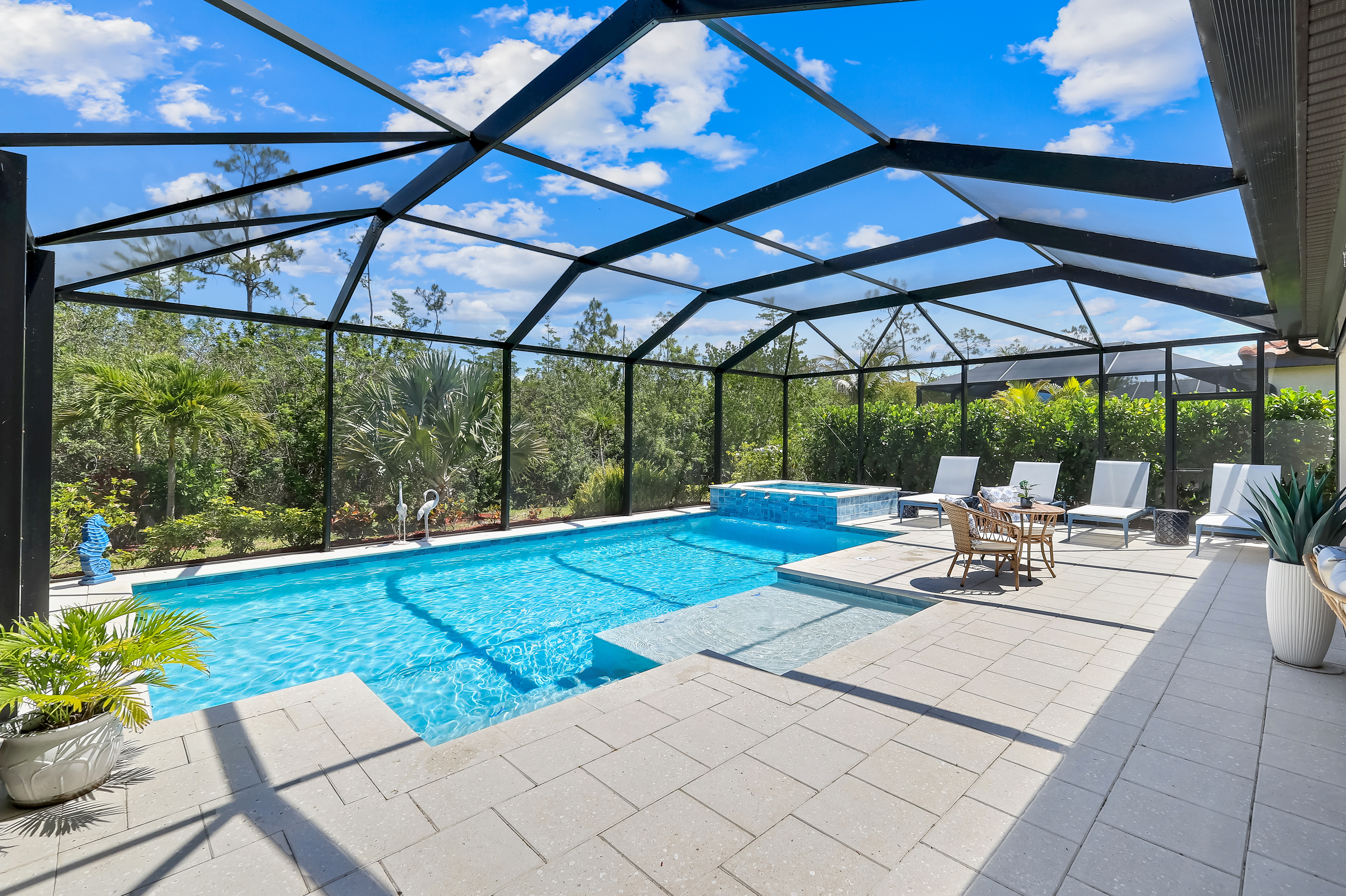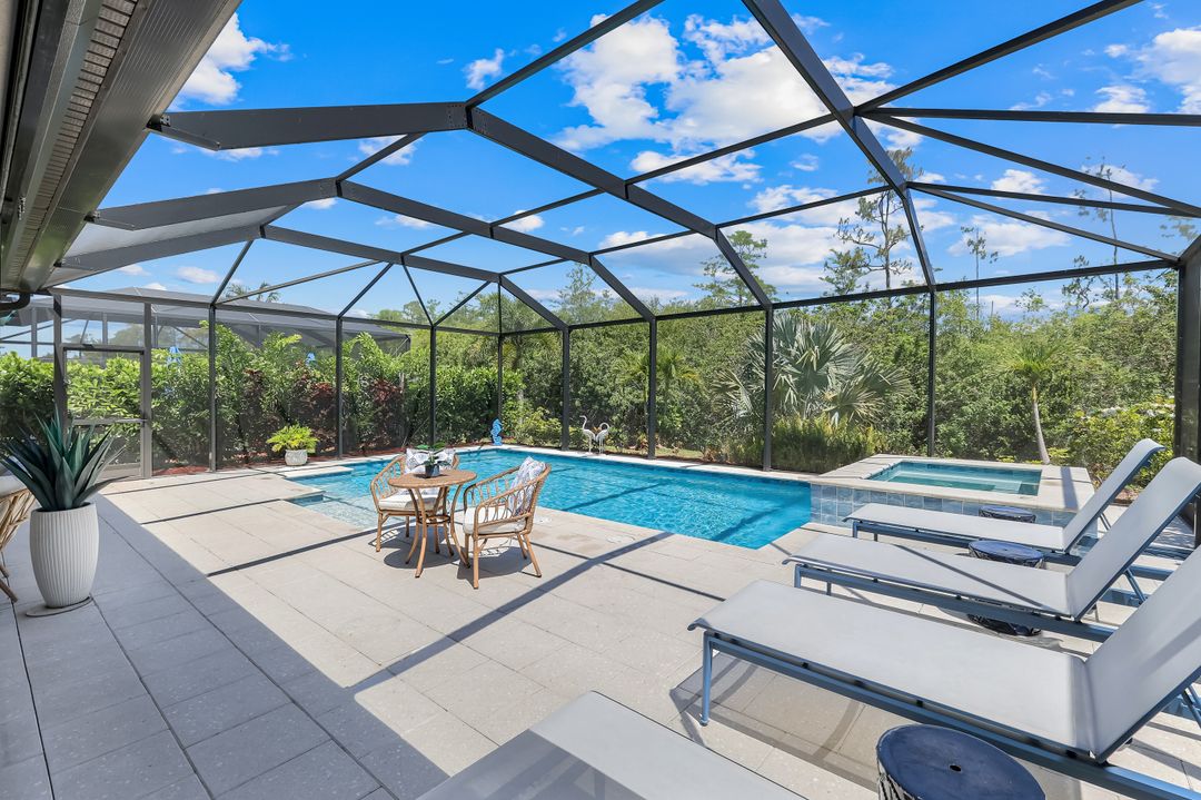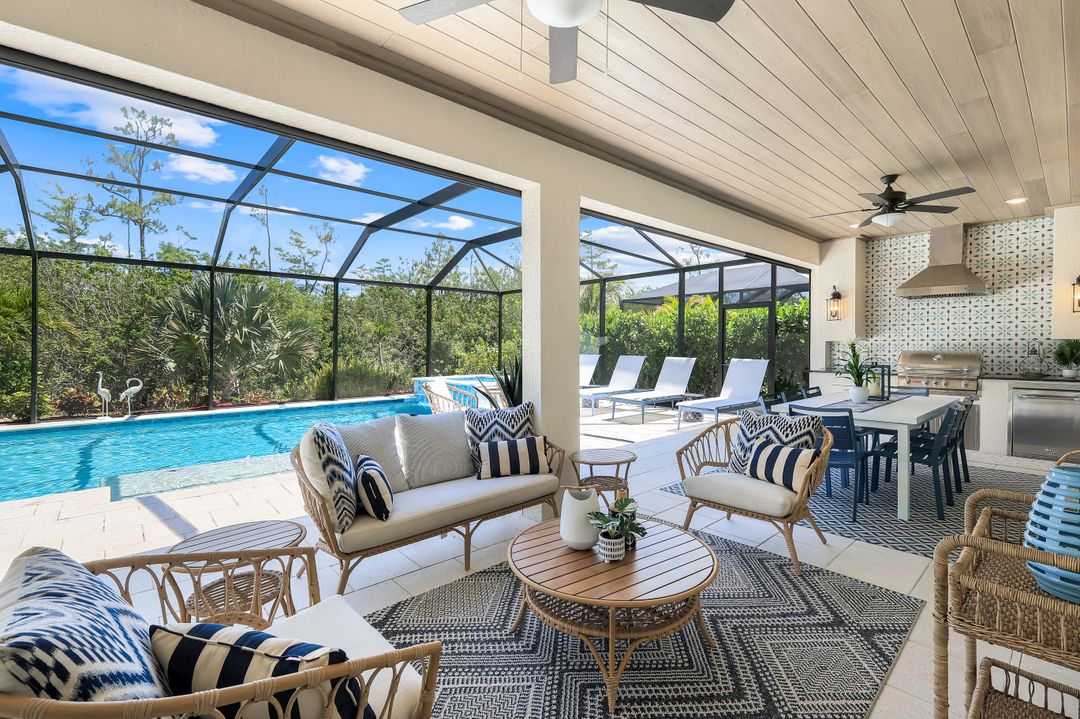 Discover the captivating, professionally decorated, and TURNKEY Victoria floor model. A stunning residence that combines elegance and functionality, situated on the serene northern edge of Bonita National. This prime location affords maximum privacy and breathtaking views of lush, wooded landscapes, creating an idyllic retreat. Inside, the home features a versatile flex space that can serve as a den, office, or guest room, providing flexibility to suit your lifestyle. The luxurious primary suite offers a tranquil haven with a spacious en-suite bathroom, while a second bedroom and an additional full bath ensure comfort for family and guests. A thoughtfully placed outdoor pool bath adds convenience to those long, sun-filled days spent by the pool. It also boasts a Storm Smart Hurricane screen for peace of mind all year round. At the heart of the home, the grand great room showcases sophisticated design elements, including a coffered ceiling that adds depth and dimension and a beautifully crafted fireplace wall that invites warmth and relaxation. The expansive island and breakfast bar create a perfect gathering spot for entertaining, whether you’re hosting a casual brunch with friends or a more formal dinner party. The seamless flow between indoor and outdoor living is effortless, thanks to sliding glass doors that lead to the extended lanai. This al fresco oasis features a stunning wood-ceilinged gathering area with an outdoor kitchen. Here, you can savor the beauty of nature while overlooking a breathtaking custom saltwater pool, complete with an integrated spa designed for ultimate relaxation and a beautiful travertine pool deck, all enclosed in a screened cage for protection against the elements. Strategically located just east of I-75, this home offers unparalleled convenience, with easy access to RSW Airport, the vibrant downtown Naples, idyllic sandy Gulf beaches, and the bustling River District in Fort Myers. Bonita National is a community rich in amenities, designed to enhance your lifestyle and provide memorable experiences for you and your guests. The impressive clubhouse beckons with various dining options, spacious game rooms, and versatile meeting spaces, along with a luxurious full-service spa that promises relaxation and rejuvenation. Fitness enthusiasts will appreciate the state-of-the-art fitness center with various exercise rooms to accommodate different workout preferences. Bocce and Pickleball will be coming to Bonita National shortly. The main pool invites you to unwind in a picturesque, lagoon-like setting with a captivating waterfall, charming poolside dining, delicious fare, and private cabanas for a touch of luxury. A dedicated lap pool is also available for those dedicated to their fitness goals, ensuring that your health and wellness journey is both enjoyable and fulfilling.