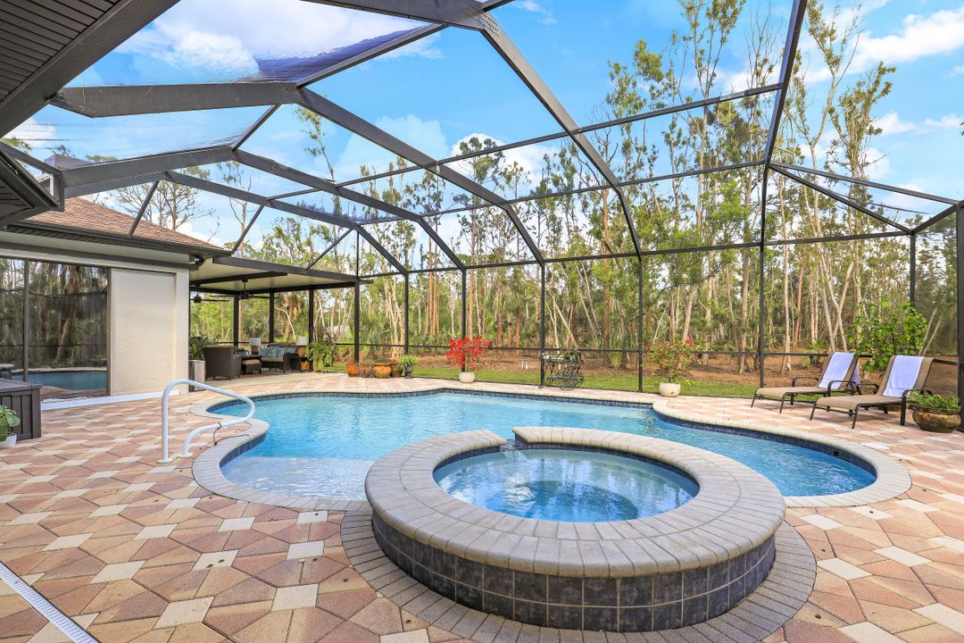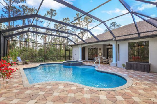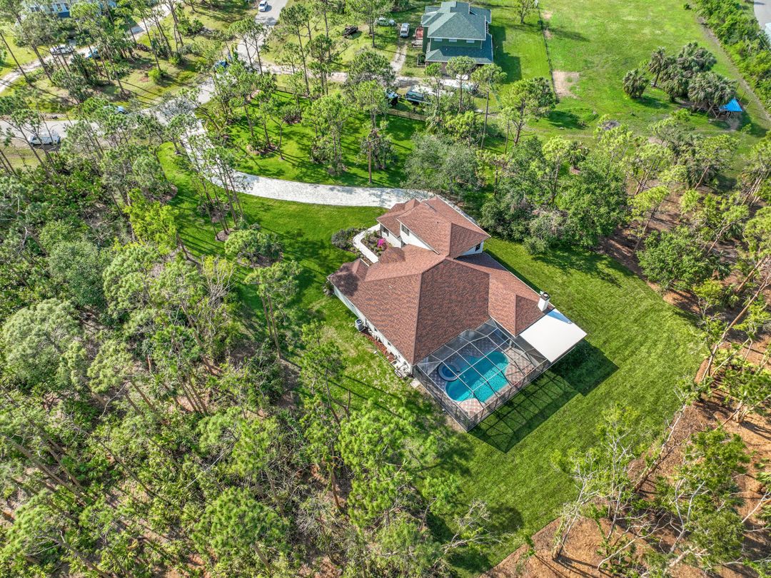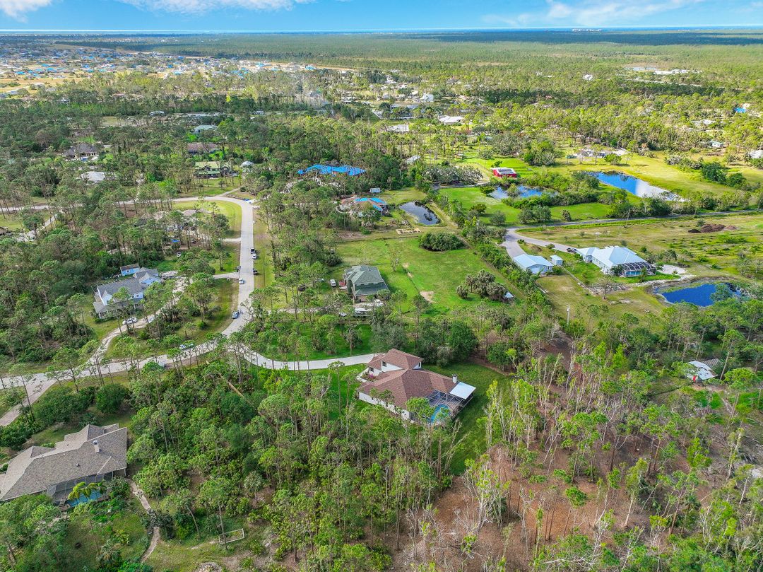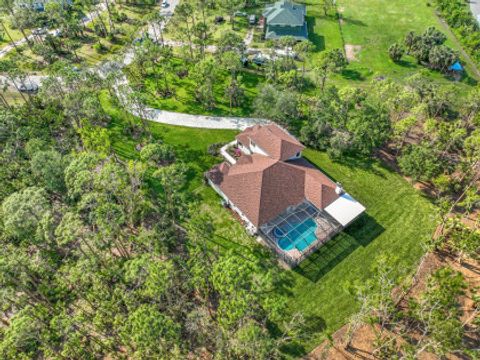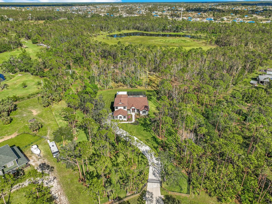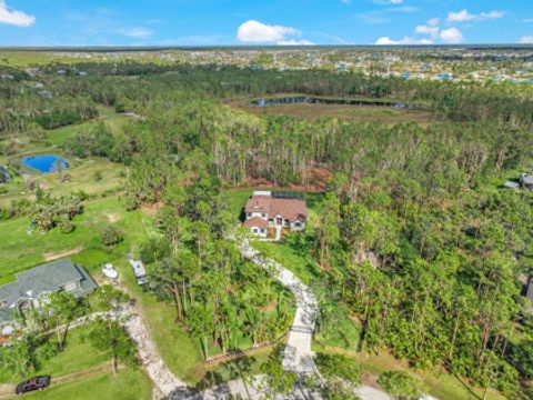 Rare find on acreage! Spacious four bedroom home with pool set among the peaceful pines of northern Cape Coral. Situated on a 2.75 acres site in Las Lomas, this home has been recently updated in a traditional motif with country accents in 2022. The large wooded lot is prudently thinned, creating a park-like feel and is large enough to accommodate future out-buildings should an owner choose.