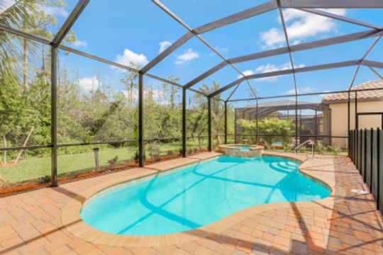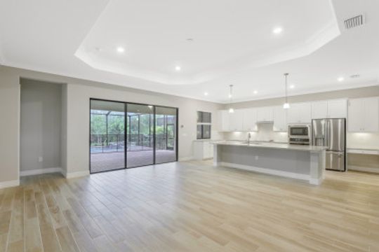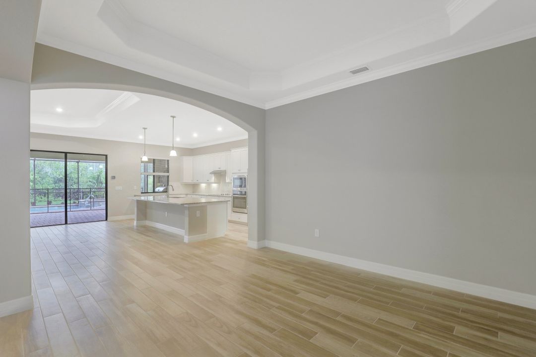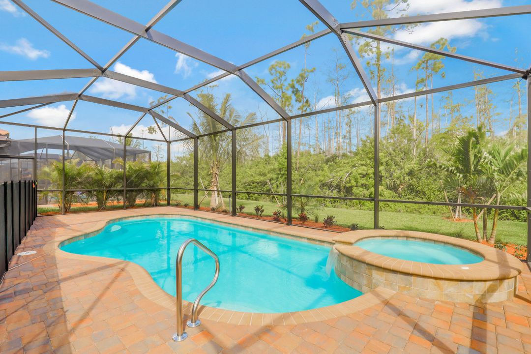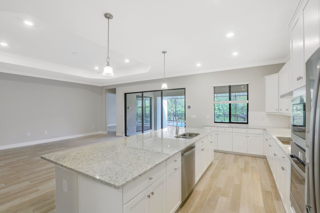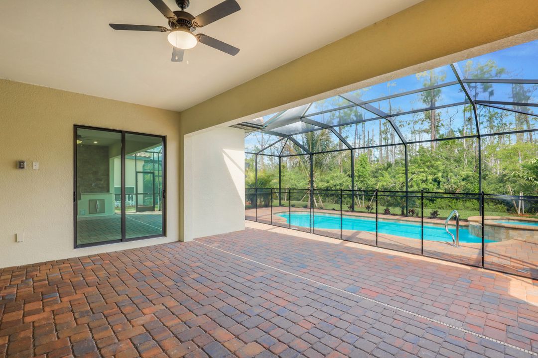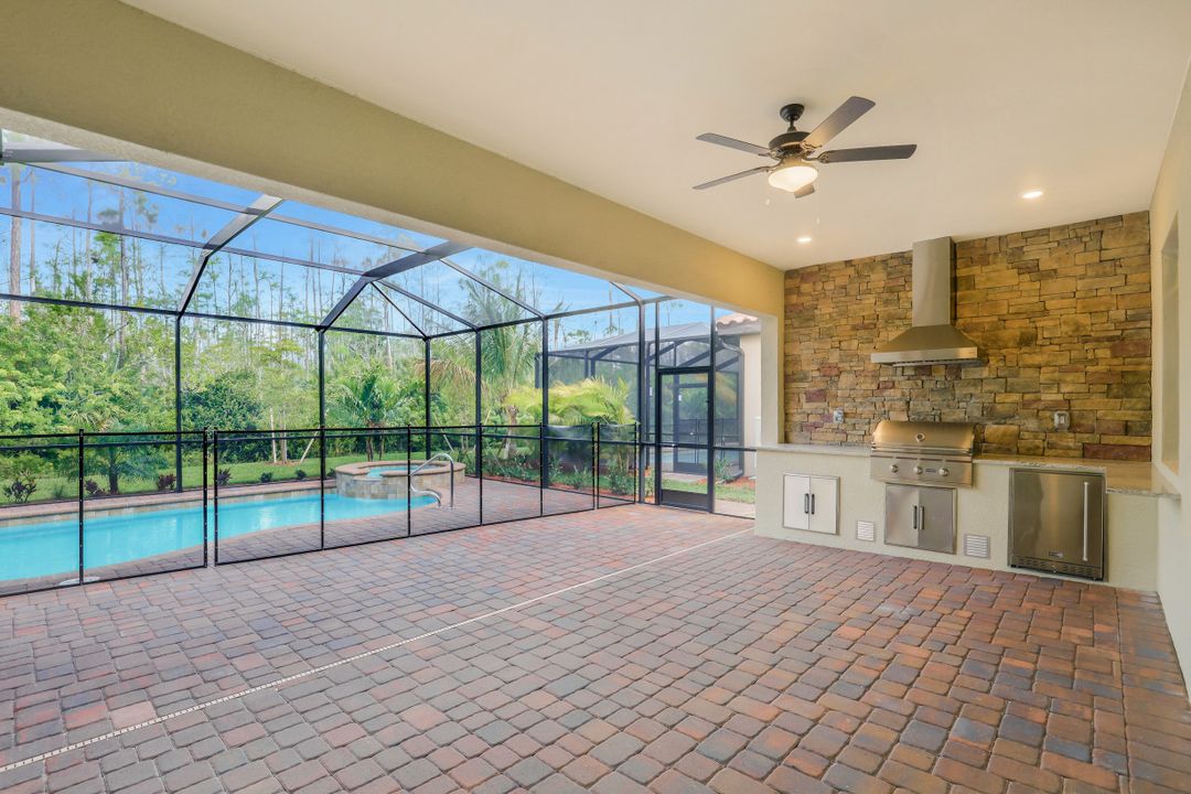 wood in den, while cabinets, pool, spa and outdoor kitchen on a private preserve lot.