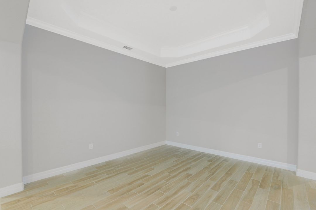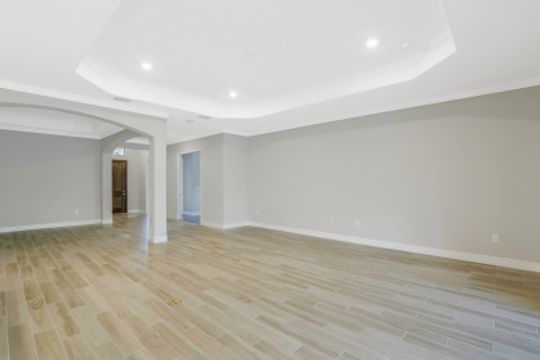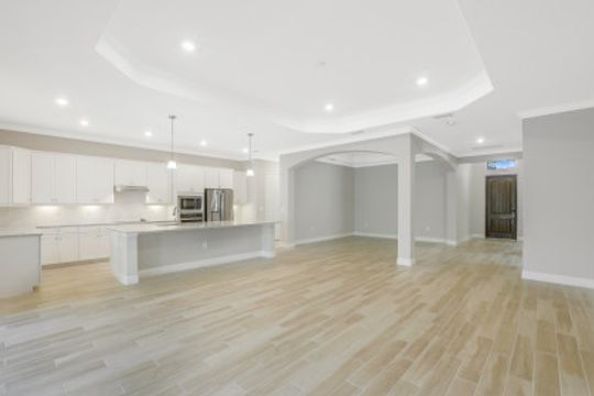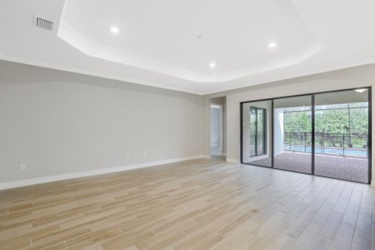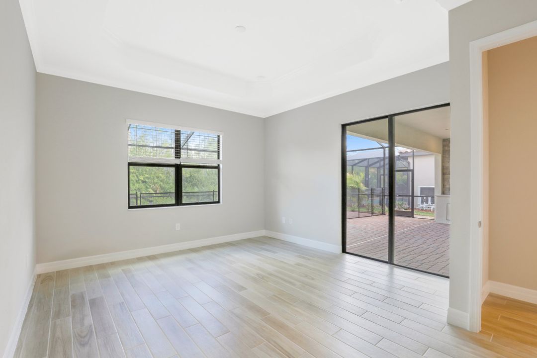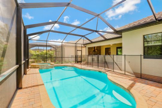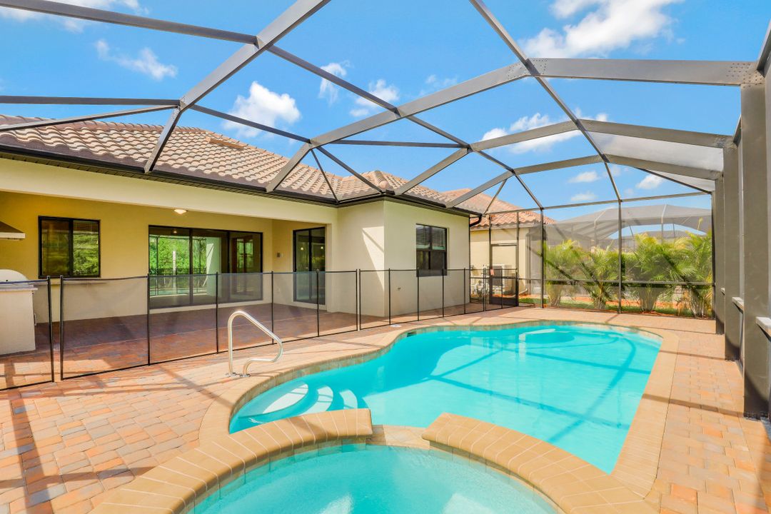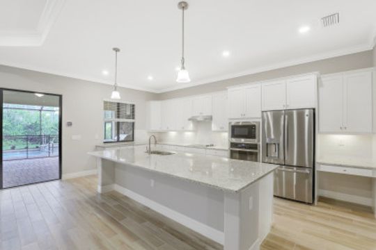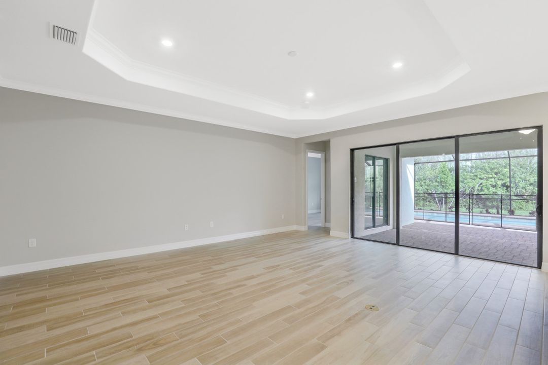 wood in den, while cabinets, pool, spa and outdoor kitchen on a private preserve lot.