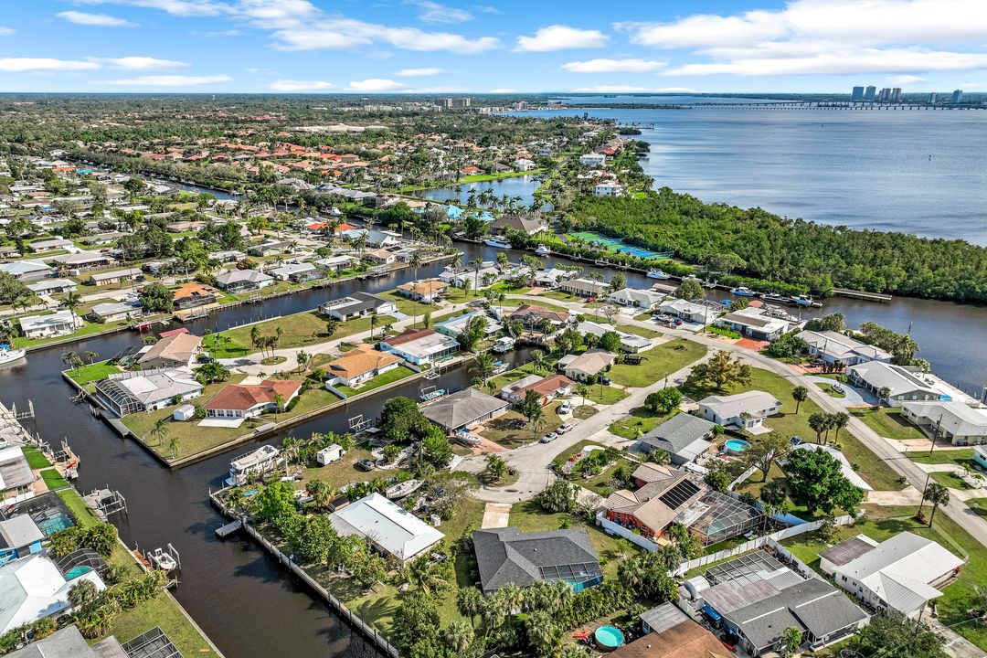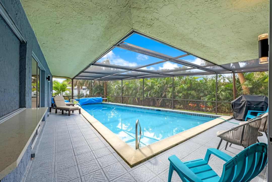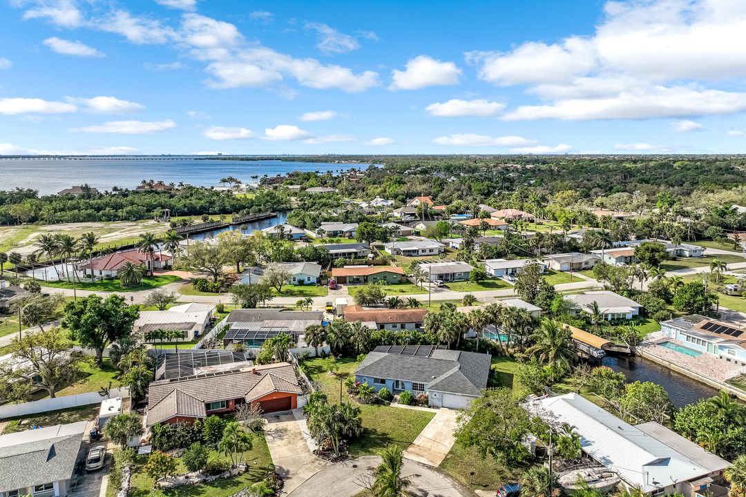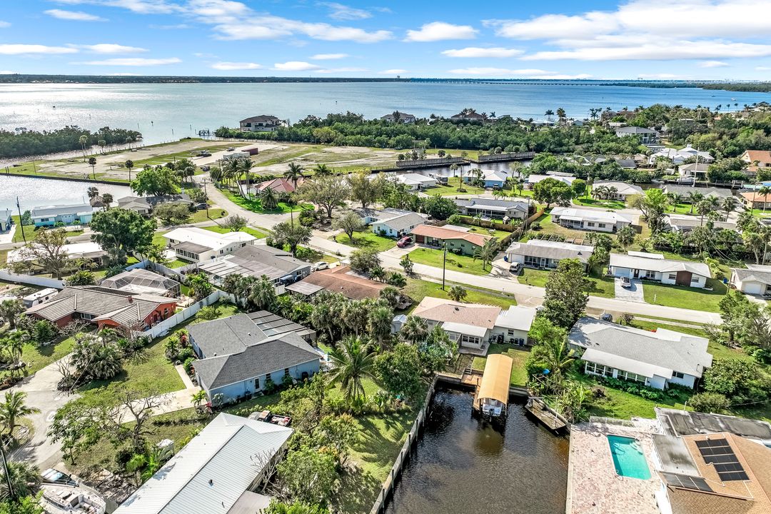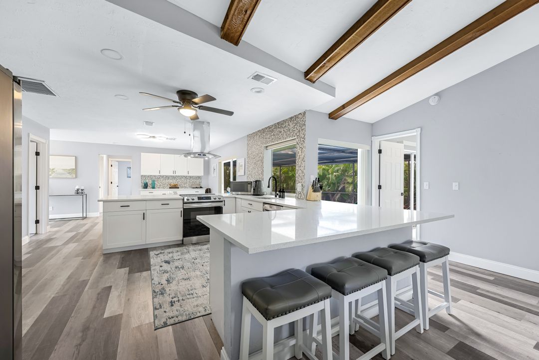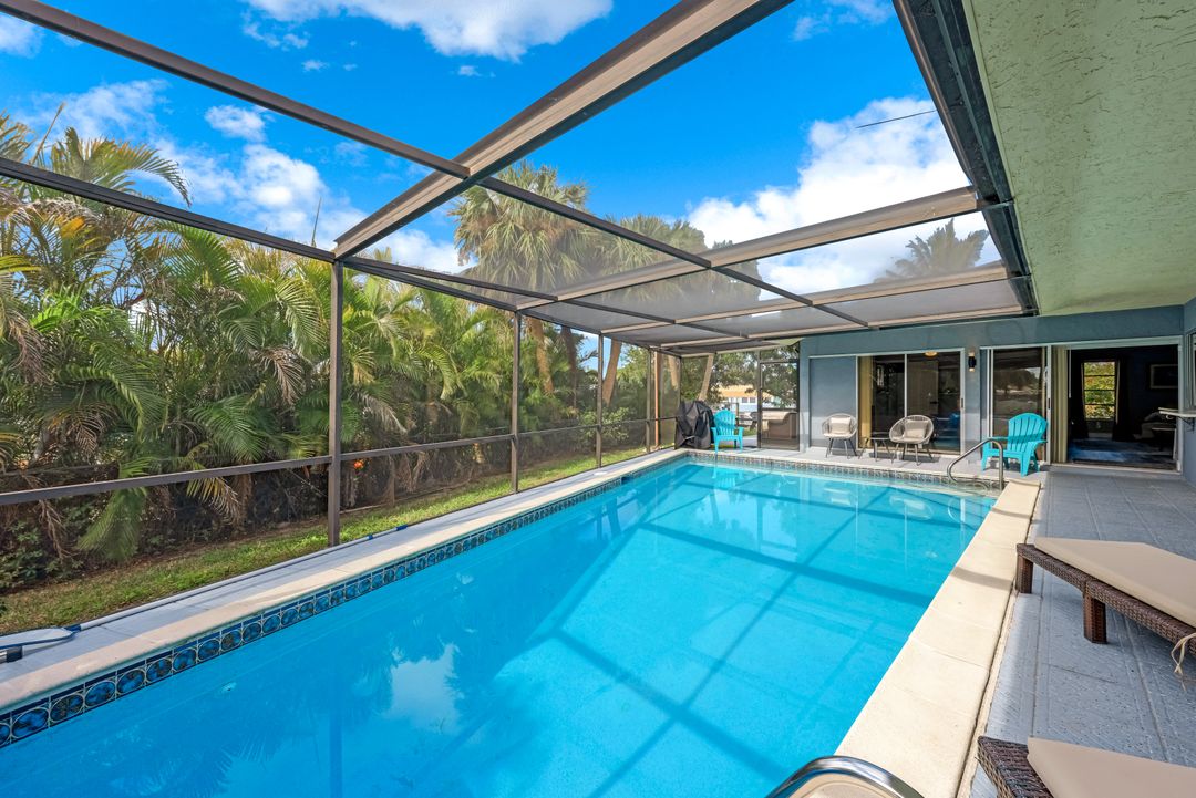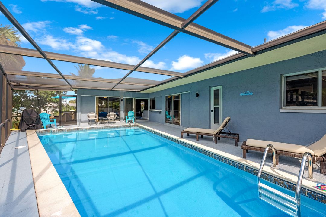 Sailboat Access Pool Home just minutes from open water! High and dry! No flooding here! This stunning 4-bedroom, 2-bathroom pool home in Waterway Estates is located on a quiet and private cul-de-sac with direct sailboat access to the Gulf in just minutes. Inside, the home features newer flooring, modern tilework, tall baseboards and casings, fresh paint, updated doors and hardware, and upgraded lighting and ceiling fans throughout. The beautifully reimagined kitchen is a chef’s dream, featuring brand-new stainless steel appliances, a sleek hood vent, quartz countertops, custom cabinetry, and a striking tiled backsplash. A dry bar in the dining area adds both charm and function, while the spacious primary suite includes a walk-in closet. The bathrooms showcase elegant tiled feature walls for a spa-like feel. The home’s wood beam ceiling adds warmth and character, and large sliding glass doors open to the screened-in pool and patio, maximizing indoor-outdoor living. With southern exposure, enjoy all-day sun on the pool deck and stunning sunsets in the evenings. The oversized pie-shaped lot provides ample space for RV or boat parking and storage, plus a lush backyard with mature fruit trees including lemon tree, avocado tree and mango tree. This home has been recently renovated with a new roof (2022), new energy efficient pool heather, PEX re-pipe, water heater, plumbing fixtures, AC system, pool equipment, epoxied garage floor, resurfaced pool deck and patio, and a fully re-screened pool cage. Conveniently located near shopping, dining, entertainment, schools, medical offices, and downtown Fort Myers, this home is a rare find with easy access by boat or car. This better-than-new home is move-in ready and waiting for you—schedule your private showing today.