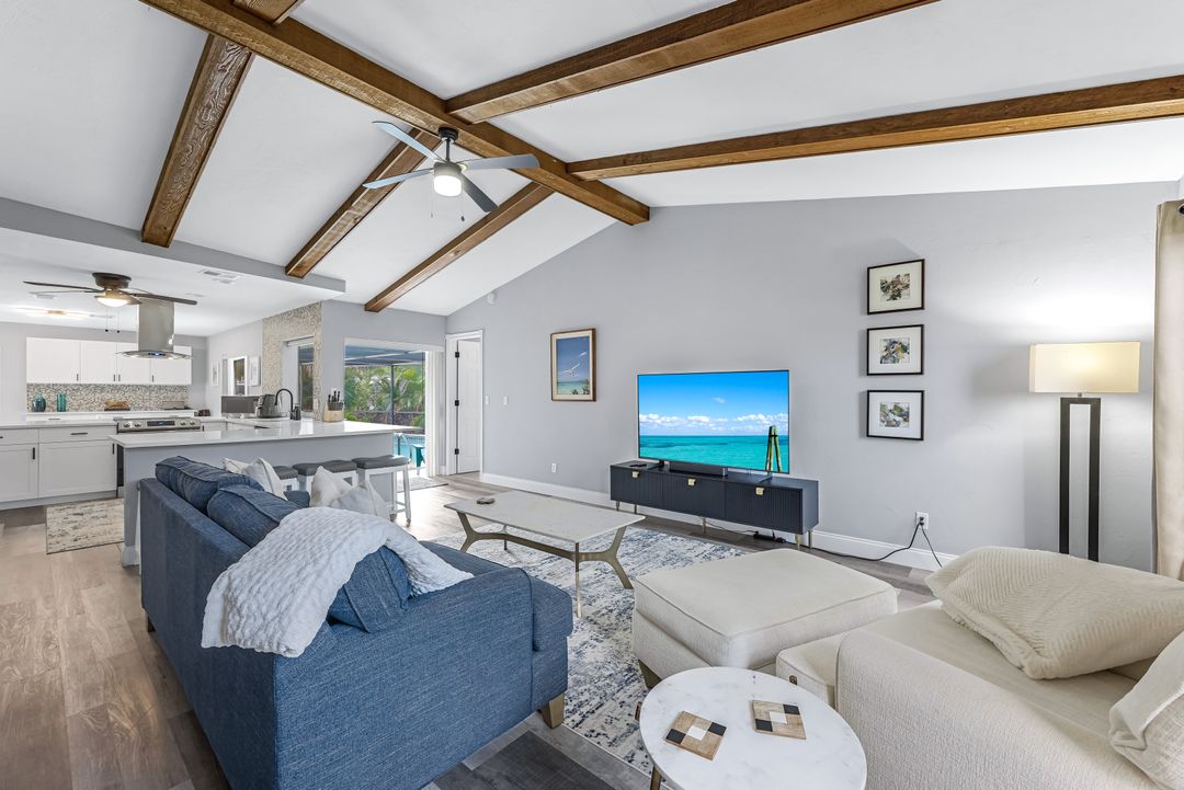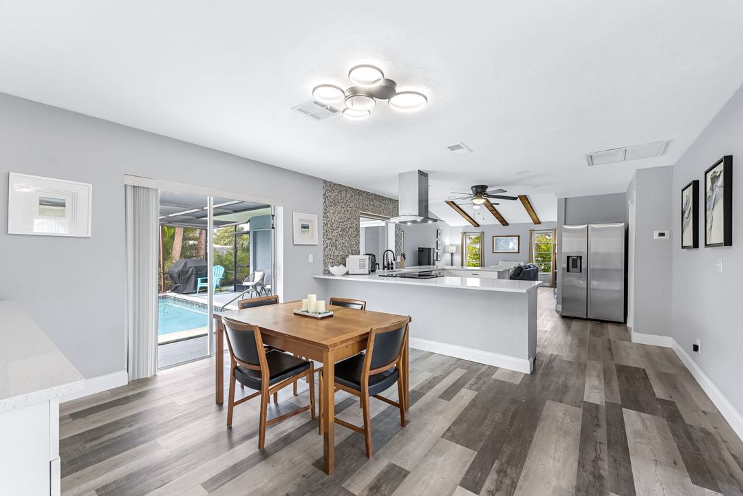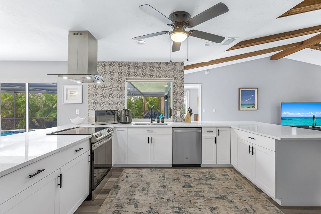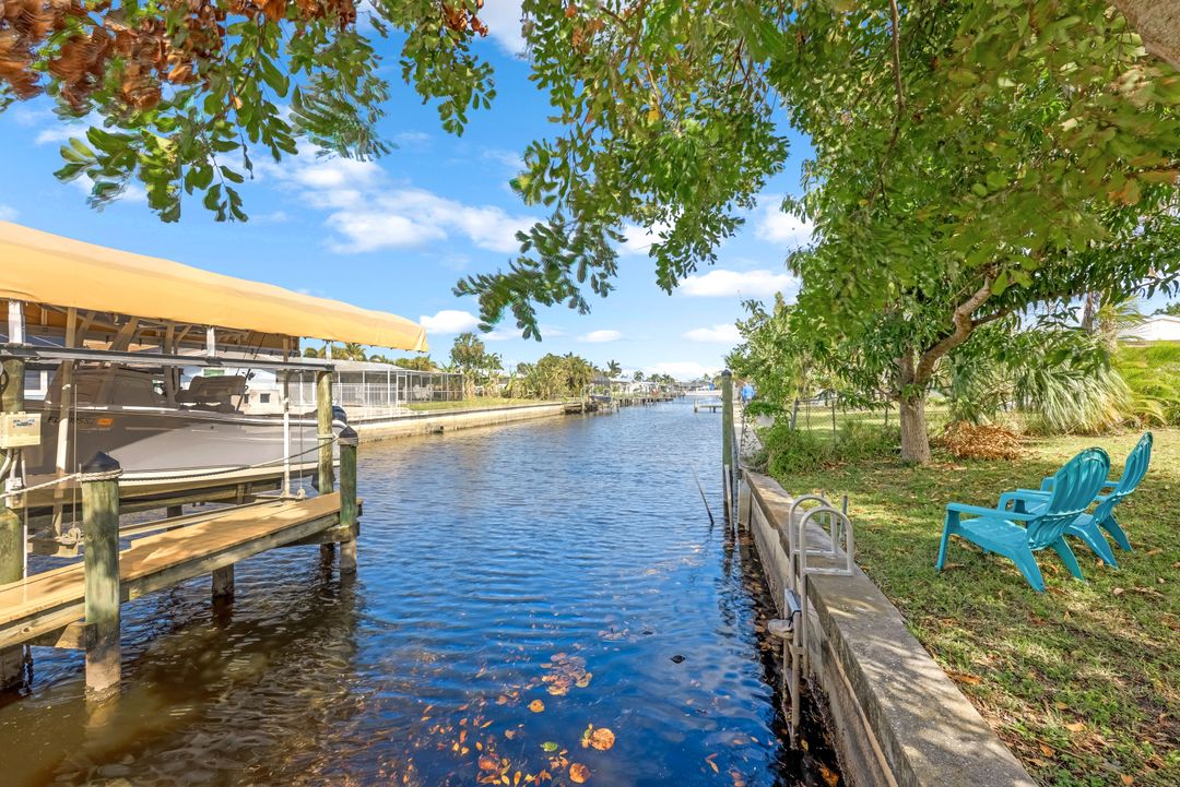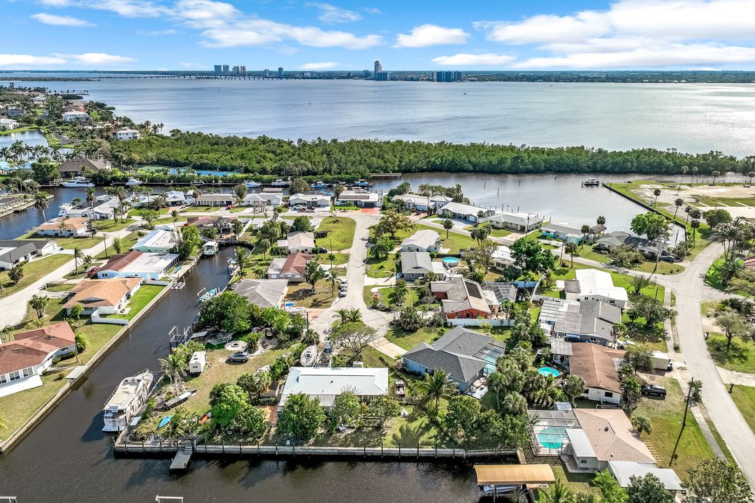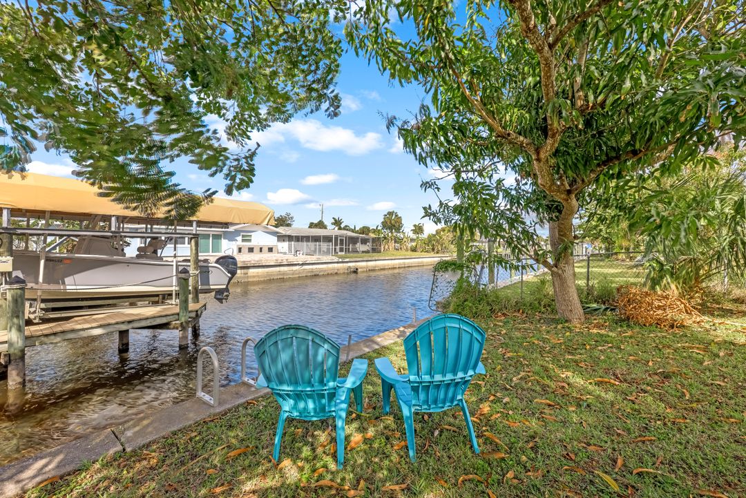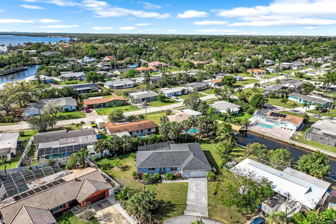 Sailboat Access Pool Home just minutes from open water! High and dry! No flooding here! This stunning 4-bedroom, 2-bathroom pool home in Waterway Estates is located on a quiet and private cul-de-sac with direct sailboat access to the Gulf in just minutes. Inside, the home features newer flooring, modern tilework, tall baseboards and casings, fresh paint, updated doors and hardware, and upgraded lighting and ceiling fans throughout. The beautifully reimagined kitchen is a chef’s dream, featuring brand-new stainless steel appliances, a sleek hood vent, quartz countertops, custom cabinetry, and a striking tiled backsplash. A dry bar in the dining area adds both charm and function, while the spacious primary suite includes a walk-in closet. The bathrooms showcase elegant tiled feature walls for a spa-like feel. The home’s wood beam ceiling adds warmth and character, and large sliding glass doors open to the screened-in pool and patio, maximizing indoor-outdoor living. With southern exposure, enjoy all-day sun on the pool deck and stunning sunsets in the evenings. The oversized pie-shaped lot provides ample space for RV or boat parking and storage, plus a lush backyard with mature fruit trees including lemon tree, avocado tree and mango tree. This home has been recently renovated with a new roof (2022), new energy efficient pool heather, PEX re-pipe, water heater, plumbing fixtures, AC system, pool equipment, epoxied garage floor, resurfaced pool deck and patio, and a fully re-screened pool cage. Conveniently located near shopping, dining, entertainment, schools, medical offices, and downtown Fort Myers, this home is a rare find with easy access by boat or car. This better-than-new home is move-in ready and waiting for you—schedule your private showing today.