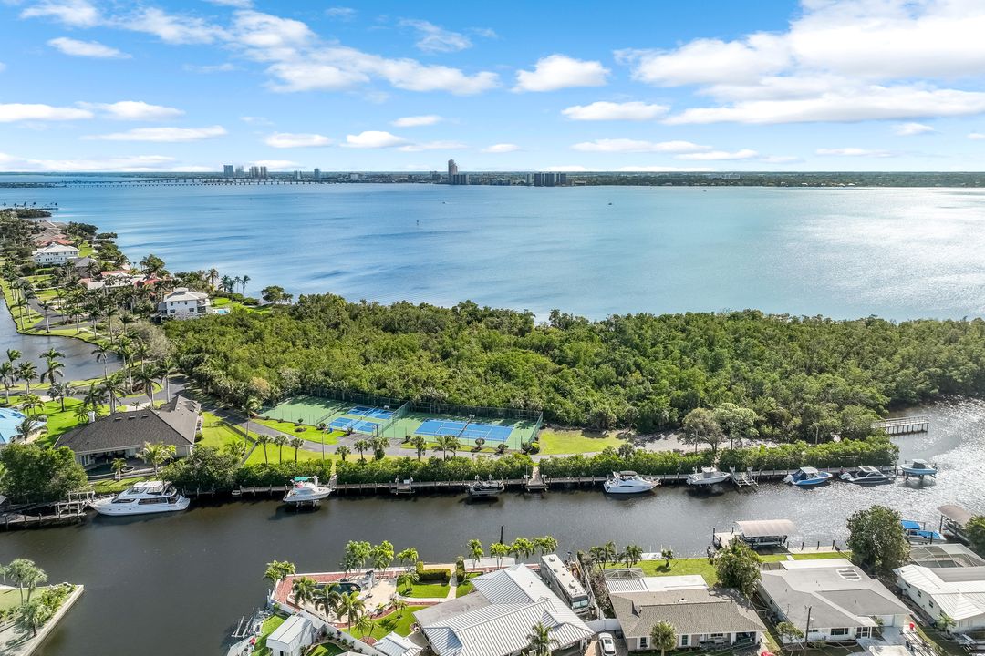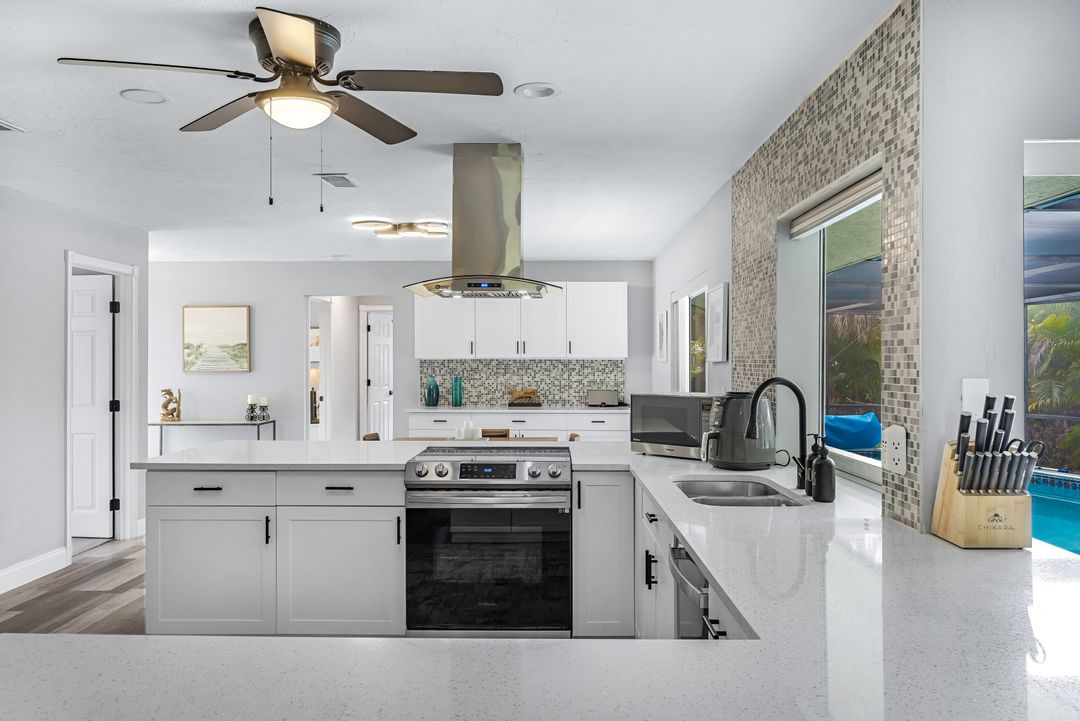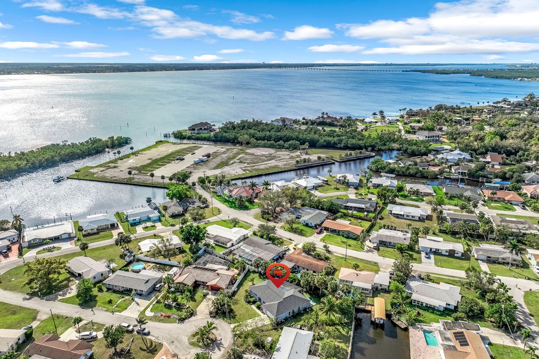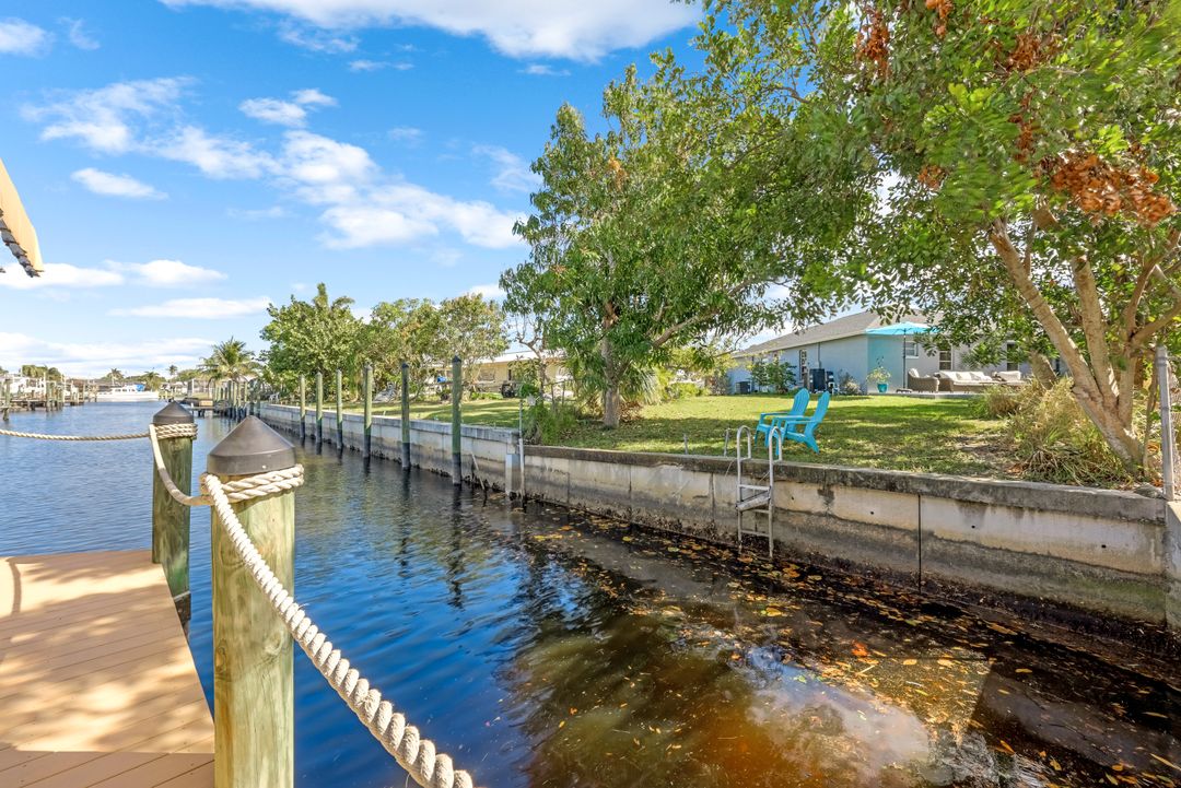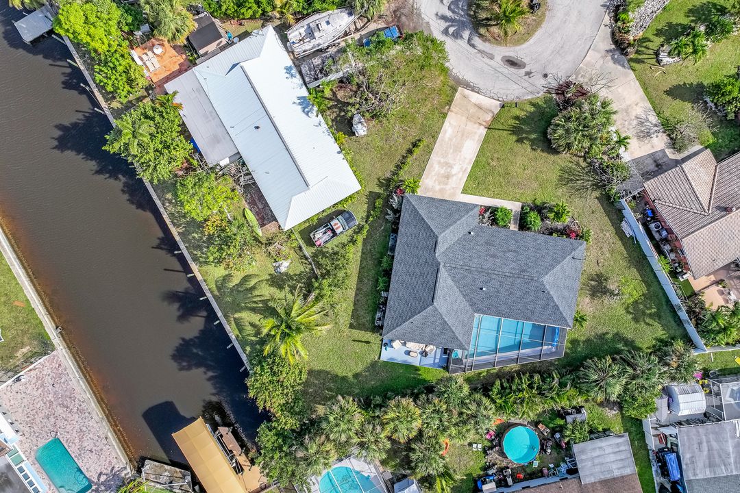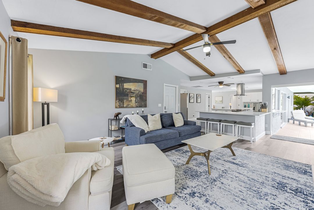 Sailboat Access Pool Home just minutes from open water! High and dry! No flooding here! This stunning 4-bedroom, 2-bathroom pool home in Waterway Estates is located on a quiet and private cul-de-sac with direct sailboat access to the Gulf in just minutes. Inside, the home features newer flooring, modern tilework, tall baseboards and casings, fresh paint, updated doors and hardware, and upgraded lighting and ceiling fans throughout. The beautifully reimagined kitchen is a chef’s dream, featuring brand-new stainless steel appliances, a sleek hood vent, quartz countertops, custom cabinetry, and a striking tiled backsplash. A dry bar in the dining area adds both charm and function, while the spacious primary suite includes a walk-in closet. The bathrooms showcase elegant tiled feature walls for a spa-like feel. The home’s wood beam ceiling adds warmth and character, and large sliding glass doors open to the screened-in pool and patio, maximizing indoor-outdoor living. With southern exposure, enjoy all-day sun on the pool deck and stunning sunsets in the evenings. The oversized pie-shaped lot provides ample space for RV or boat parking and storage, plus a lush backyard with mature fruit trees including lemon tree, avocado tree and mango tree. This home has been recently renovated with a new roof (2022), new energy efficient pool heather, PEX re-pipe, water heater, plumbing fixtures, AC system, pool equipment, epoxied garage floor, resurfaced pool deck and patio, and a fully re-screened pool cage. Conveniently located near shopping, dining, entertainment, schools, medical offices, and downtown Fort Myers, this home is a rare find with easy access by boat or car. This better-than-new home is move-in ready and waiting for you—schedule your private showing today.