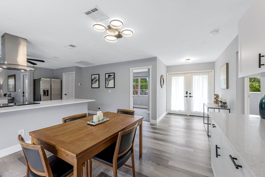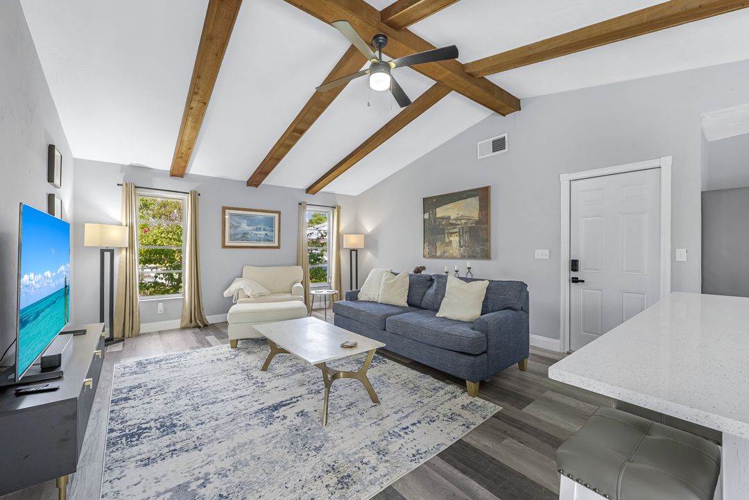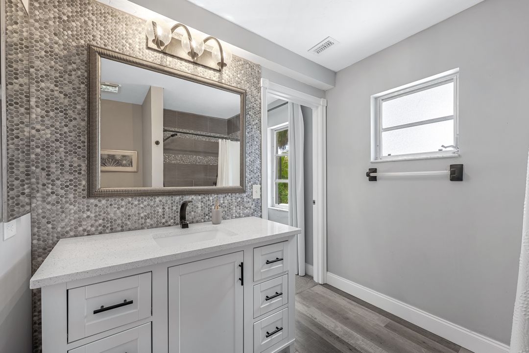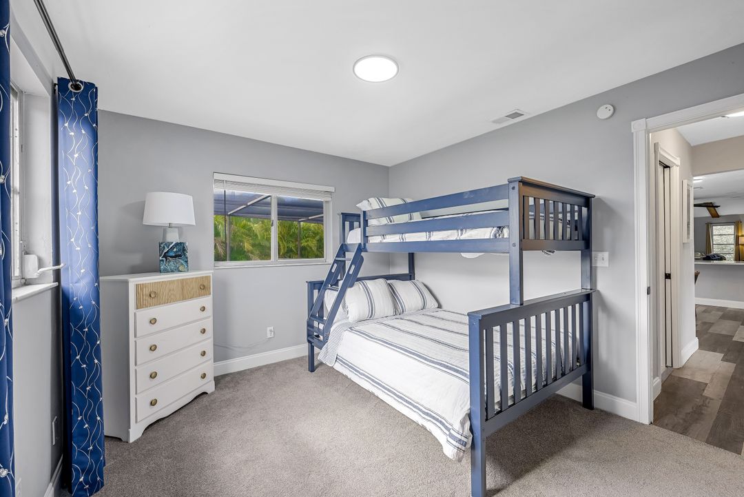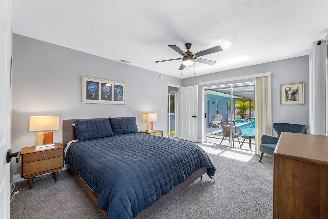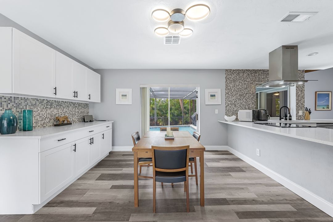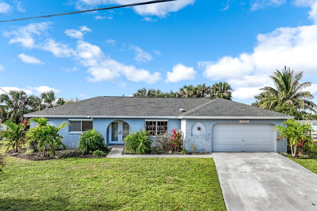 Sailboat Access Pool Home just minutes from open water! High and dry! No flooding here! This stunning 4-bedroom, 2-bathroom pool home in Waterway Estates is located on a quiet and private cul-de-sac with direct sailboat access to the Gulf in just minutes. Inside, the home features newer flooring, modern tilework, tall baseboards and casings, fresh paint, updated doors and hardware, and upgraded lighting and ceiling fans throughout. The beautifully reimagined kitchen is a chef’s dream, featuring brand-new stainless steel appliances, a sleek hood vent, quartz countertops, custom cabinetry, and a striking tiled backsplash. A dry bar in the dining area adds both charm and function, while the spacious primary suite includes a walk-in closet. The bathrooms showcase elegant tiled feature walls for a spa-like feel. The home’s wood beam ceiling adds warmth and character, and large sliding glass doors open to the screened-in pool and patio, maximizing indoor-outdoor living. With southern exposure, enjoy all-day sun on the pool deck and stunning sunsets in the evenings. The oversized pie-shaped lot provides ample space for RV or boat parking and storage, plus a lush backyard with mature fruit trees including lemon tree, avocado tree and mango tree. This home has been recently renovated with a new roof (2022), new energy efficient pool heather, PEX re-pipe, water heater, plumbing fixtures, AC system, pool equipment, epoxied garage floor, resurfaced pool deck and patio, and a fully re-screened pool cage. Conveniently located near shopping, dining, entertainment, schools, medical offices, and downtown Fort Myers, this home is a rare find with easy access by boat or car. This better-than-new home is move-in ready and waiting for you—schedule your private showing today.