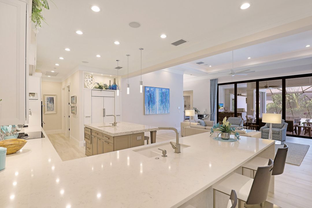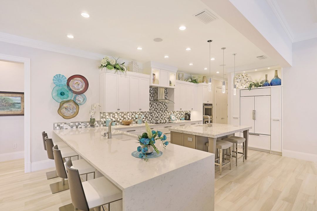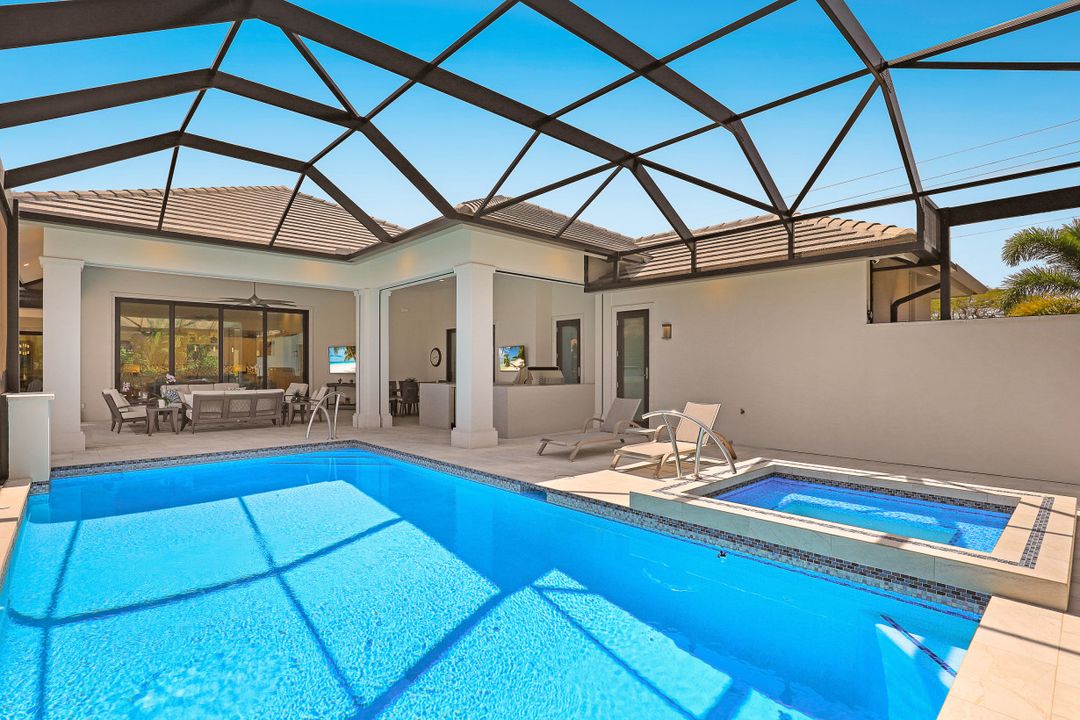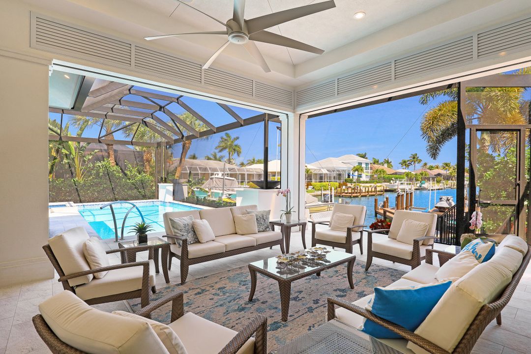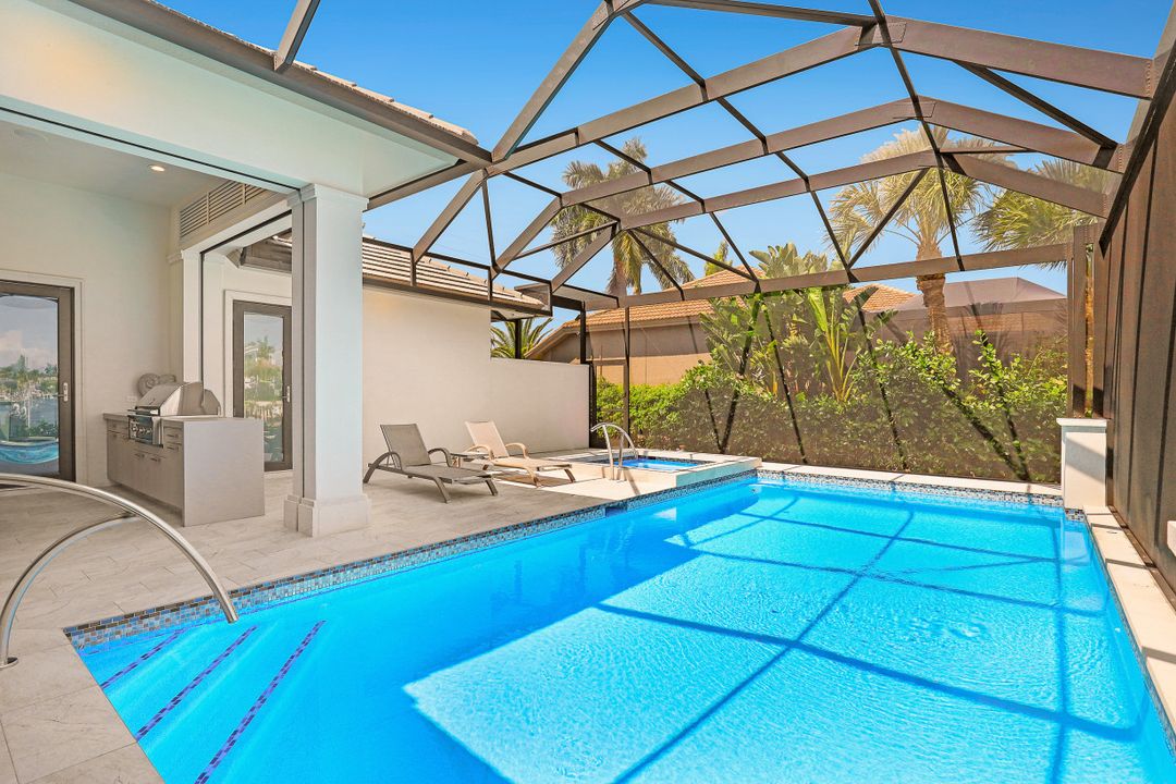 Gorgeous contemporary home located on an over-sized corner lot with water direct access to the Marco River. This luxurious, furnished home has it all with gorgeous décor and exquisite lavish details throughout. Light and bright open floor plan with spacious great room design and separate office that include beautiful built-ins. A chef’s dream gourmet kitchen with custom cabinetry, over-the-top appliances, pantry, two breakfast bars and separate dining area. Whole-house automation, Crestron lighting control system, tray ceilings, designer tile, baths, counter-tops, fixtures and top-quality finishes. The sweeping veranda is outdoor living at its finest and has everything you need with a pool, spa, bar, summer kitchen, drop-down shutters/screens and plenty of space to entertain and enjoy the long water canal views. Impact-resistant glass windows and doors, whole-house generator, paved driveway and sidewalk that encircles the home for easy walking. Extended parking for additional vehicles and a side-entry garage. Deeded dock with a lift that includes your own sundeck. New seawall 2016. Surrounded by lush tropical landscaping. Make this home your piece of paradise today.